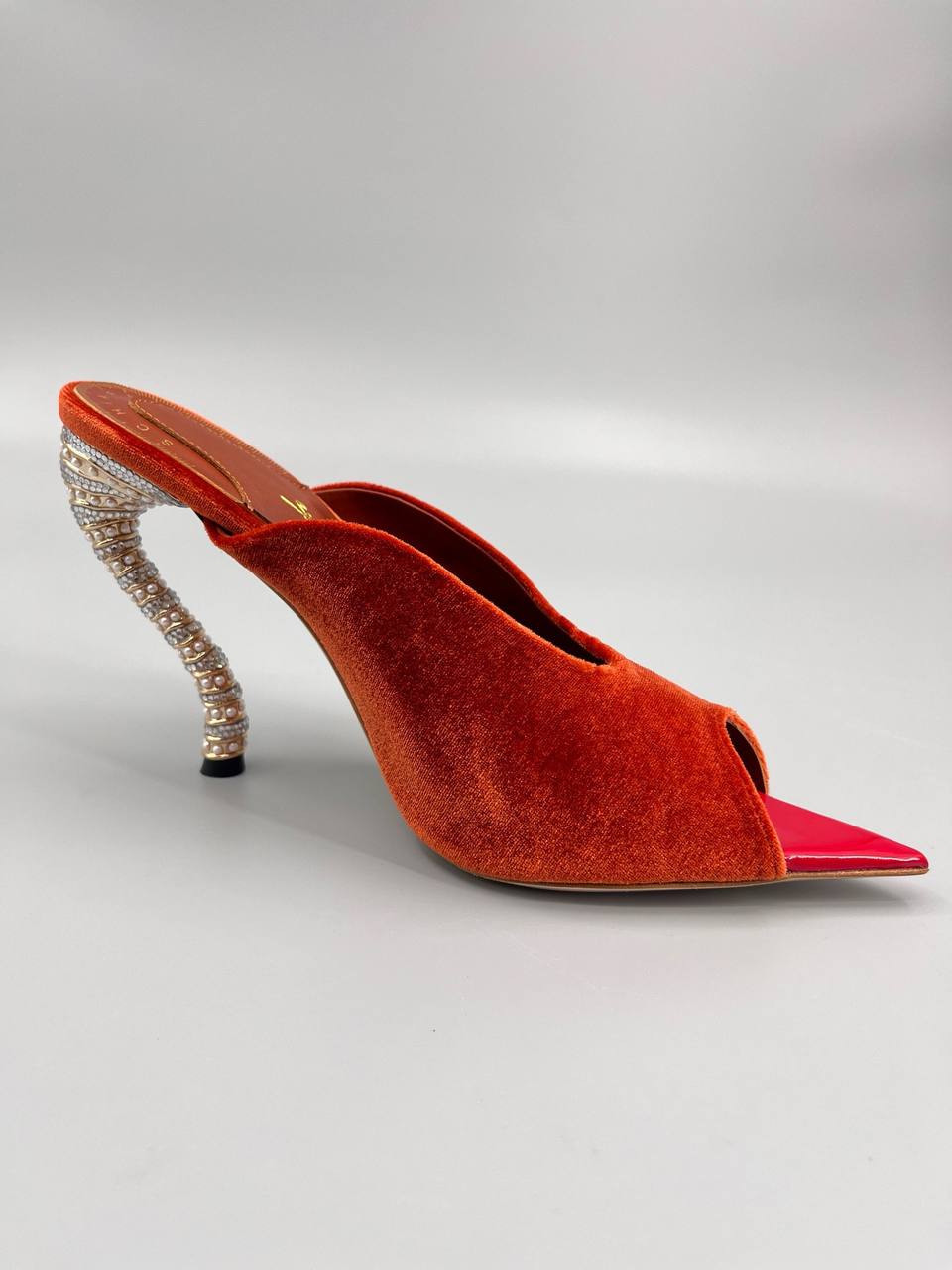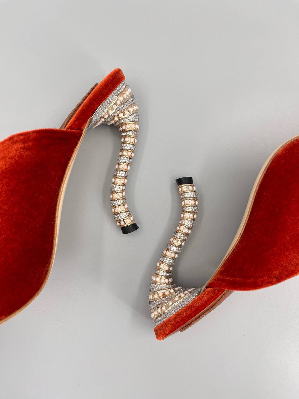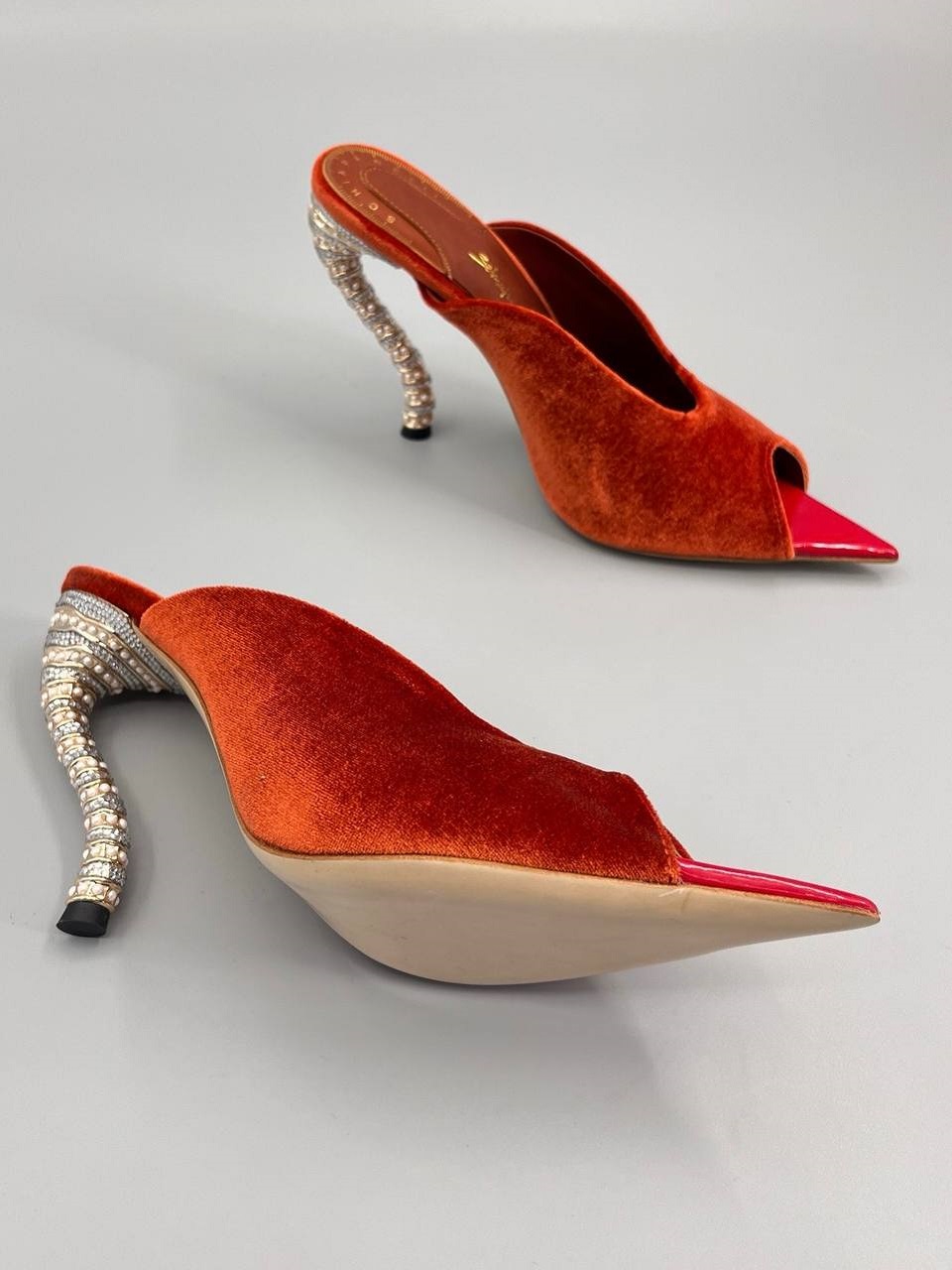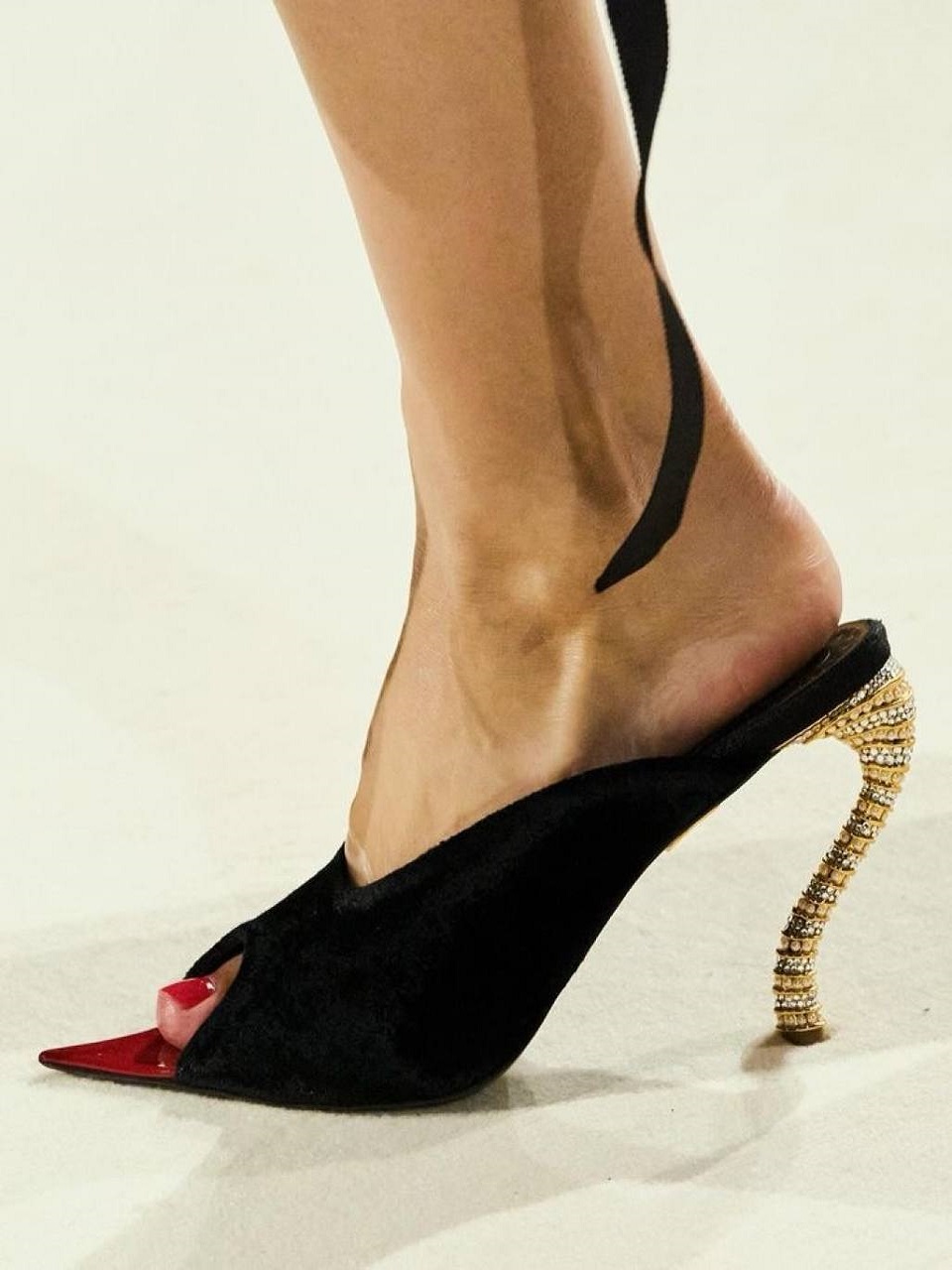 Мюли Schiaparelli отражают минимализм 90-х, но не без собственного шика и неожиданной изюминки. Они сделаны из кожи и замши, имеют острые носки и каблуки в стразах.