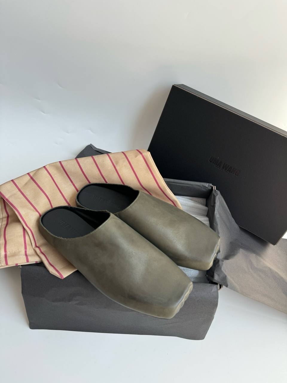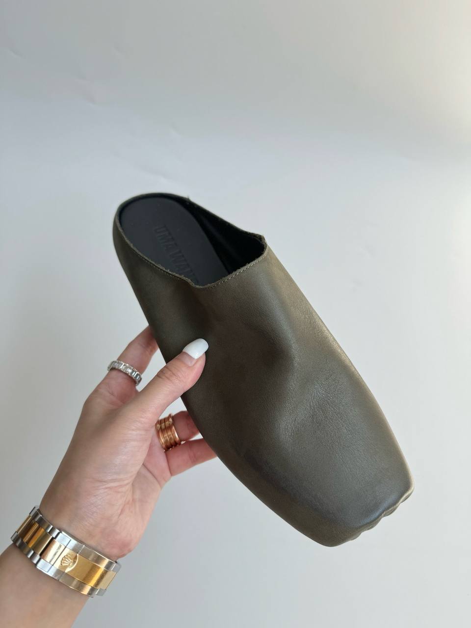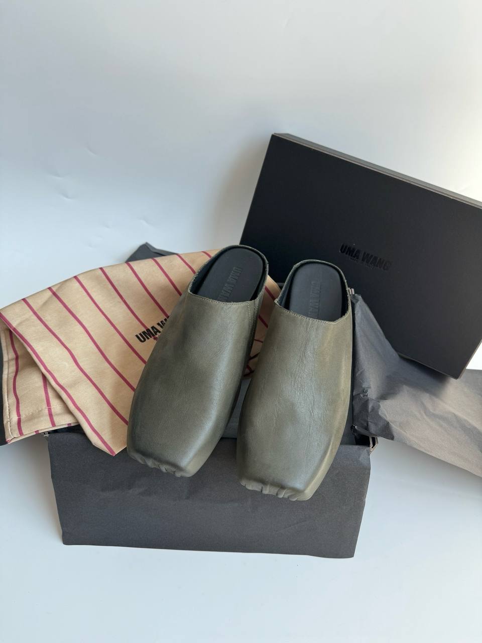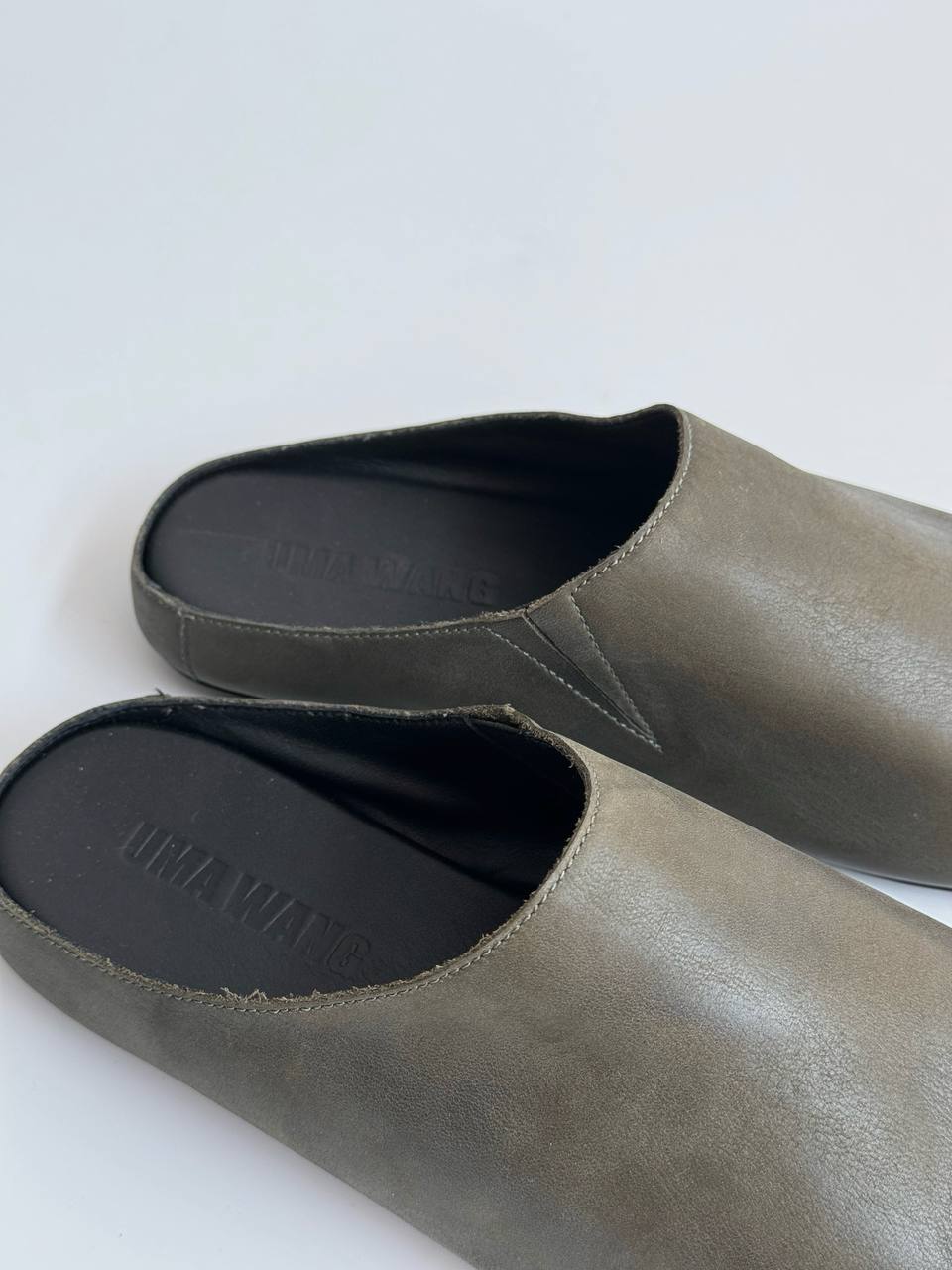 Мюли Uma Wang сделаны из натуральной кожи. Данная модель с закрытым квадратным носком. Купить мюли Uma Wang можно в двух цветах: хаки, черный.