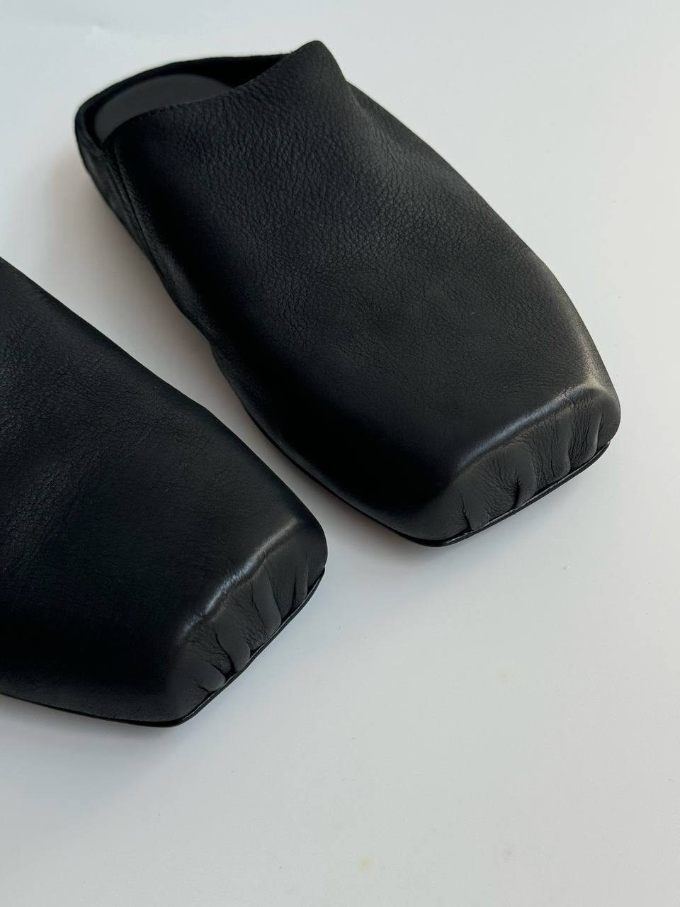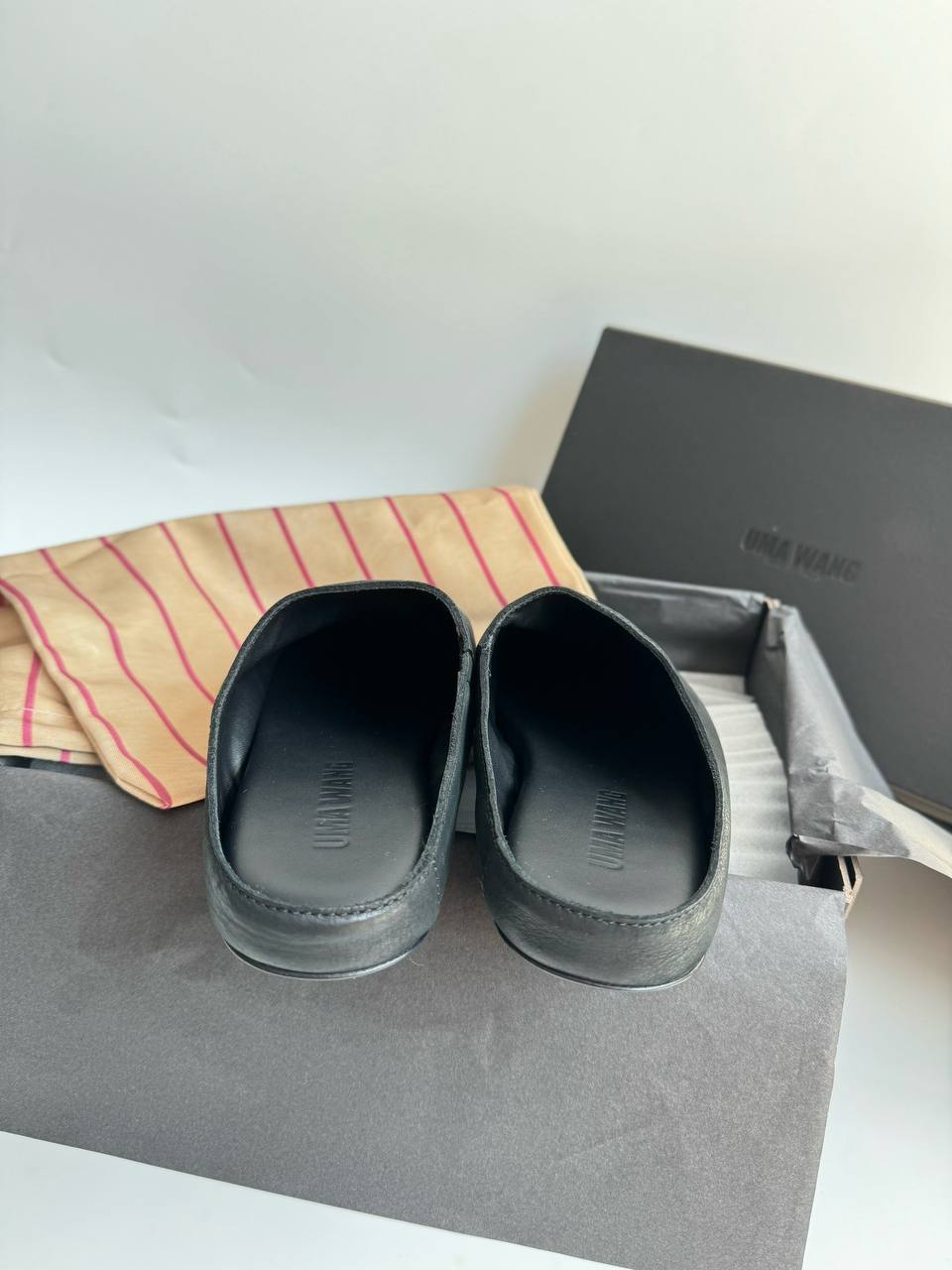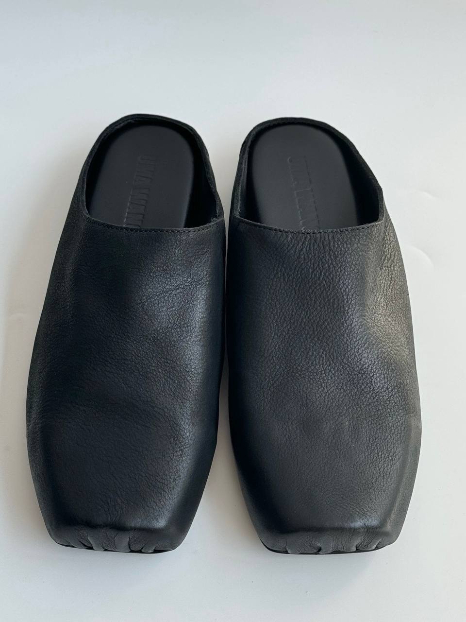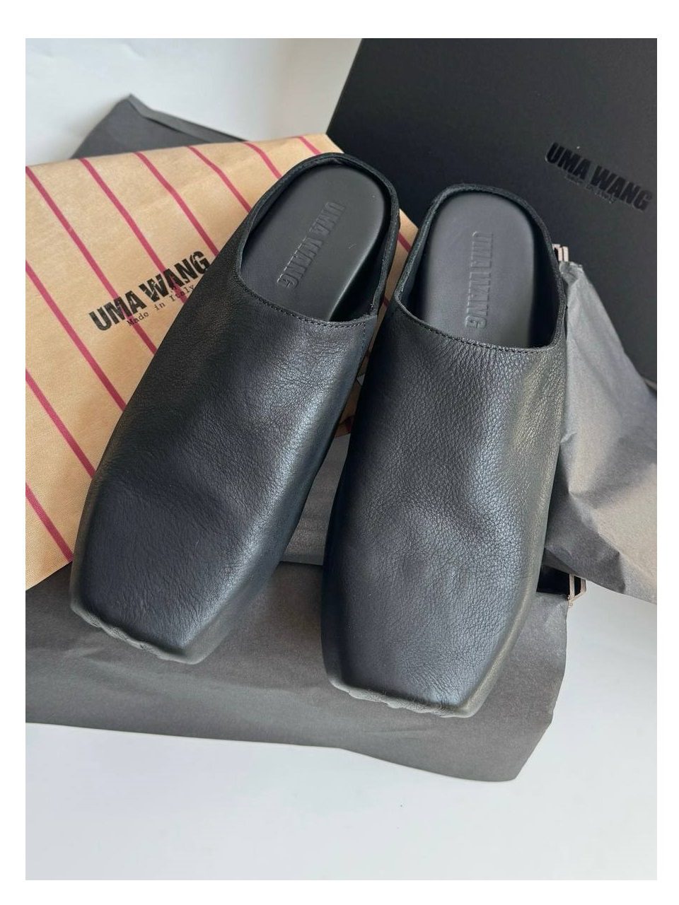 Мюли Uma Wang сделаны из натуральной кожи. Данная модель с закрытым квадратным носком. Купить мюли Uma Wang можно в двух цветах: хаки, черный.