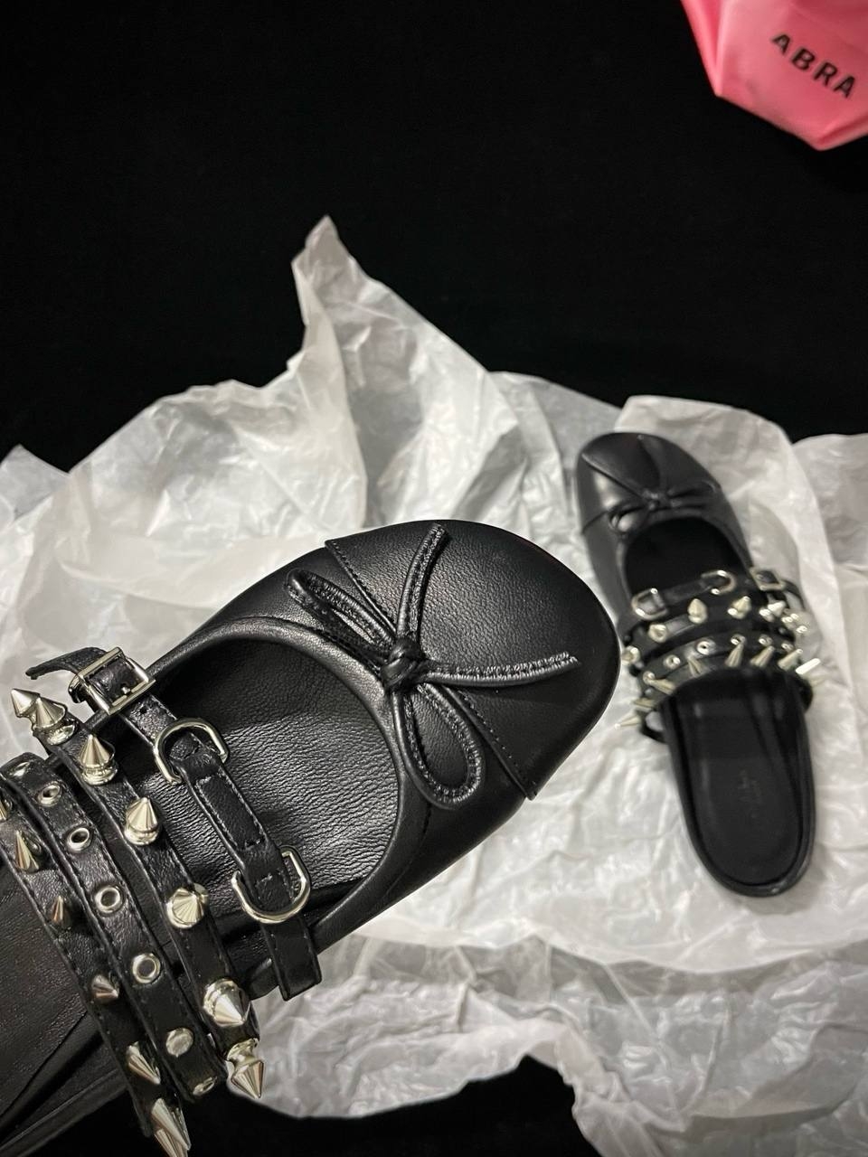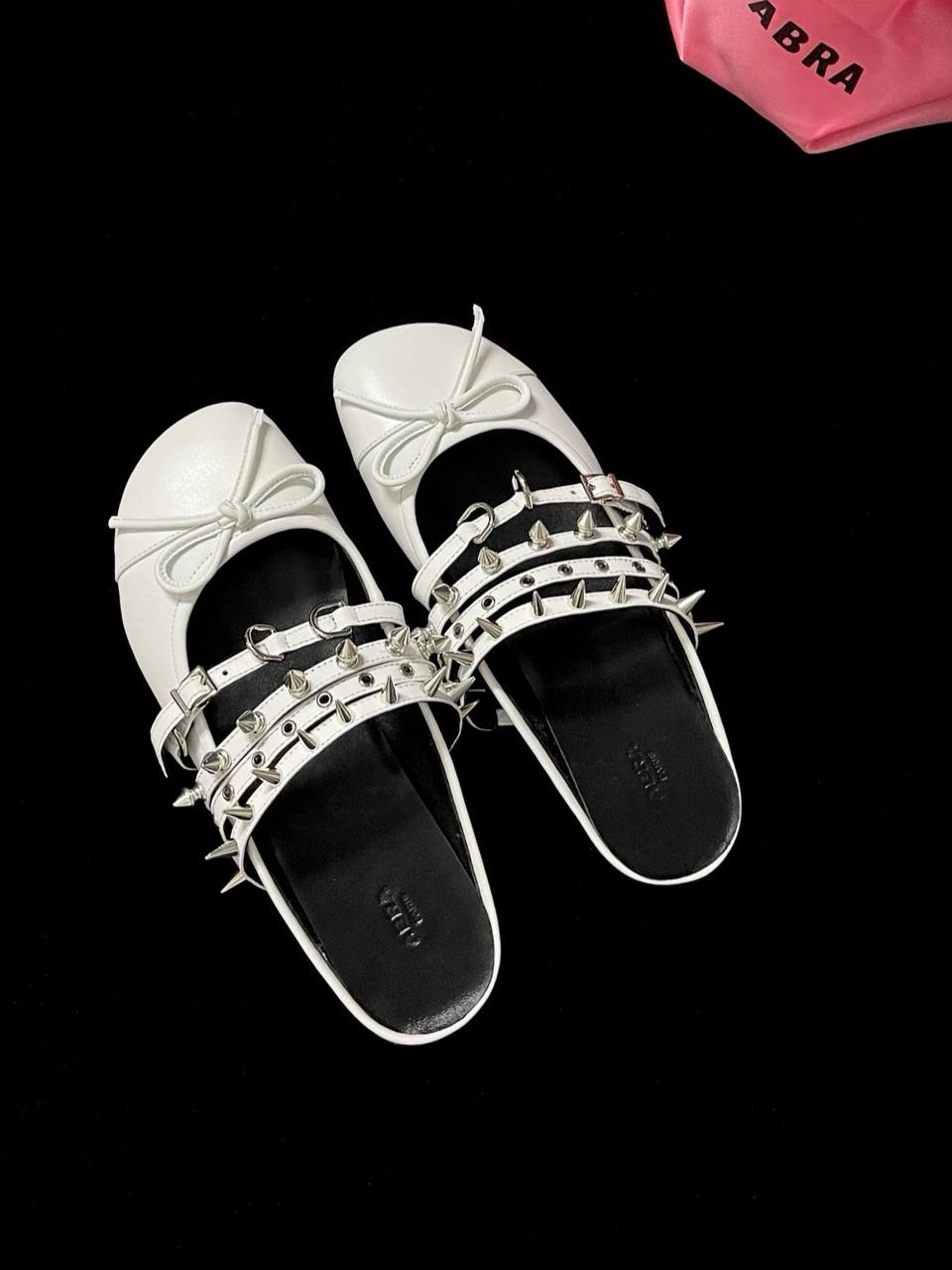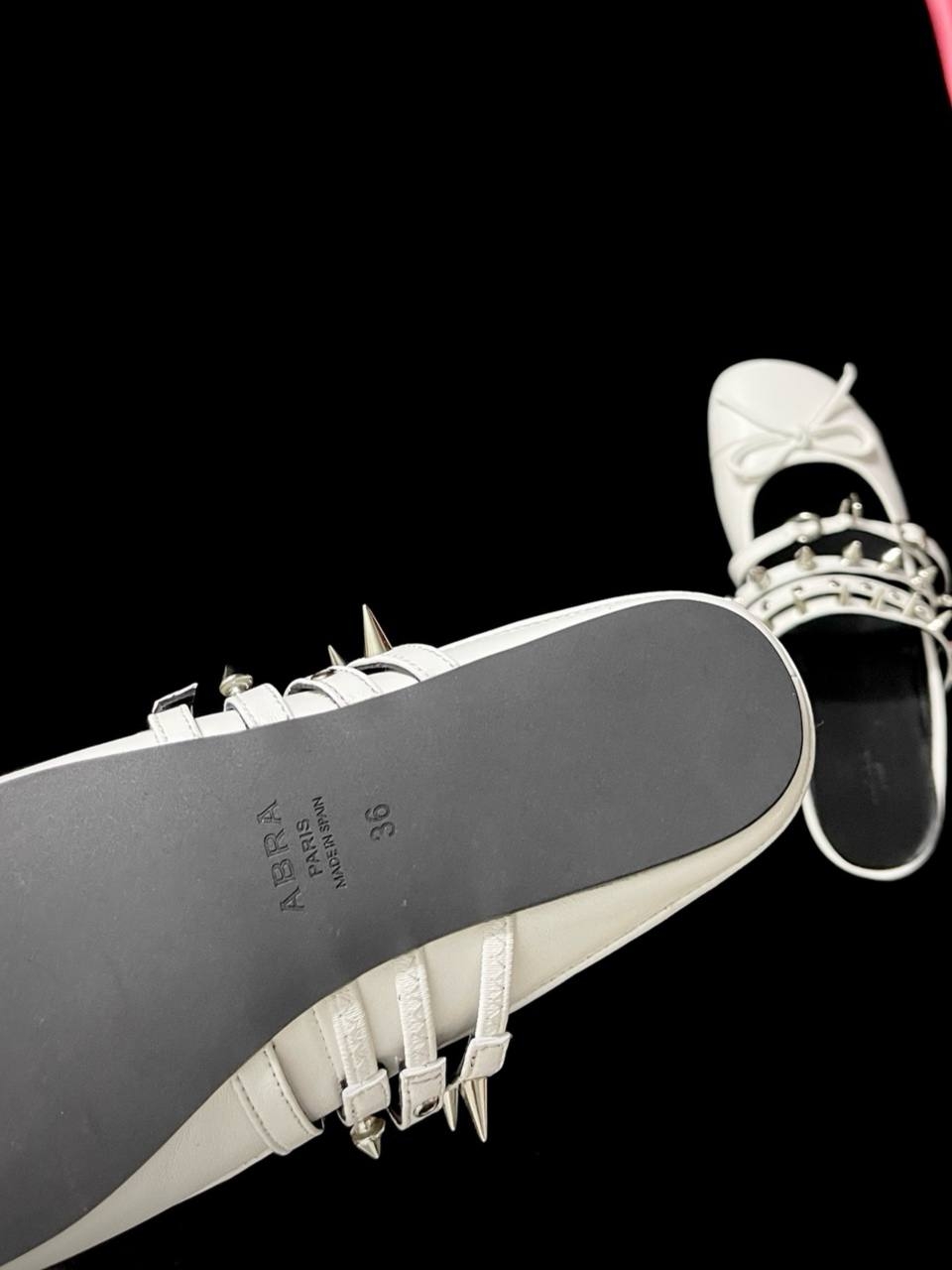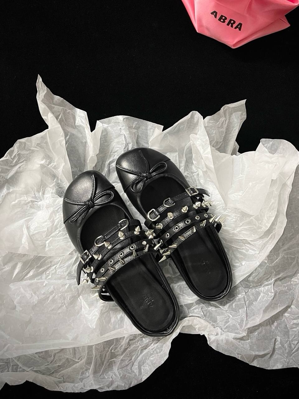 Балетки с шипами ABRA — один из самых узнаваемых силуэтов бренда. Эта модель из кожи в черно-белом цвете идеально подойдет для вечернего силуэта в эстетике бренда. Носите с другими вещами из коллекции ABRA.