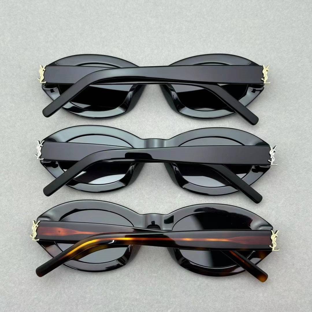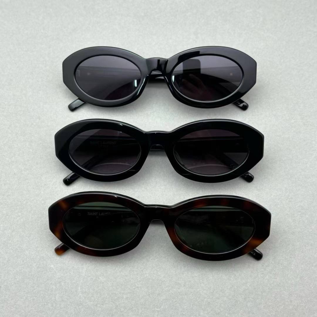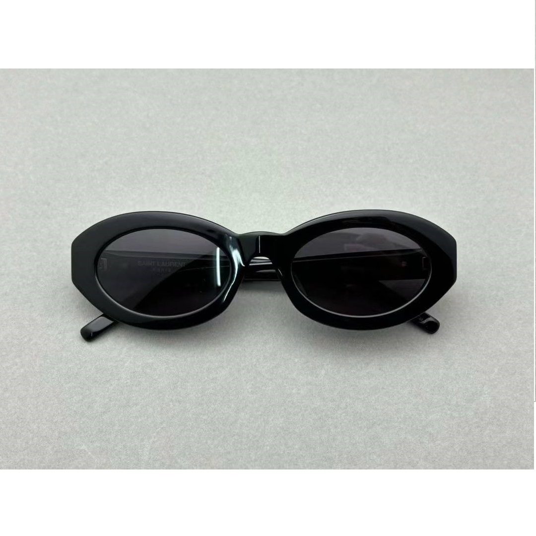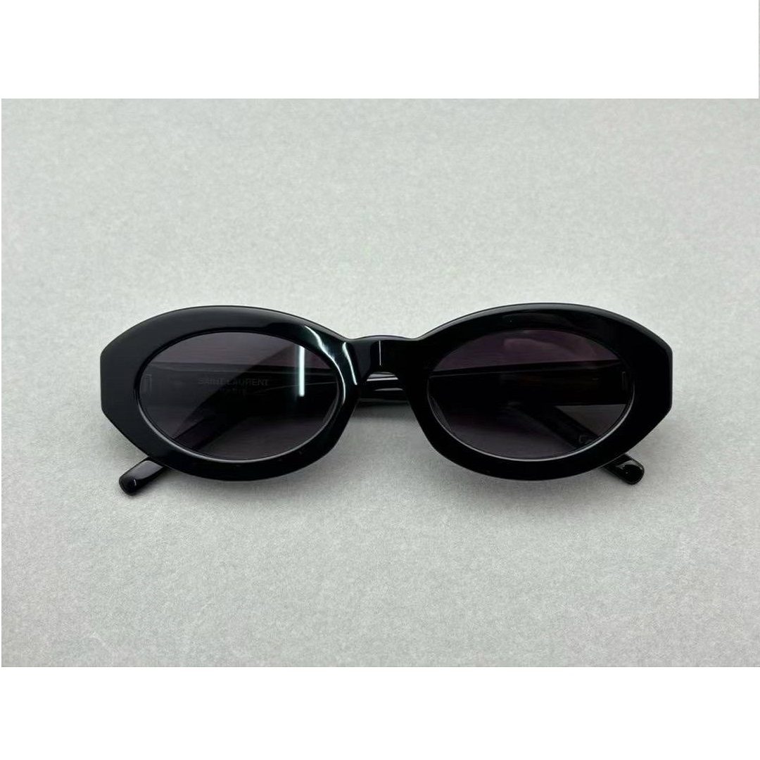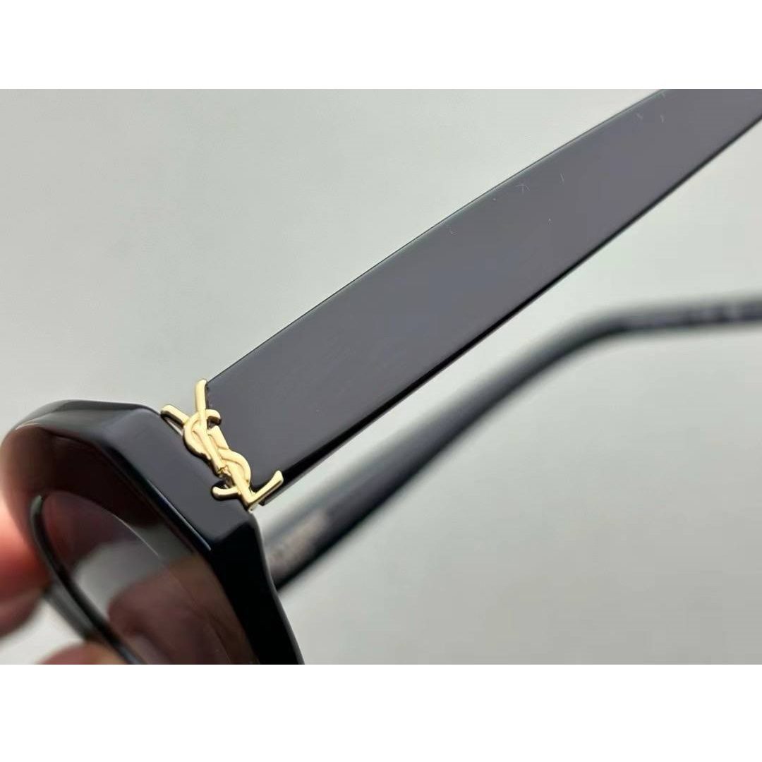 Очки Saint Laurent сделаны в овальной форме, темные. Украшены очки логотипом бренда сбоку. Купить данную модель можно в трех цветах: черный/металлик, роговая, черный/золото. Коллекция SS2025