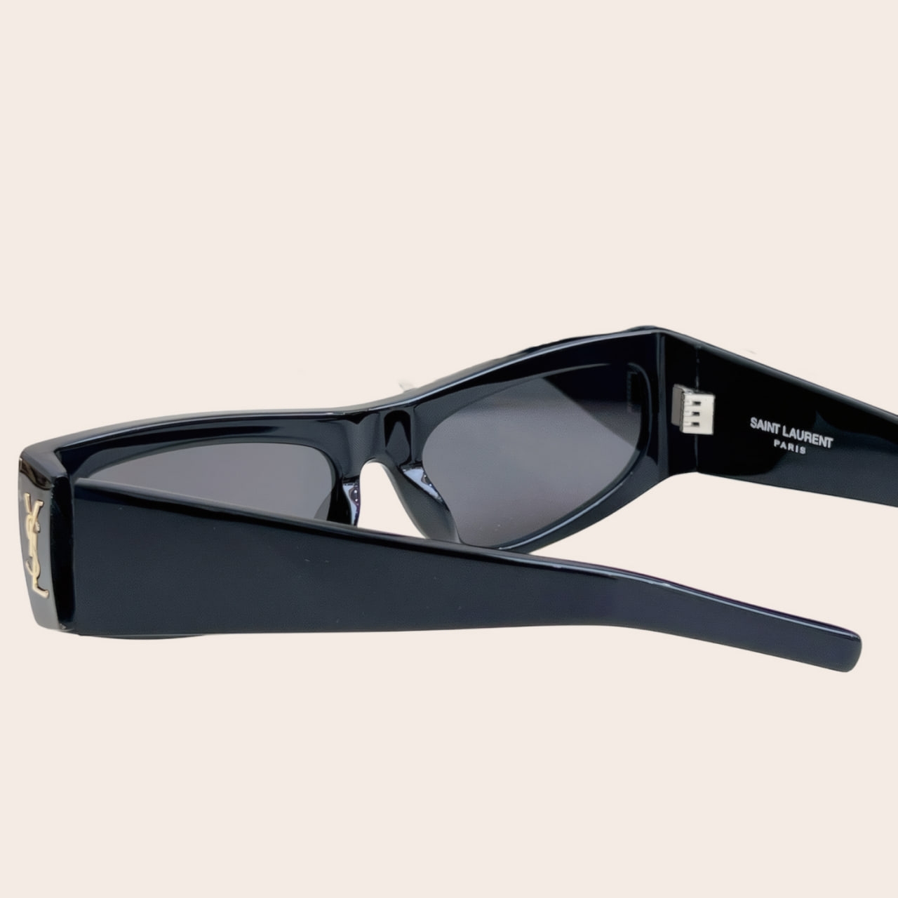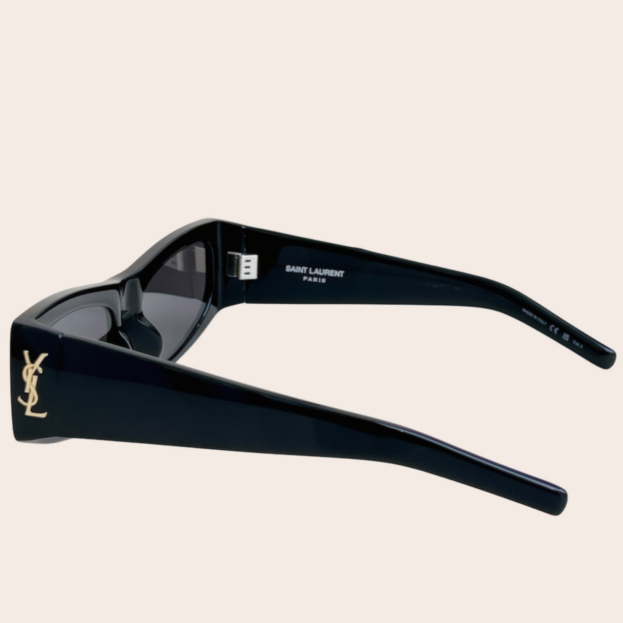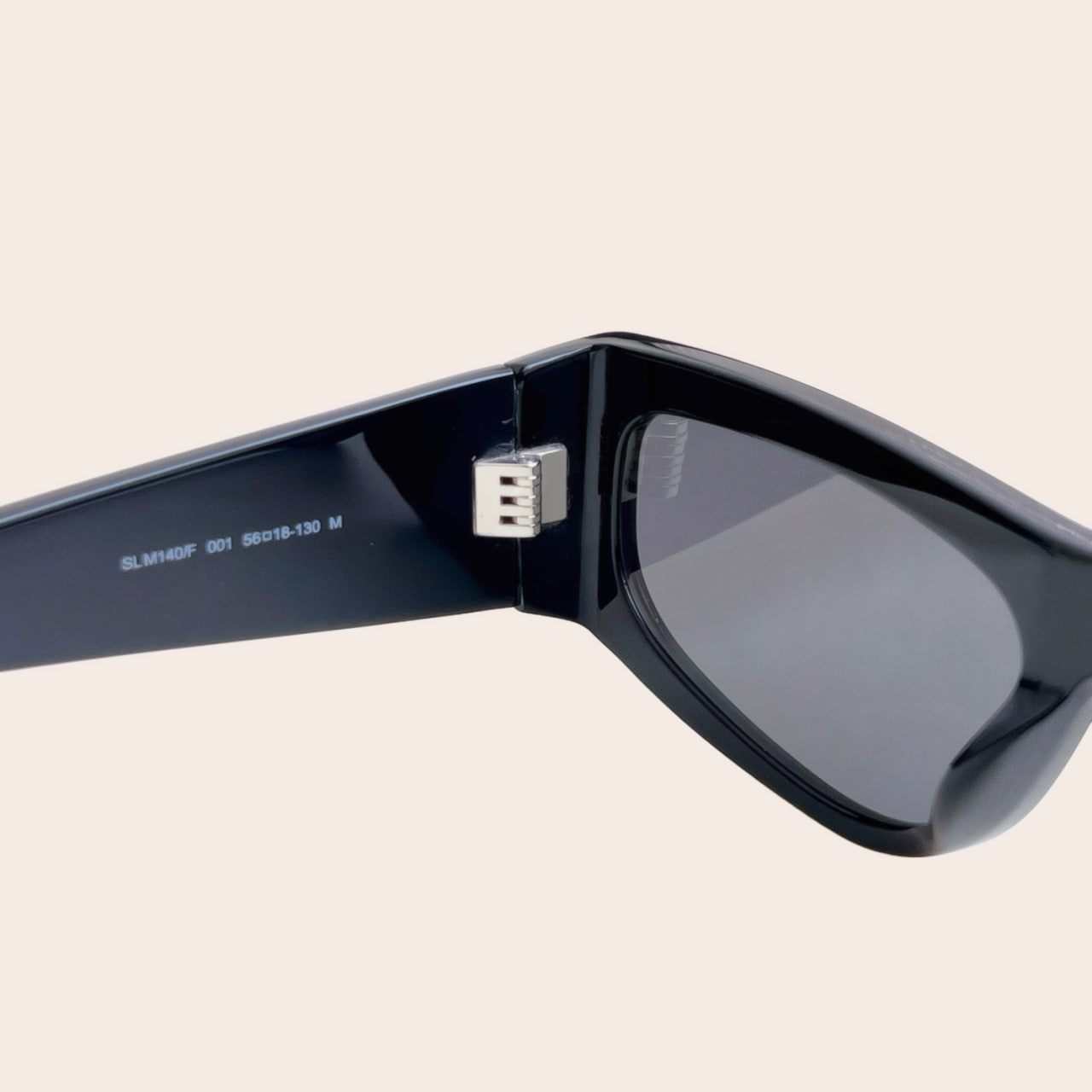 Прямоугольная оправа из ацетата черного цвета, серые тонированные линзы с защитой от ультрафиолета, фирменная табличка с логотипом, прямые дужки и прямые заушники. Очки M140 от Saint Laurent дополнят ваш образ в солнечную погоду.
