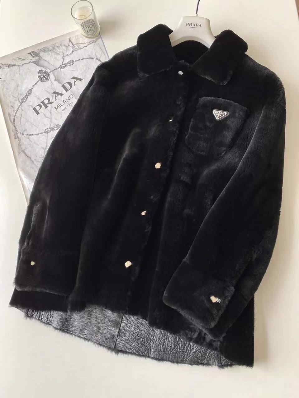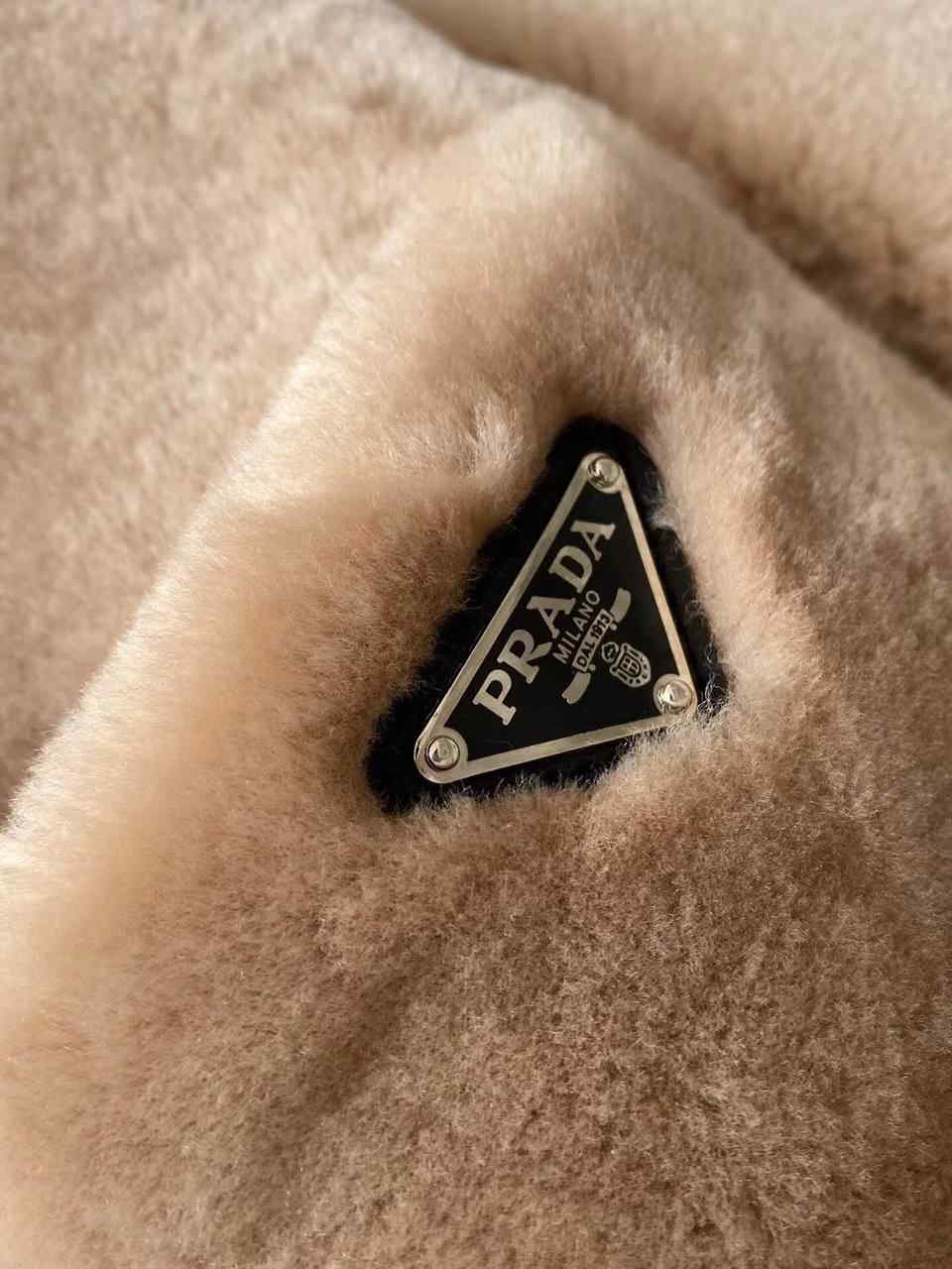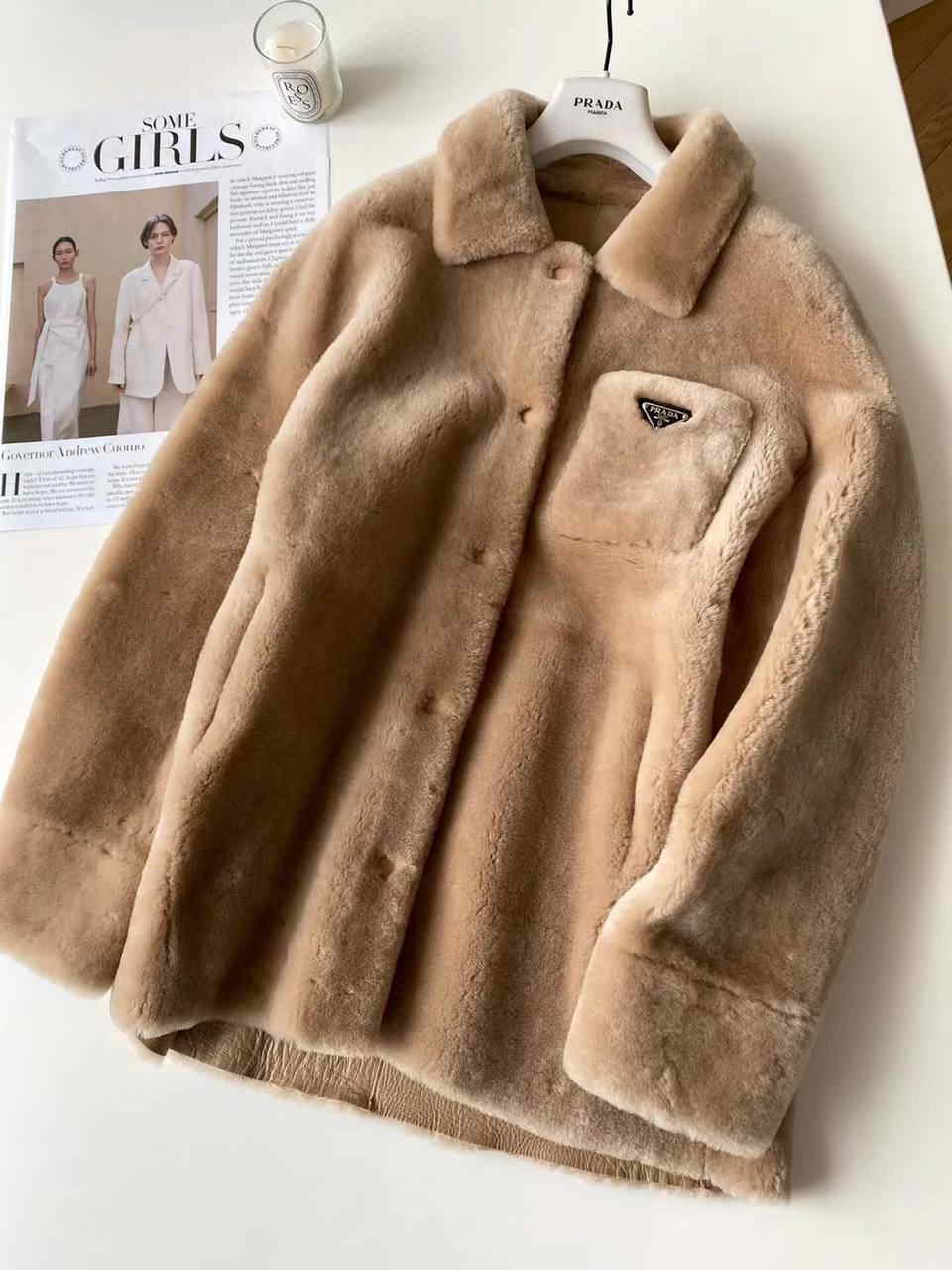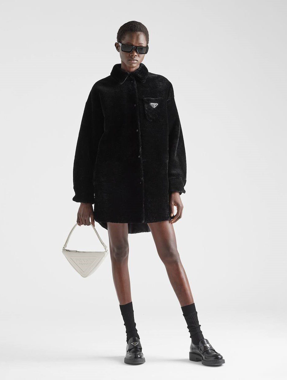 Пальто из овчины с прямым силуэтом. Бархатный и плотно набитый мех-овчина на лицевой стороне, длинный рукав с манжетами на кнопках, отложной воротник, прямой крой, спереди меховой накладной карман на груди с культовым треугольным логотипом бренда, внутренняя часть выполнена из текстурированной натуральной кожи, ассиметричный низ чуть длиннее сзади, застёгивается спереди на ряд из кнопок. Купить пальто из овчины в стиле рубашки вы можете в чёрном и бежевом цветах.