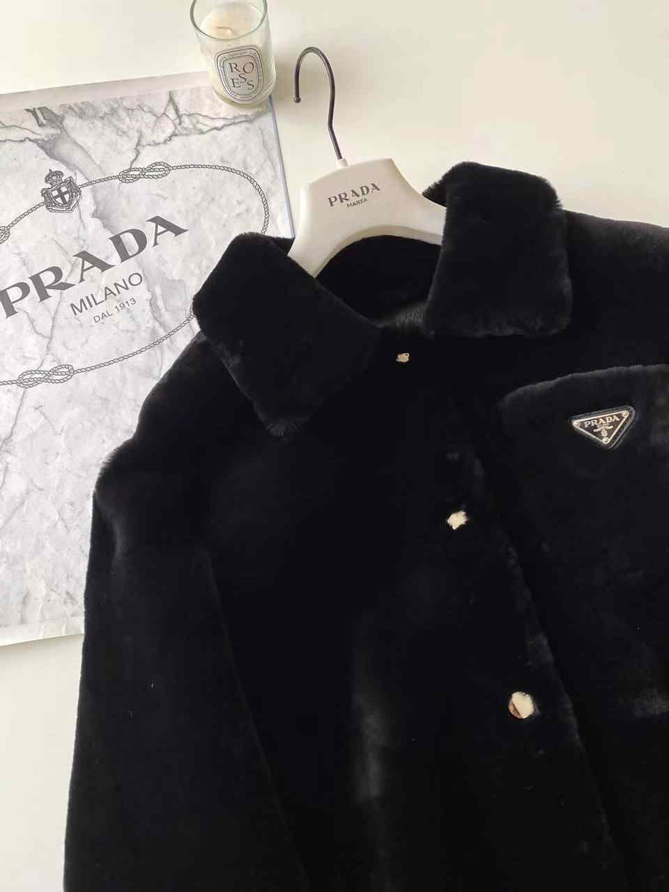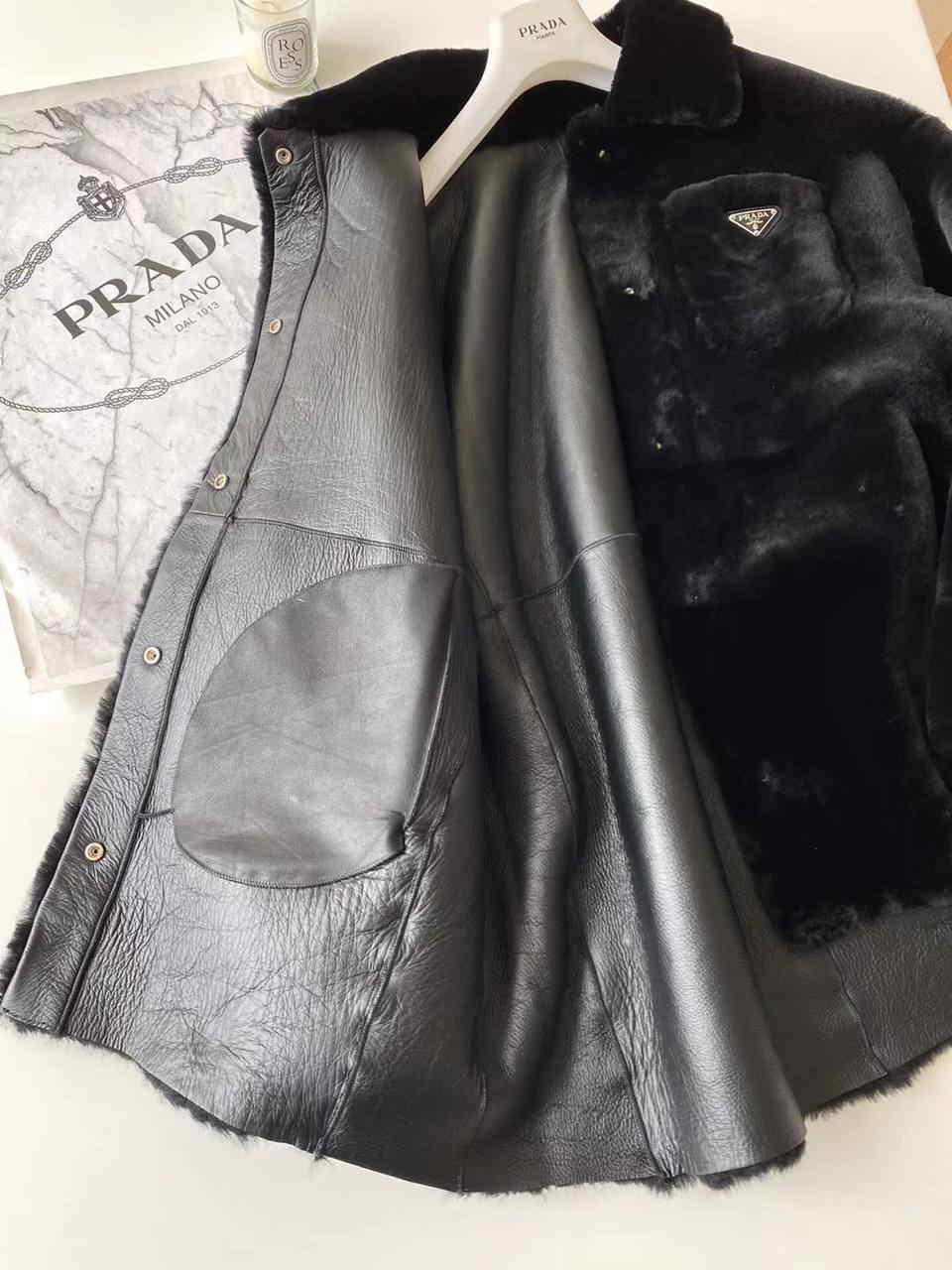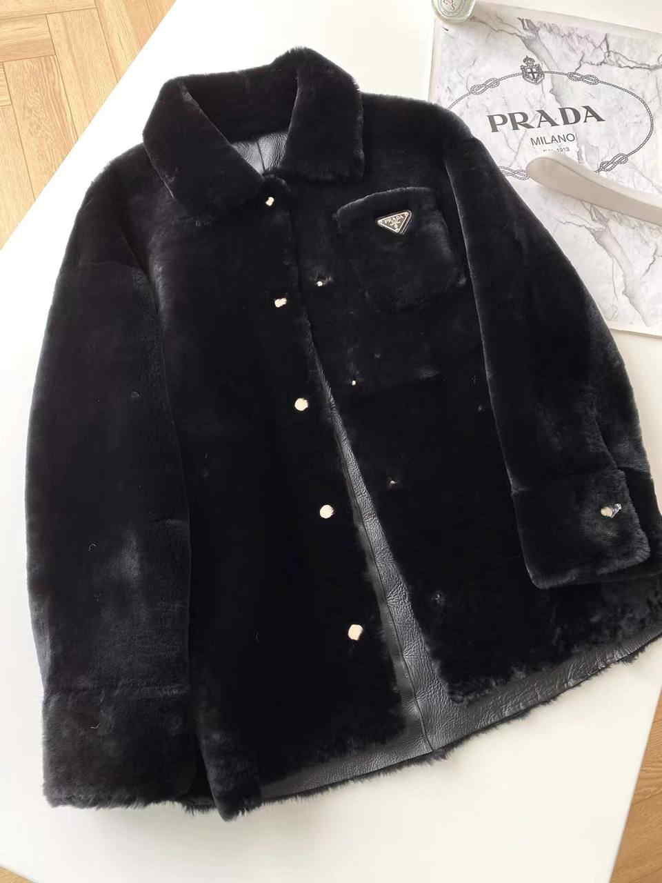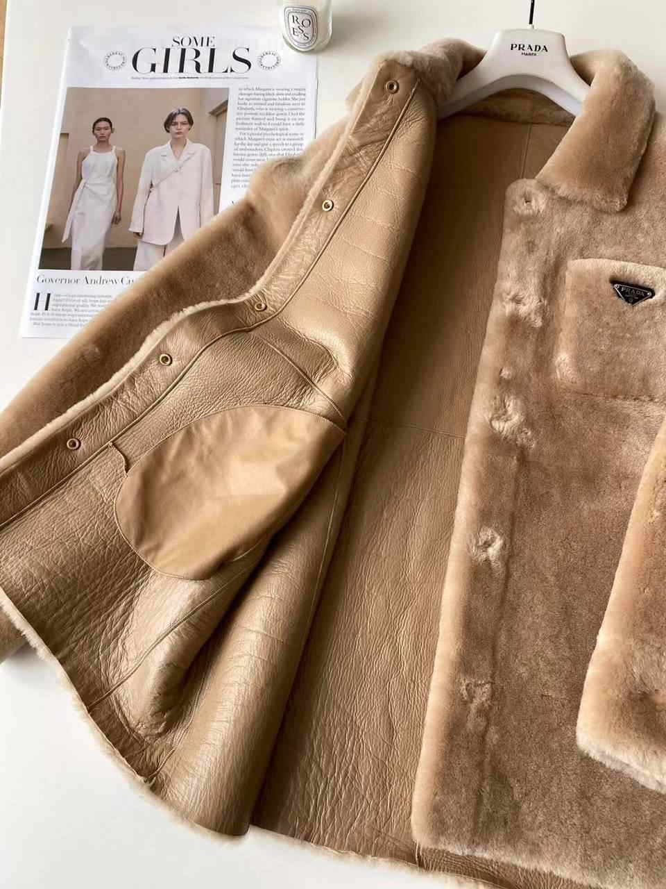 Пальто из овчины с прямым силуэтом. Бархатный и плотно набитый мех-овчина на лицевой стороне, длинный рукав с манжетами на кнопках, отложной воротник, прямой крой, спереди меховой накладной карман на груди с культовым треугольным логотипом бренда, внутренняя часть выполнена из текстурированной натуральной кожи, ассиметричный низ чуть длиннее сзади, застёгивается спереди на ряд из кнопок. Купить пальто из овчины в стиле рубашки вы можете в чёрном и бежевом цветах.