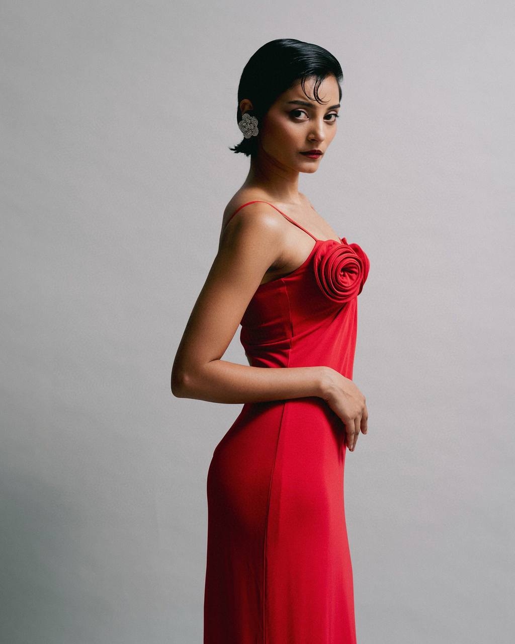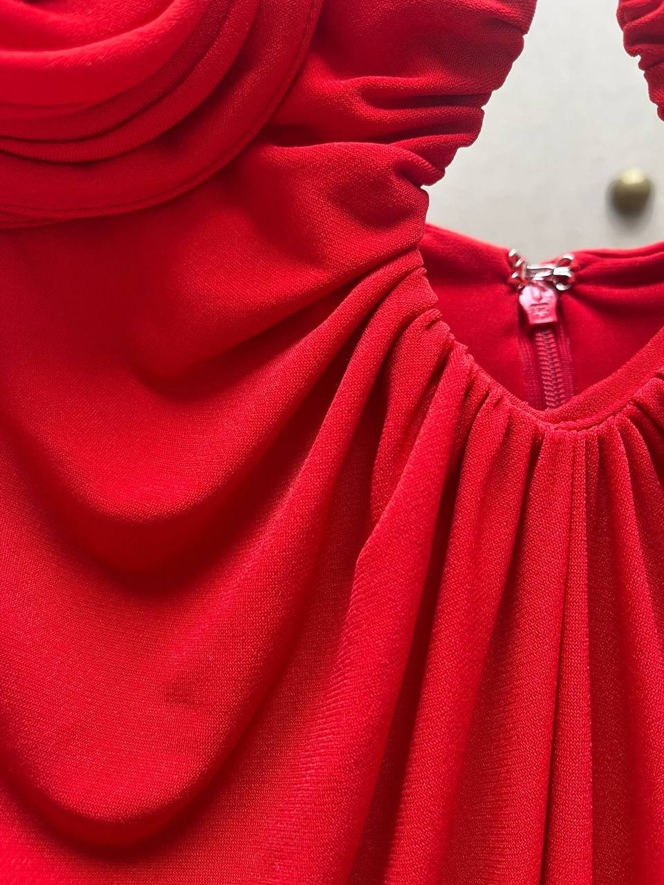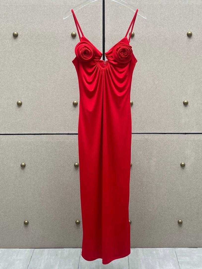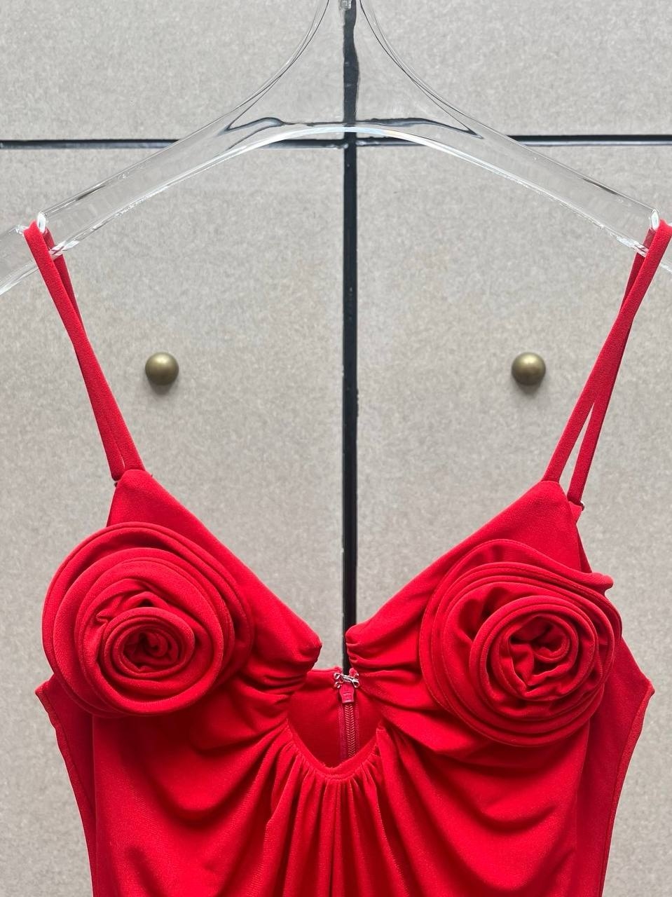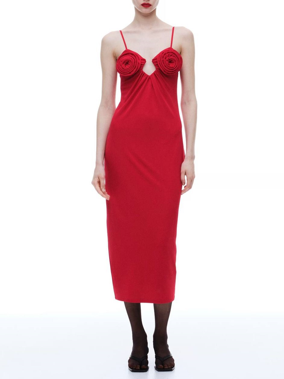 Платье миди Magda Butrym с розами выполнено в ярком красном цвете на тонких бретелях. Носите платье с босоножками или балетками.