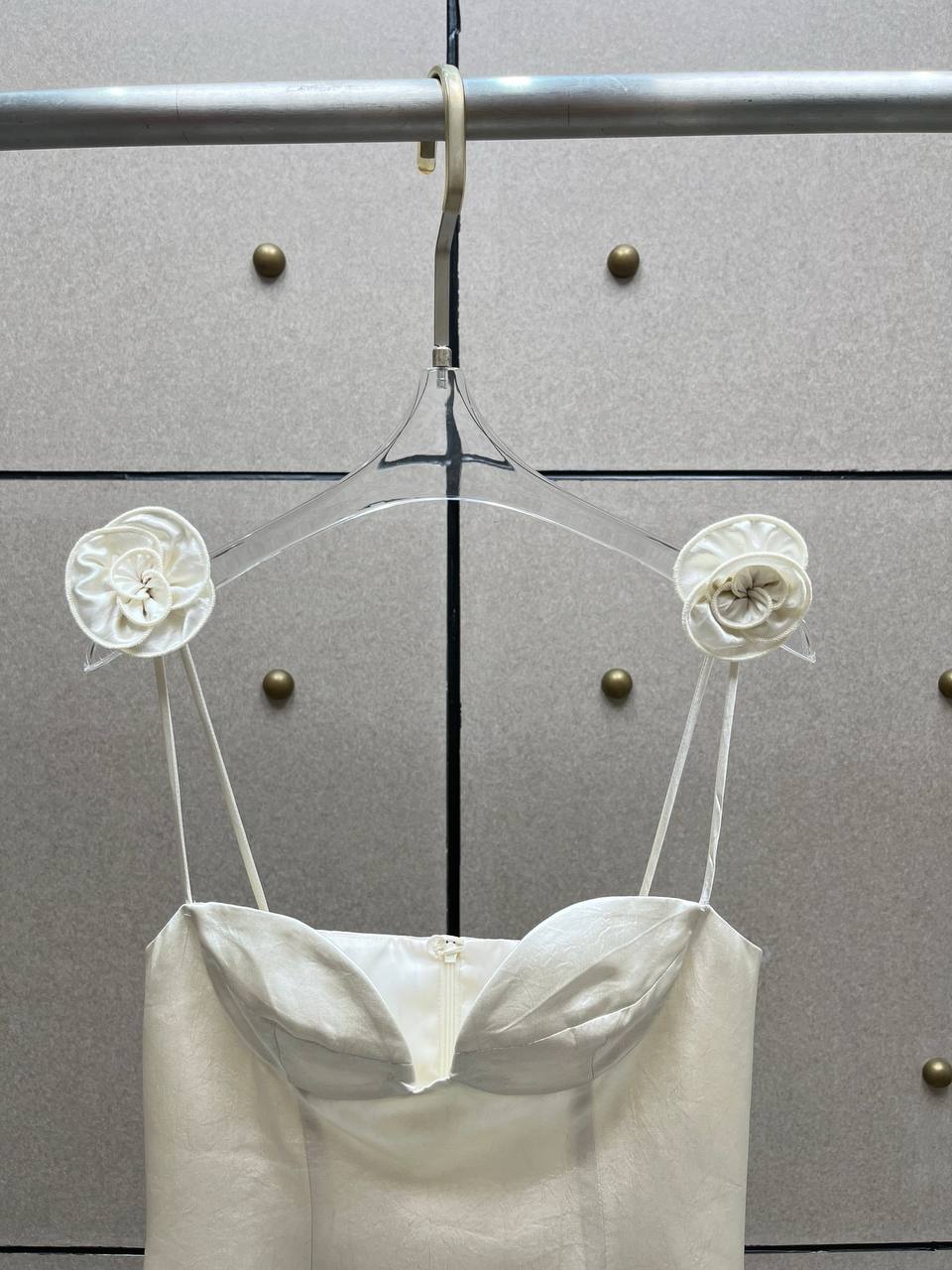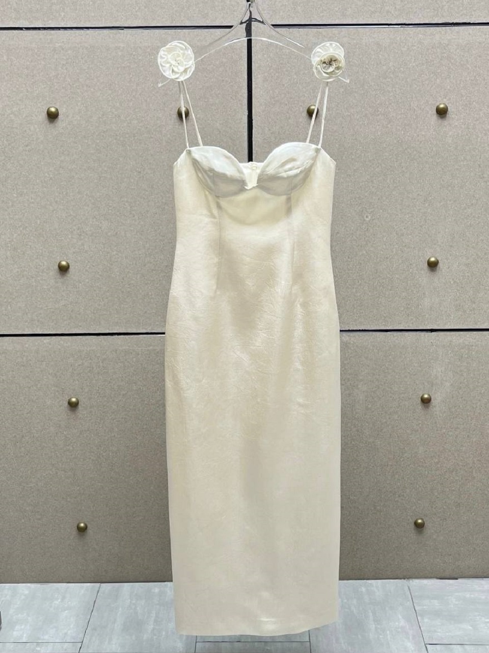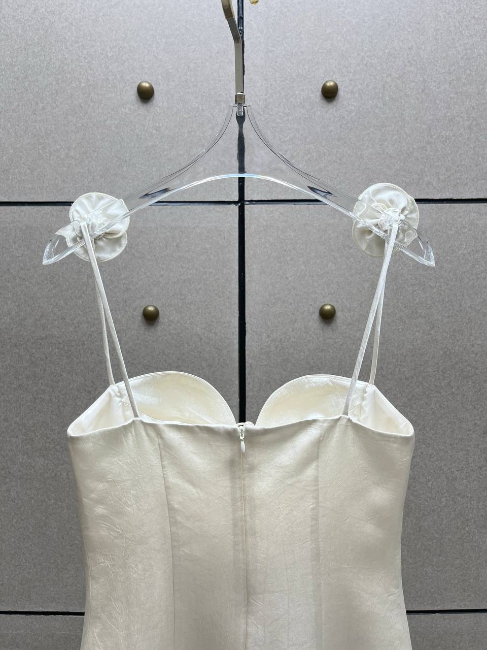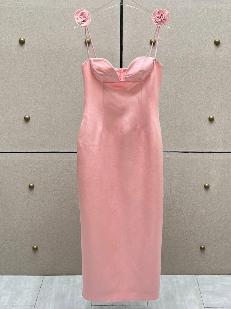 Платье Magda Butrym миди выполнено в розовом и белом цвете. Сверху лиф с косточками и вырезом бюстье, бретели украшены цветами.