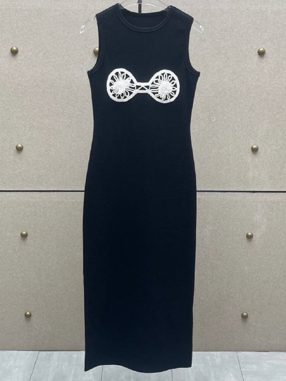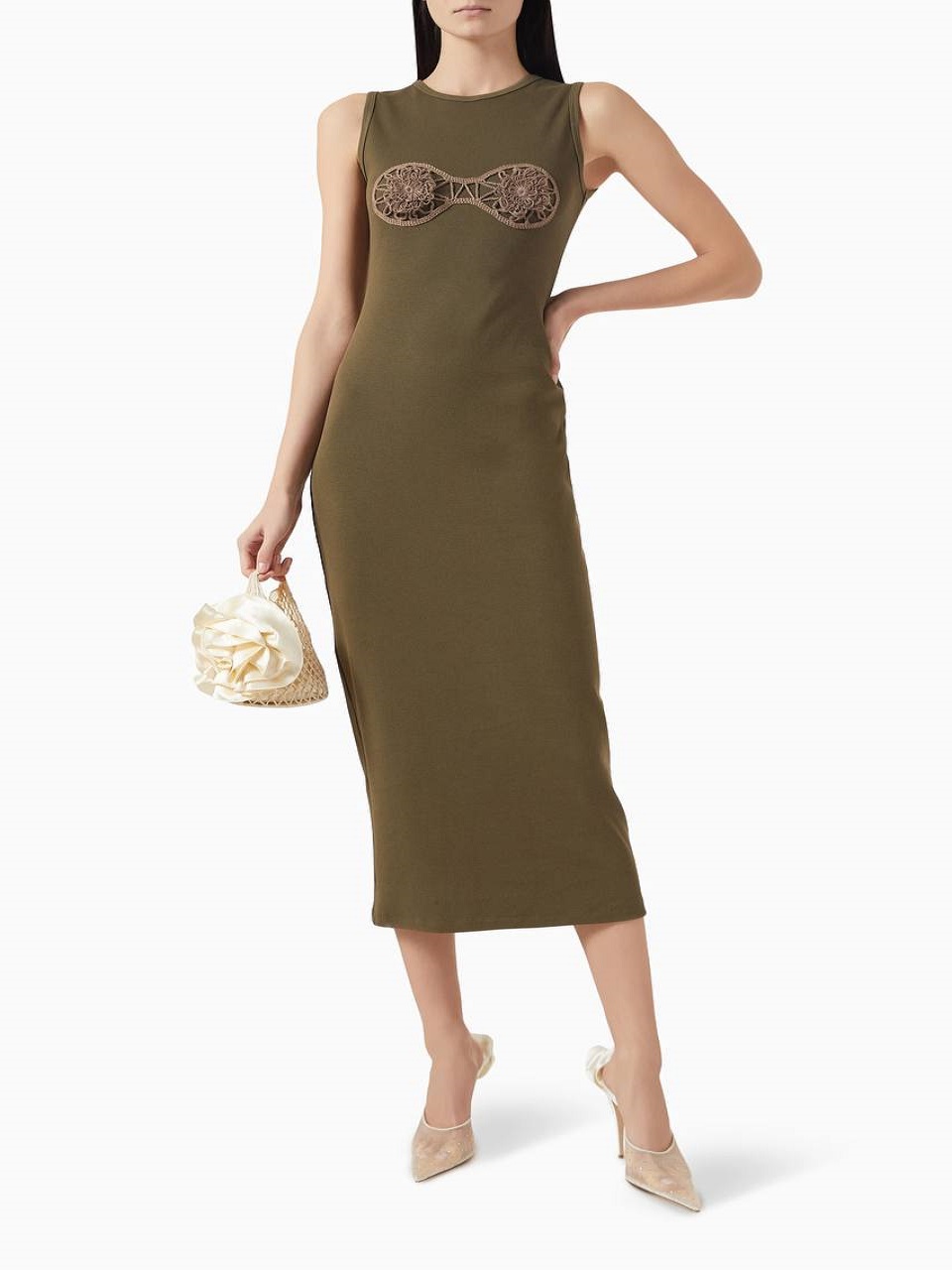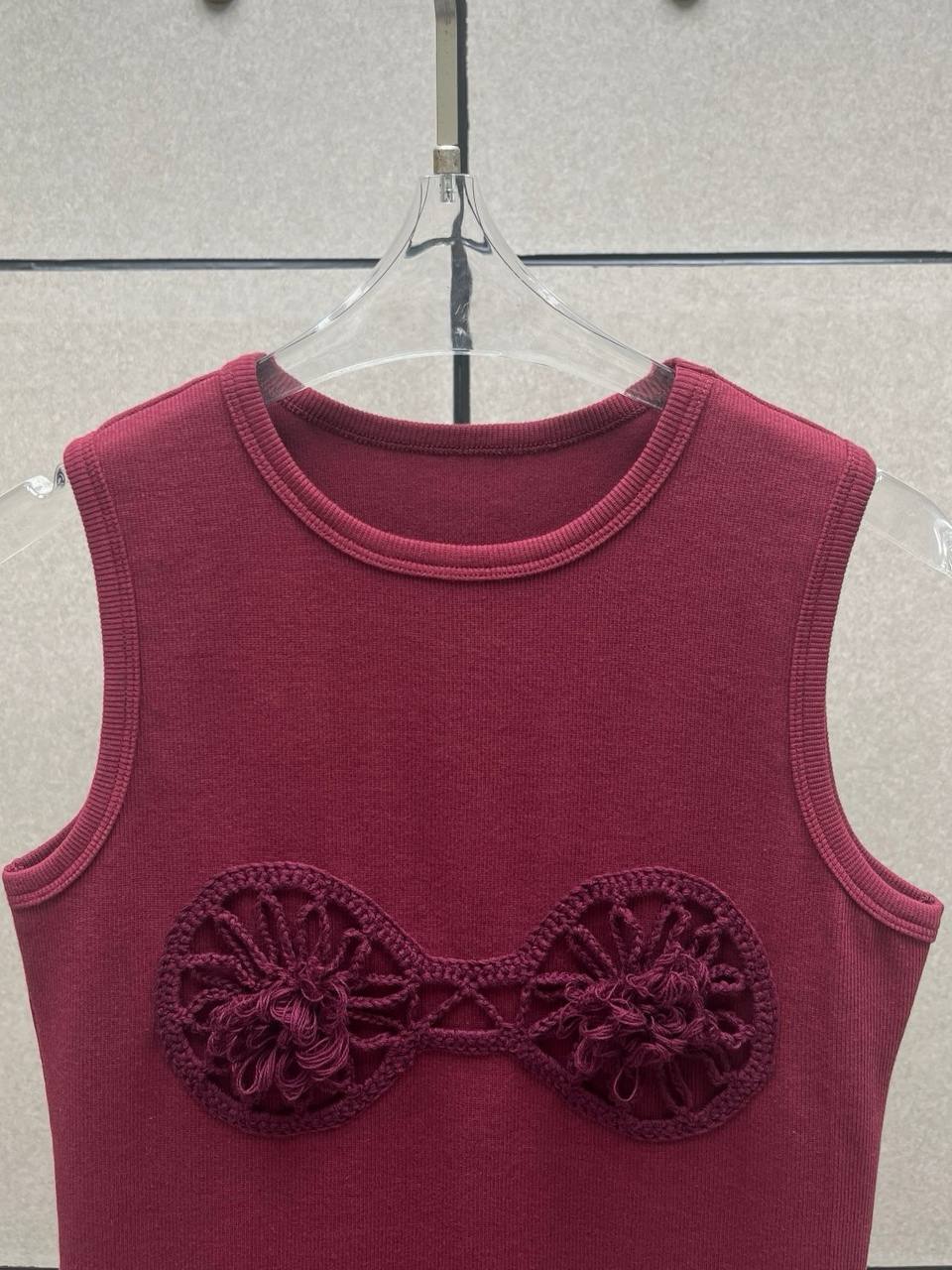 Платье миди выполнено из натурального хлопка. Оно в виде длинной майки и украшено вязанными вставками. Носите его с босоножками или балетками.