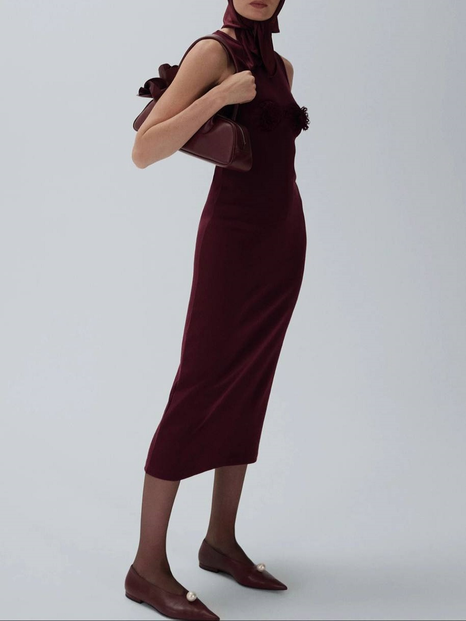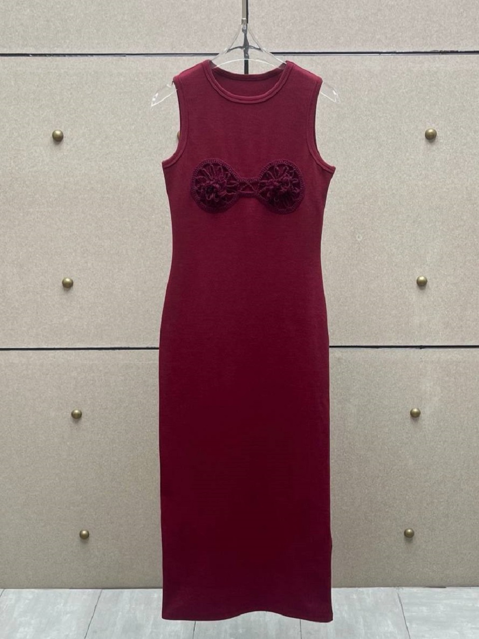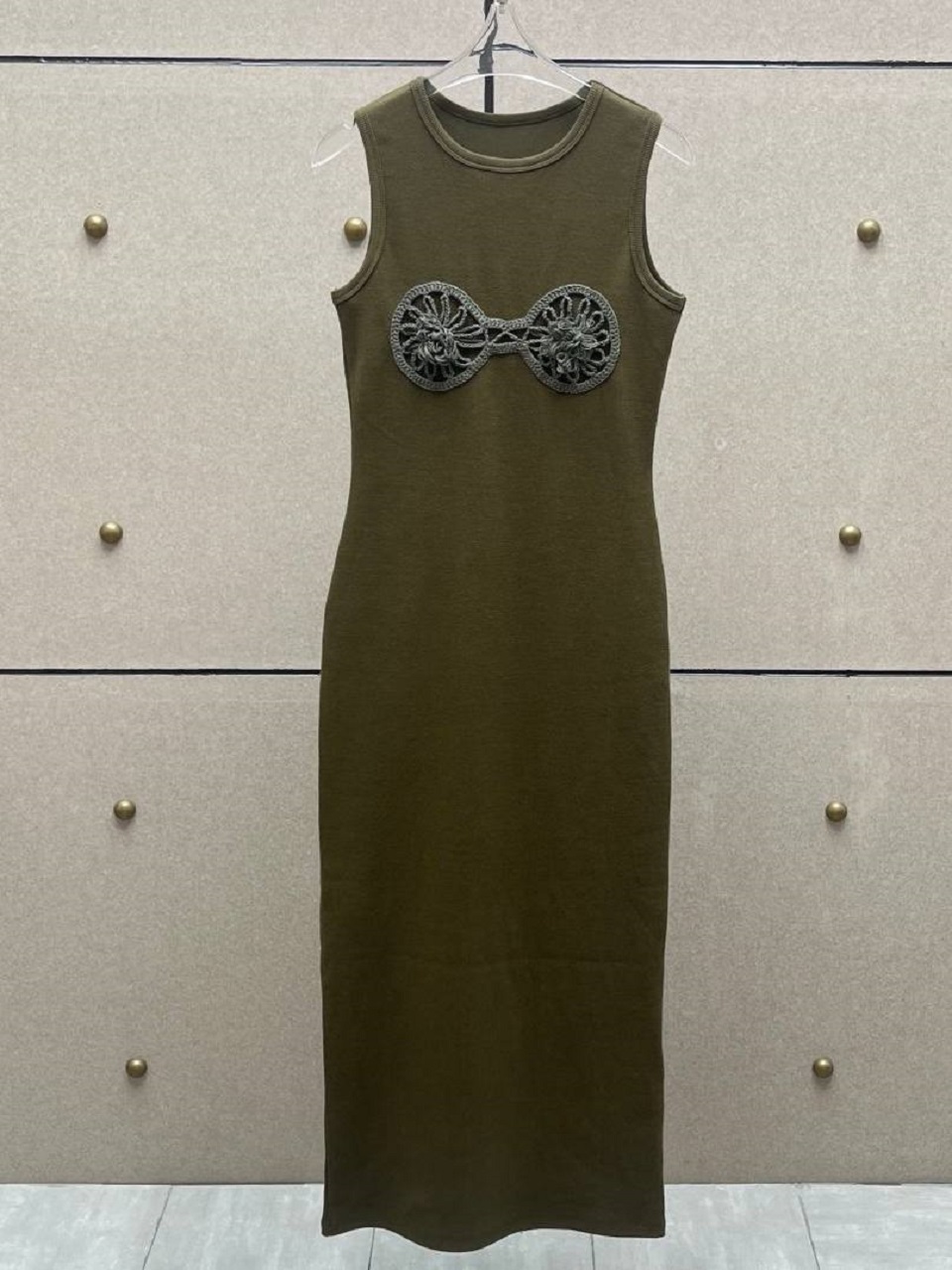 Платье миди выполнено из натурального хлопка. Оно в виде длинной майки и украшено вязанными вставками. Носите его с босоножками или балетками.