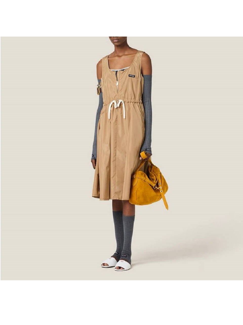 Платье Miu Miu выполнено из технического шелка. Платье миди имеет пояс на талии , который завязывается. Носите платье с балетками или кроссовками.