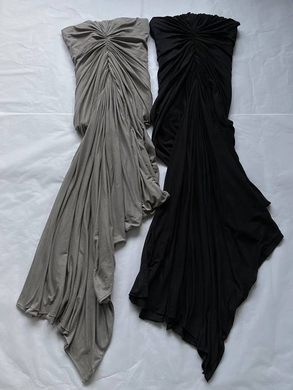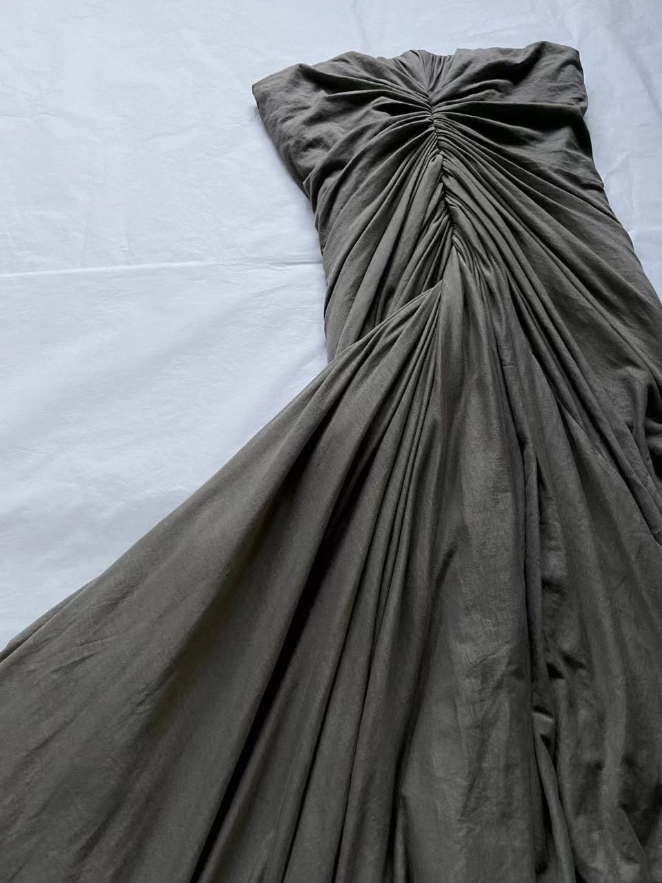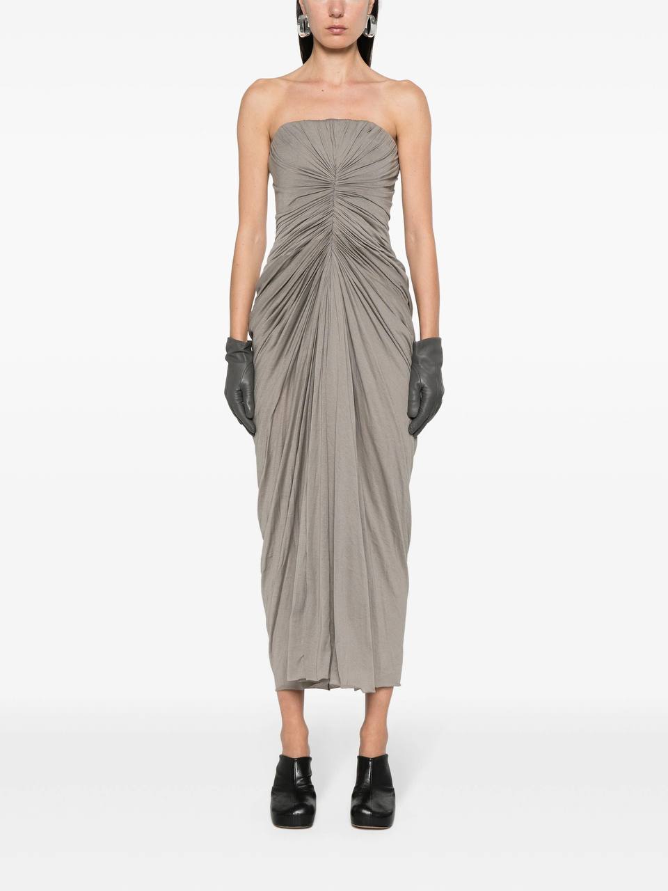 Платье Rick Owens сделано из хлопка. Данная модель сверху в виде корсета и собрана к центру. Купить платье можно в двух цветах: серый, черный.