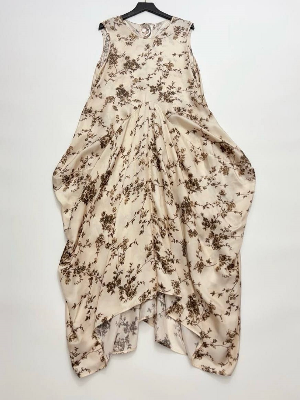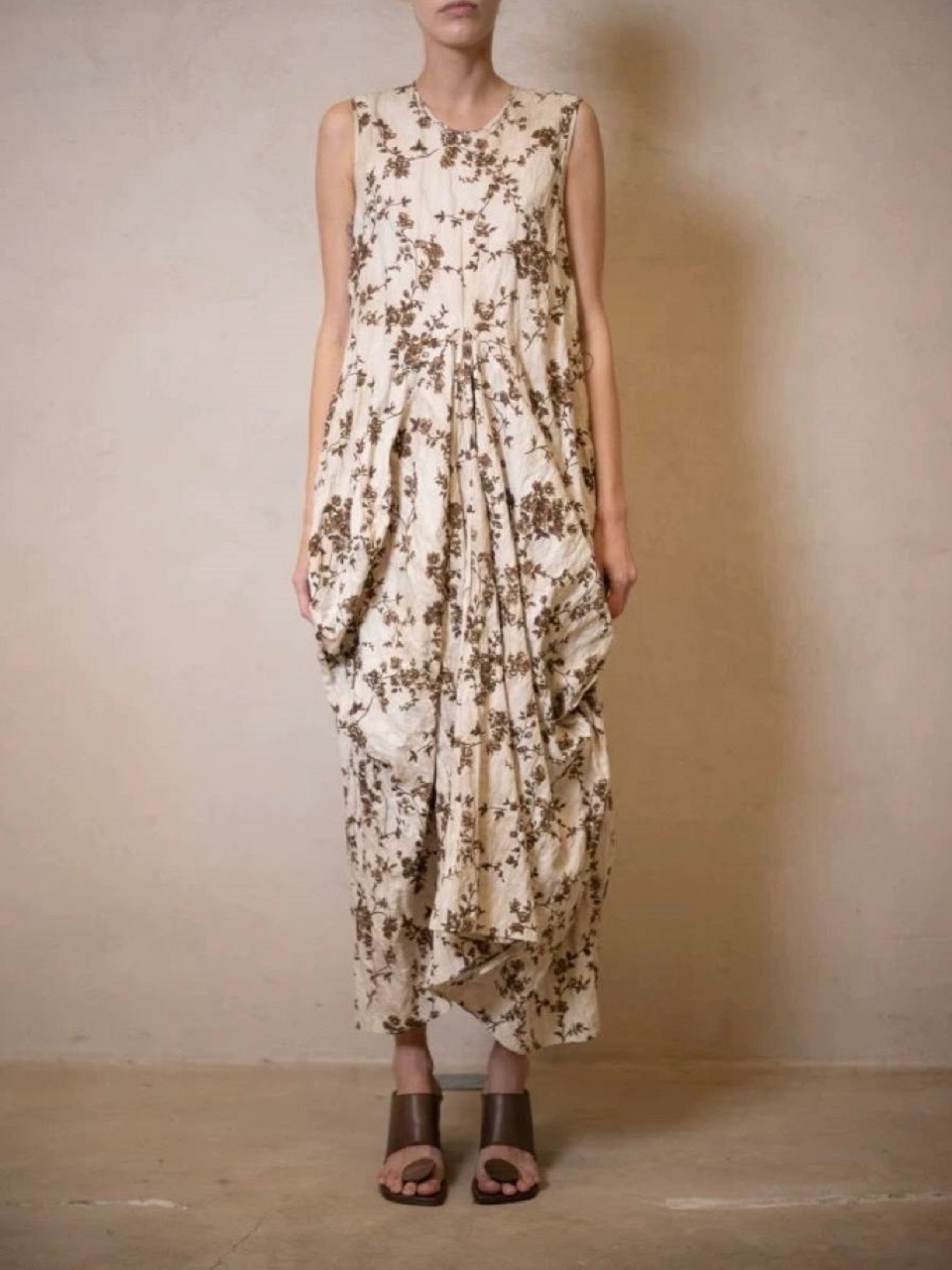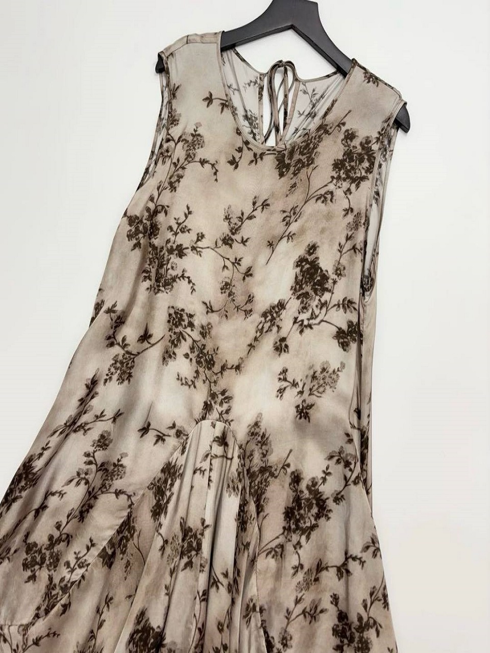 Лёгкое платье с цветочным принтом из шелковистой смешанной ткани на основе вискозы. Слегка расклешённая модель без рукавов, глубокий овальный вырез.