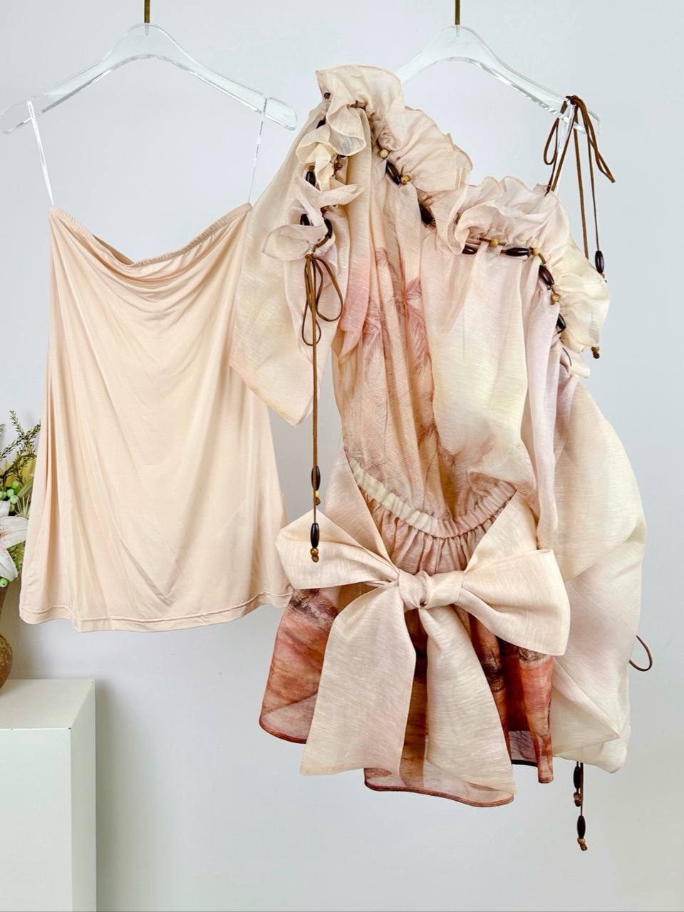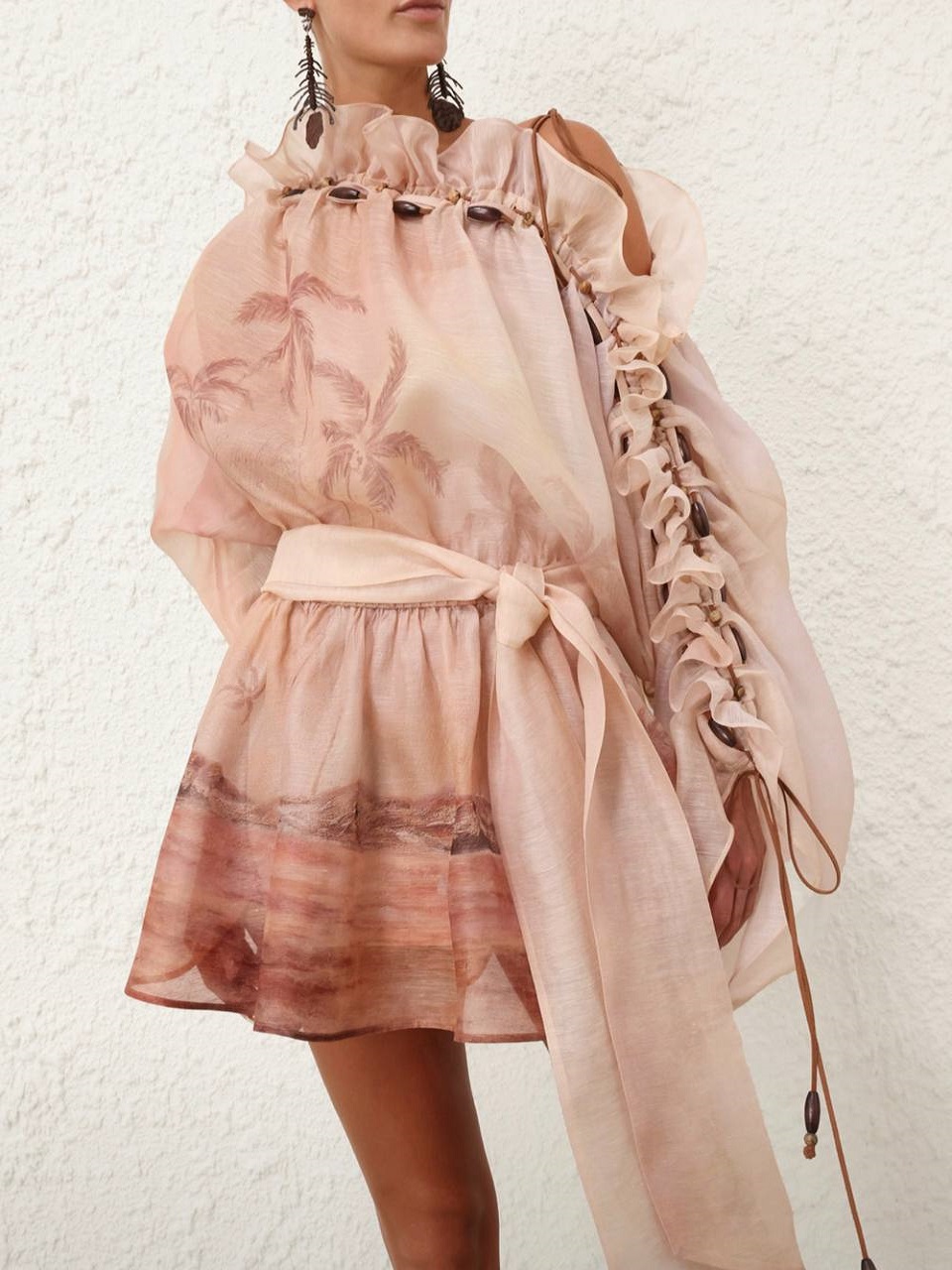 Коллекция Zimmermann исследует жизнь в гармонии с природой. Это платье ‘Illuminate’ с принтом тропиков выполнено из смеси льна и шелка, которая драпируется на лифе и ниспадает к воздушному оборчатому подолу.