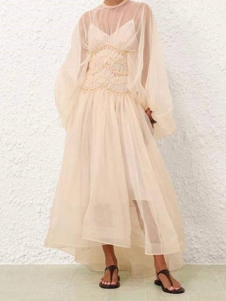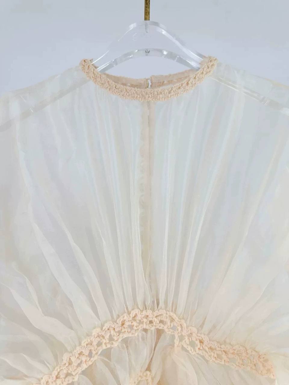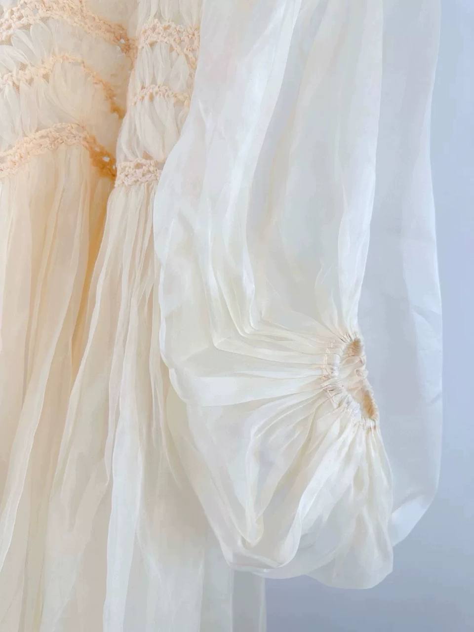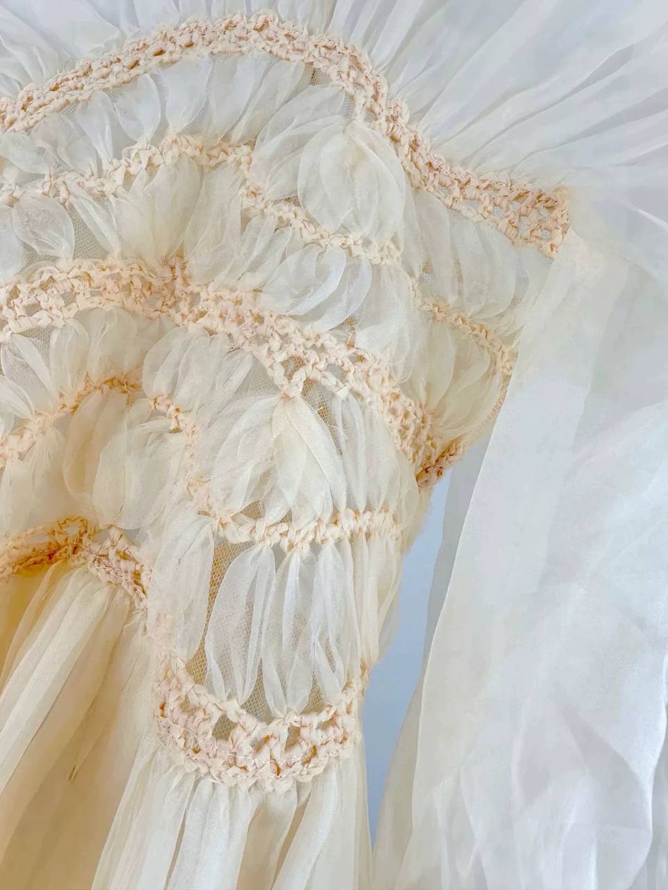Платье-макси с отделкой из макраме кремового цвета из нашей коллекции весна 2025. Платье-макси из шёлковой органзы с отделкой из макраме на полной юбке, с длинными рукавами на резиночках.