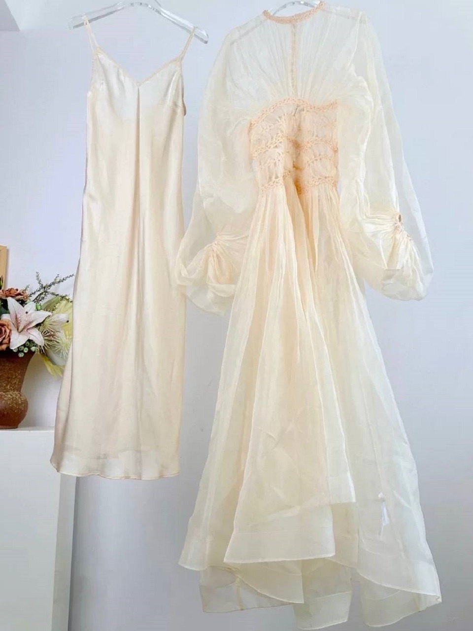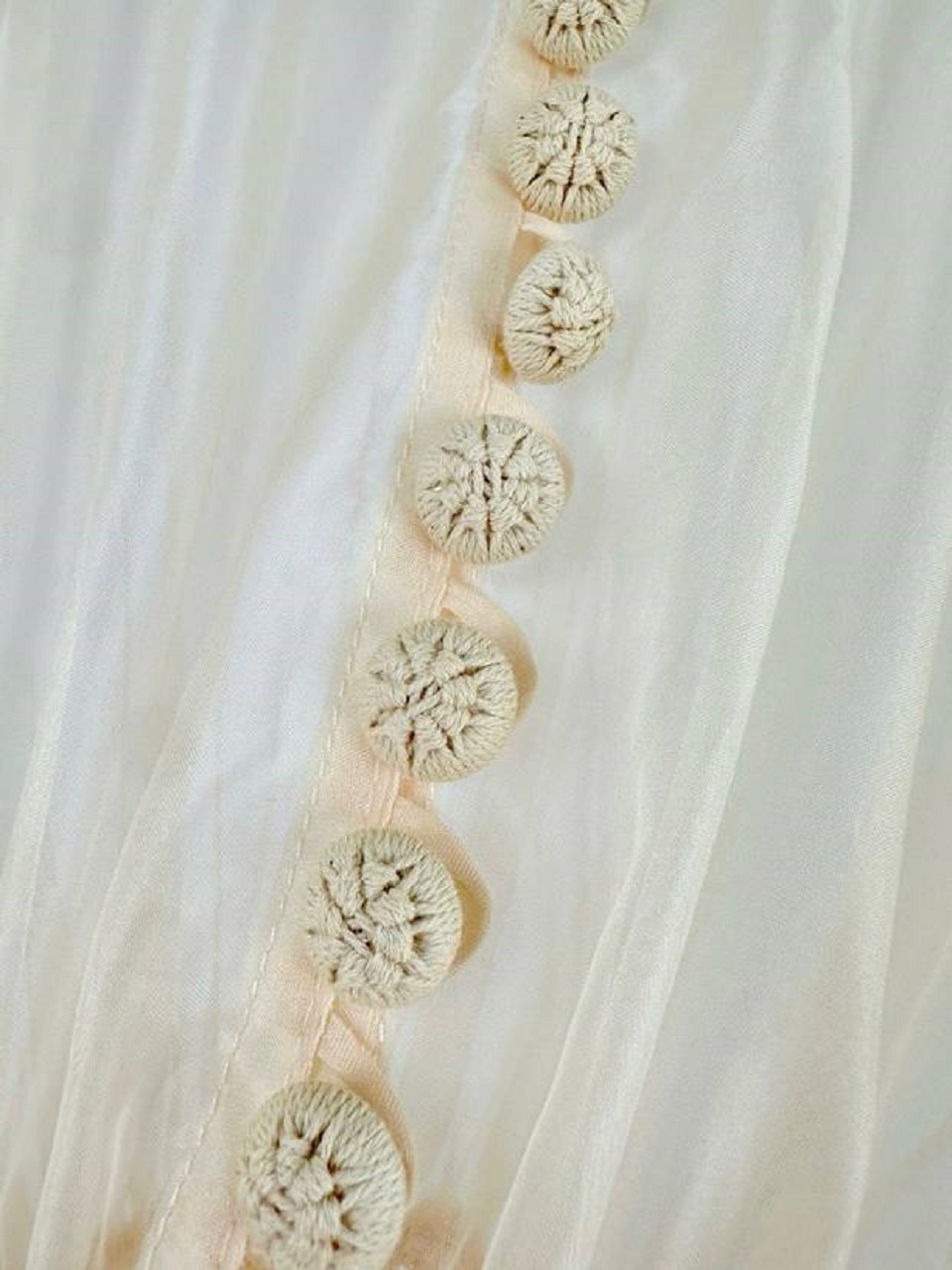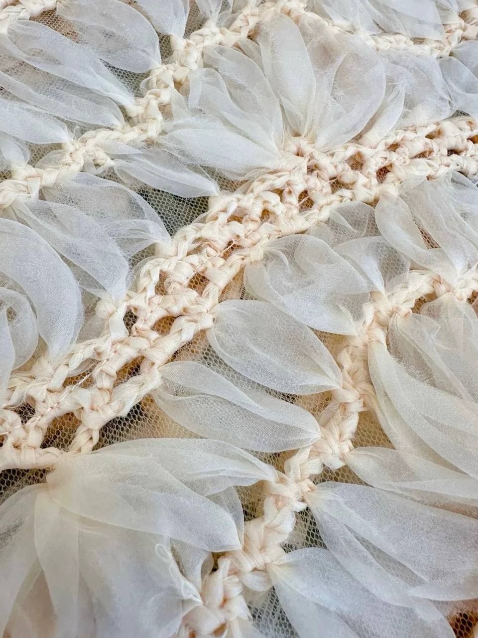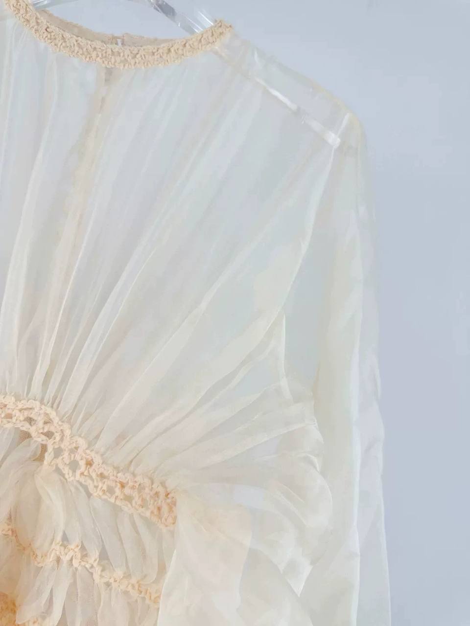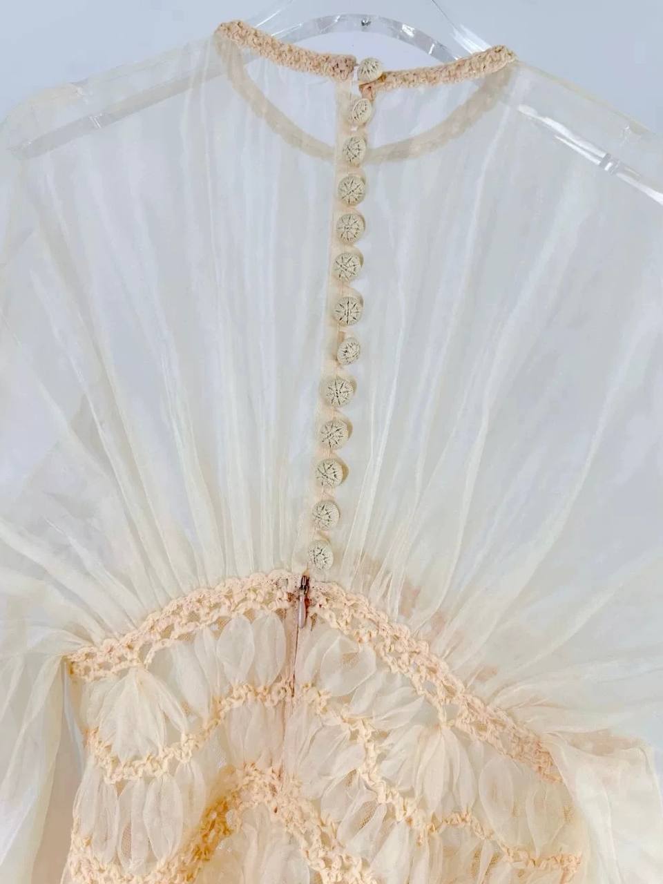 Платье-макси с отделкой из макраме кремового цвета из нашей коллекции весна 2025. Платье-макси из шёлковой органзы с отделкой из макраме на полной юбке, с длинными рукавами на резиночках.