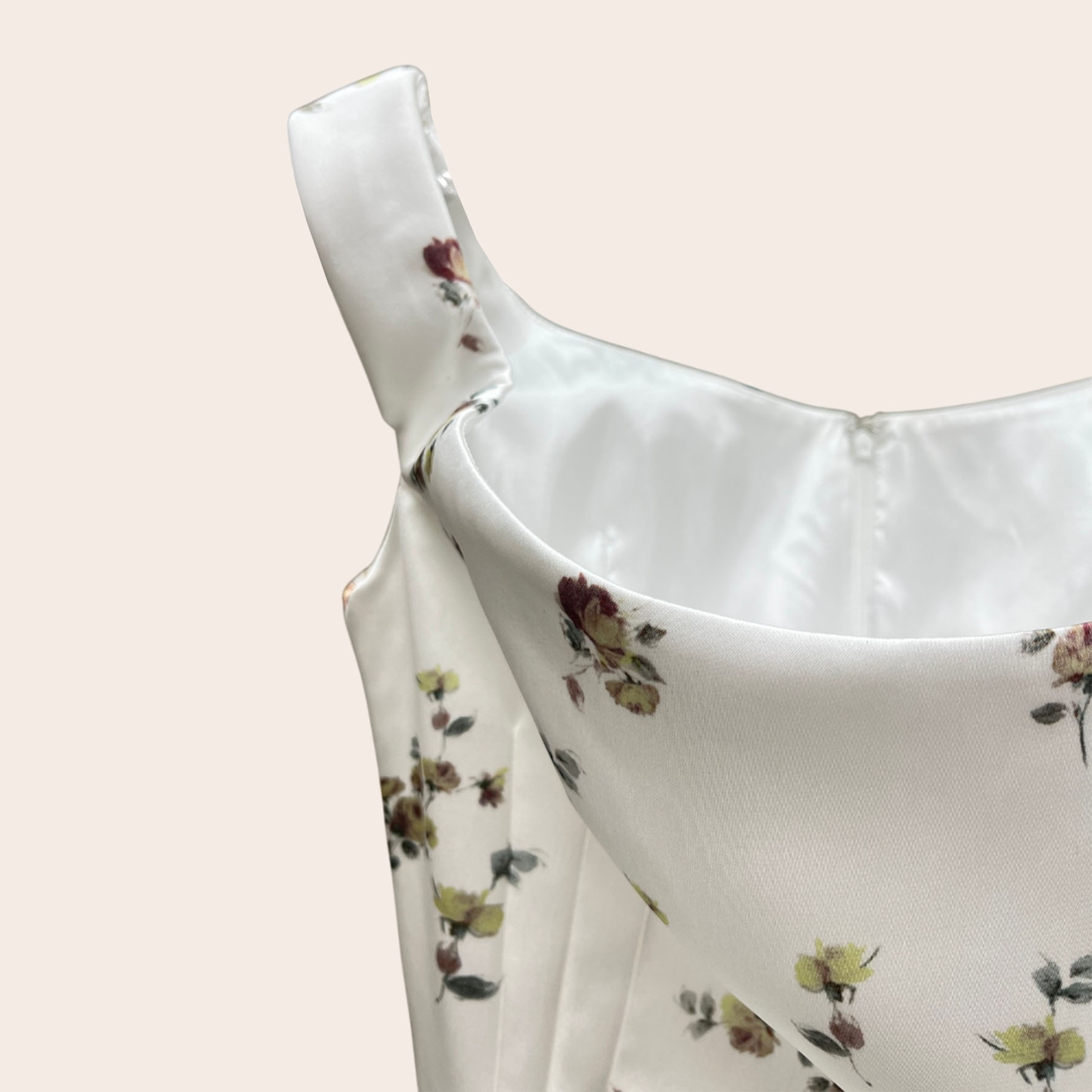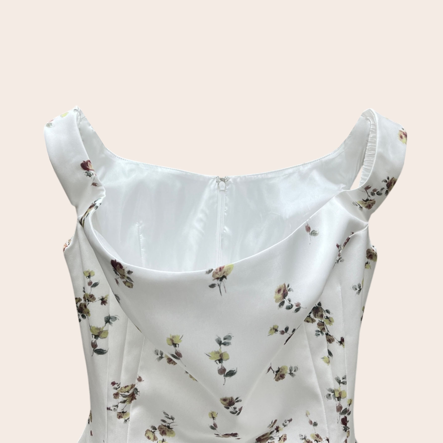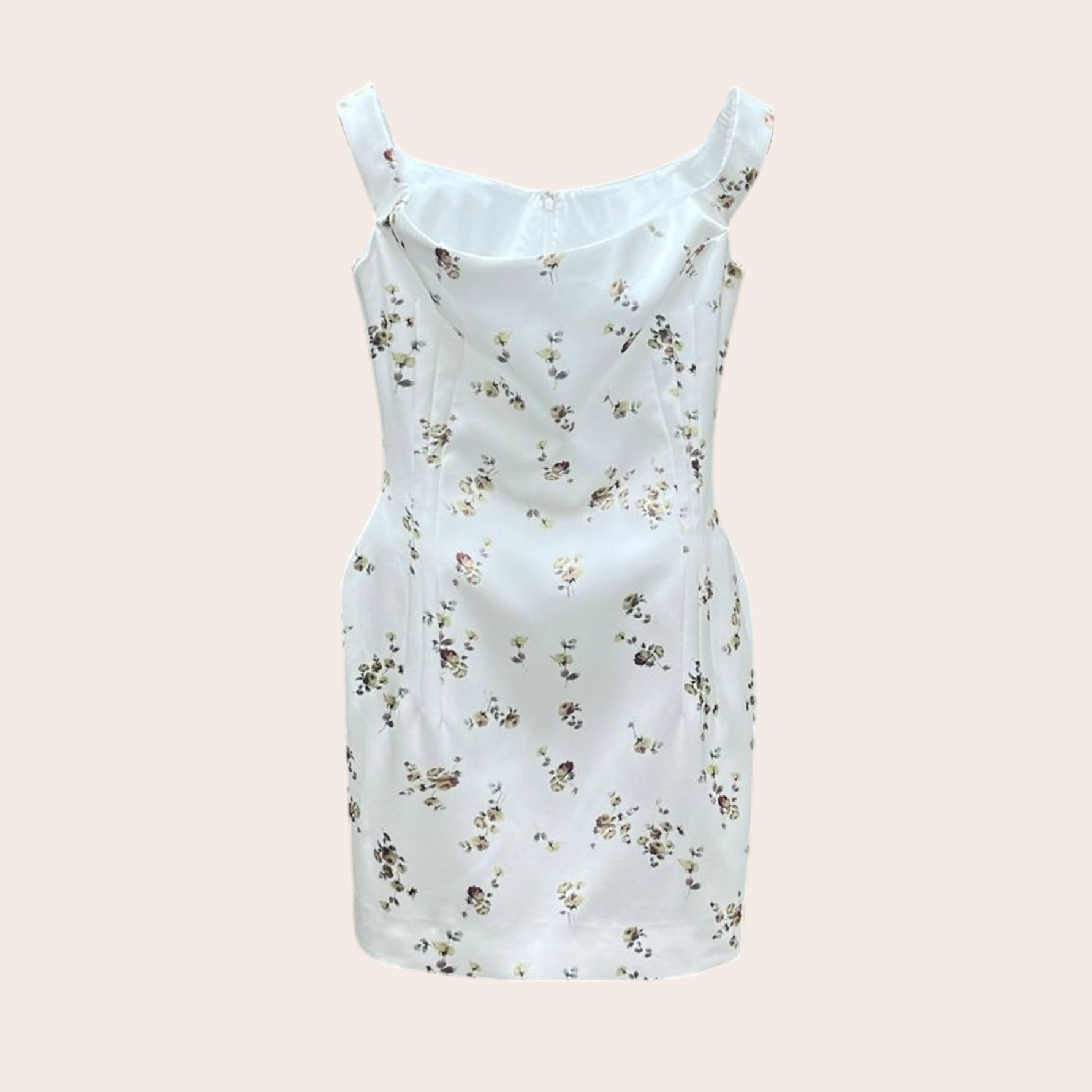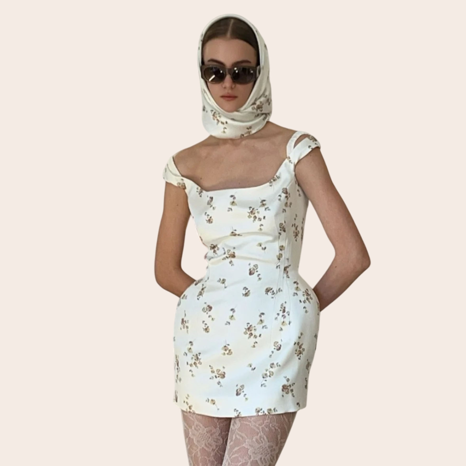 Мини-платье от Magda Butrym, в котором идеально сочетаются современные мотивы, выглядит очень эффектно. Открытые плечи и короткая юбка сшита из белого материала. Следуйте примеру бренда и носите это платье с кружевными колготками и сумкой с ручками.
