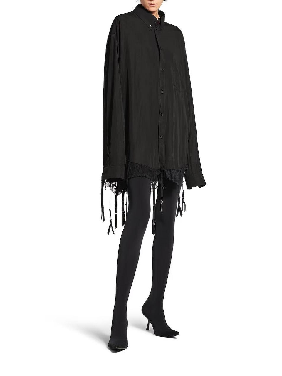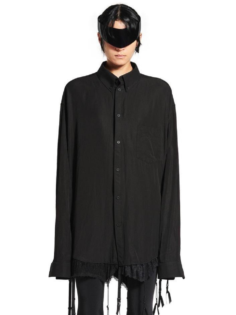 Рубашка Balenciaga, вдохновленная нижним бельем, представляет собой страстный взгляд на традиционный крой. Она сшита из лиоцелл-поплина и украшена бахромой из подтяжек и фестончатым кружевом Leavers. Сочетайте ее с джинсами, чтобы создать непринужденный образ.