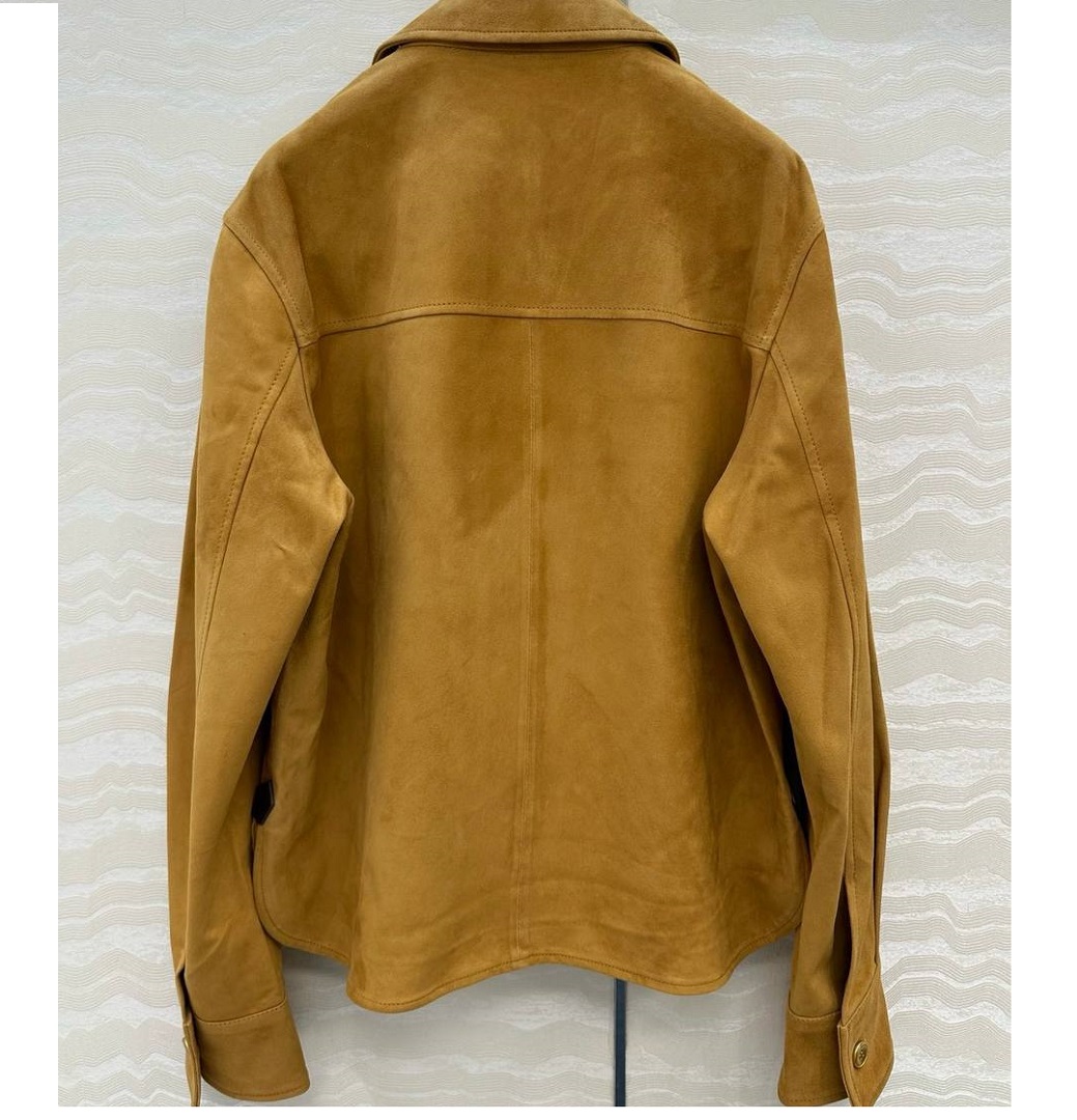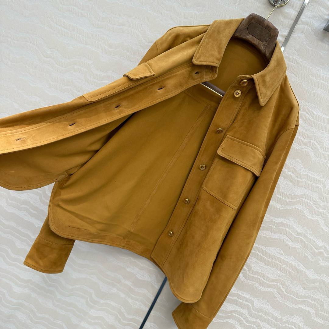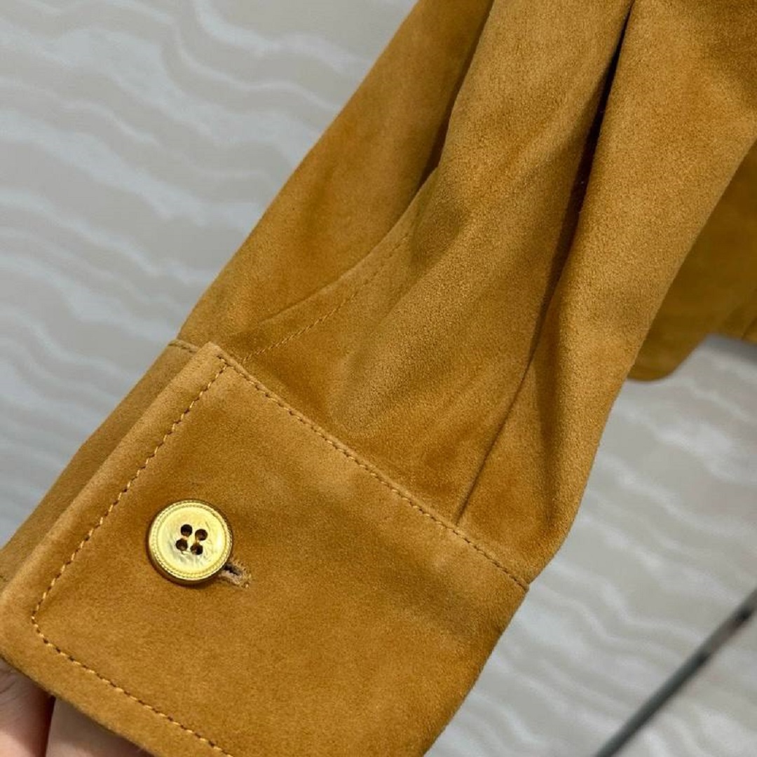 Рубашка от Loro Piana изготовлена из натуральной замши, что делает ее изысканным и в то же время удобным вариантом для теплого времени года. Она слегка свободного кроя, с элегантным воротником и закругленным, чуть более длинным задним краем.