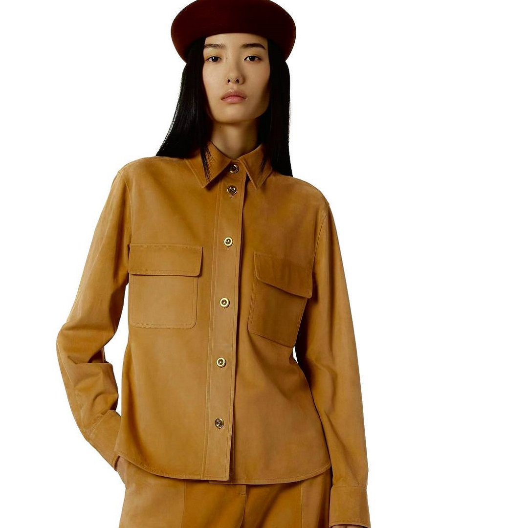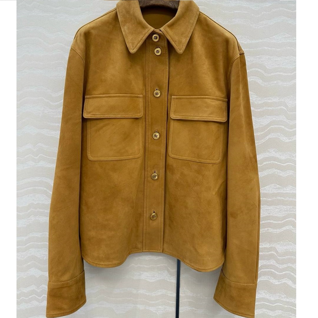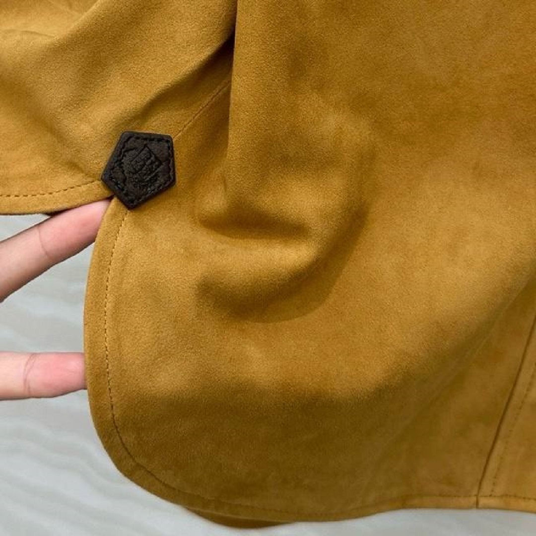Рубашка от Loro Piana изготовлена из натуральной замши, что делает ее изысканным и в то же время удобным вариантом для теплого времени года. Она слегка свободного кроя, с элегантным воротником и закругленным, чуть более длинным задним краем.