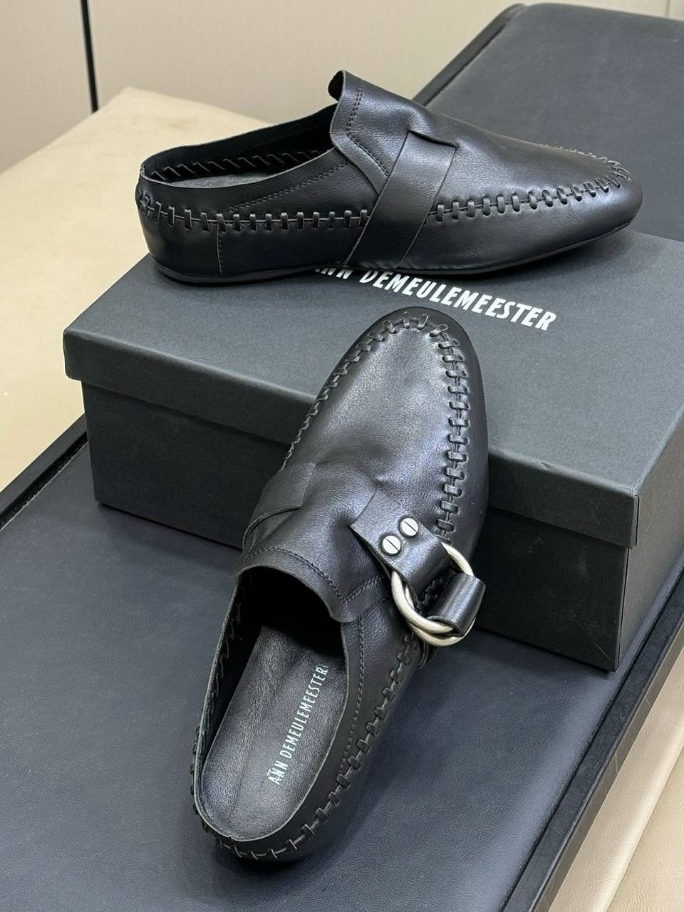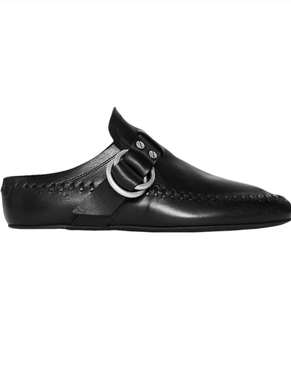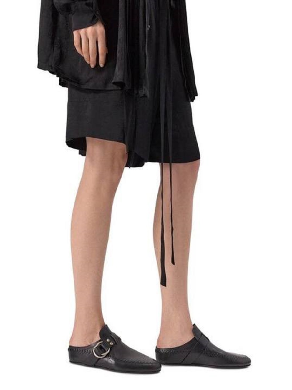 Сабо Ande на тонкой подошве выполнили из гладкой черной кожи. Модель, декорированную стичингом, дополнили широким ремешком с заклепками-винтами и кольцами из серебристого металла.