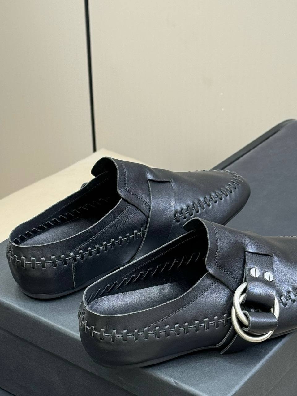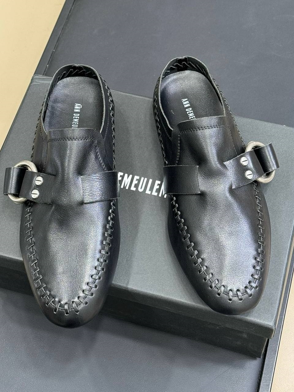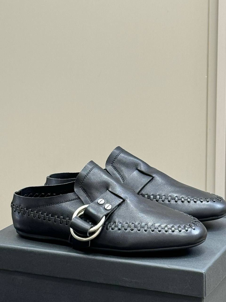 Сабо Ande на тонкой подошве выполнили из гладкой черной кожи. Модель, декорированную стичингом, дополнили широким ремешком с заклепками-винтами и кольцами из серебристого металла.