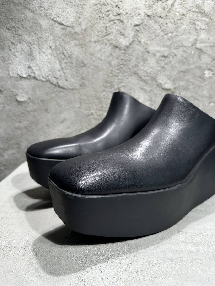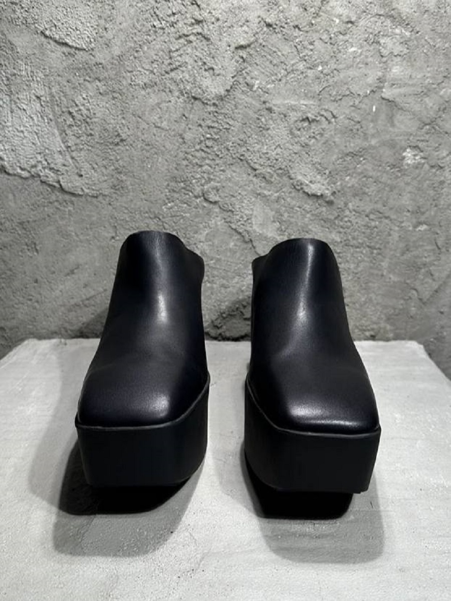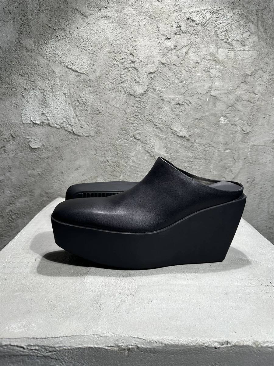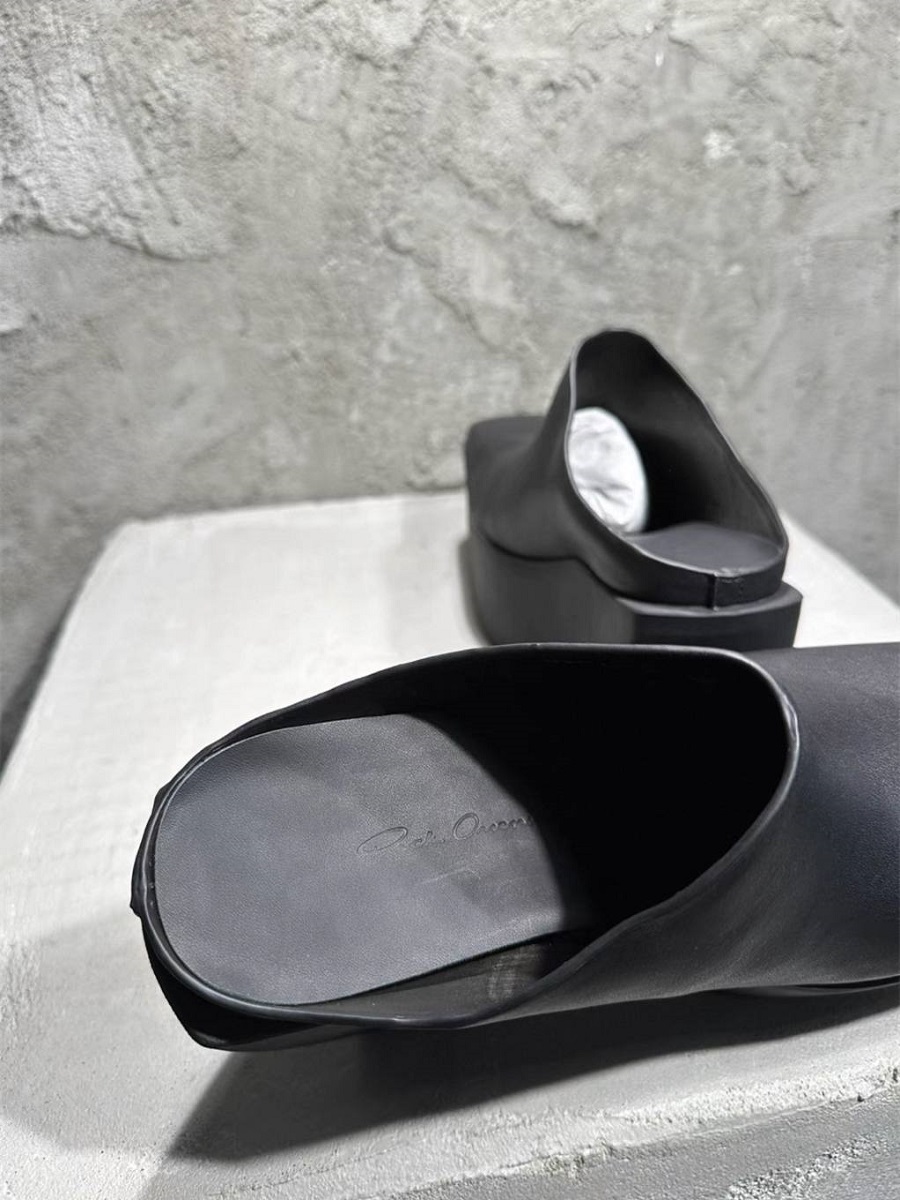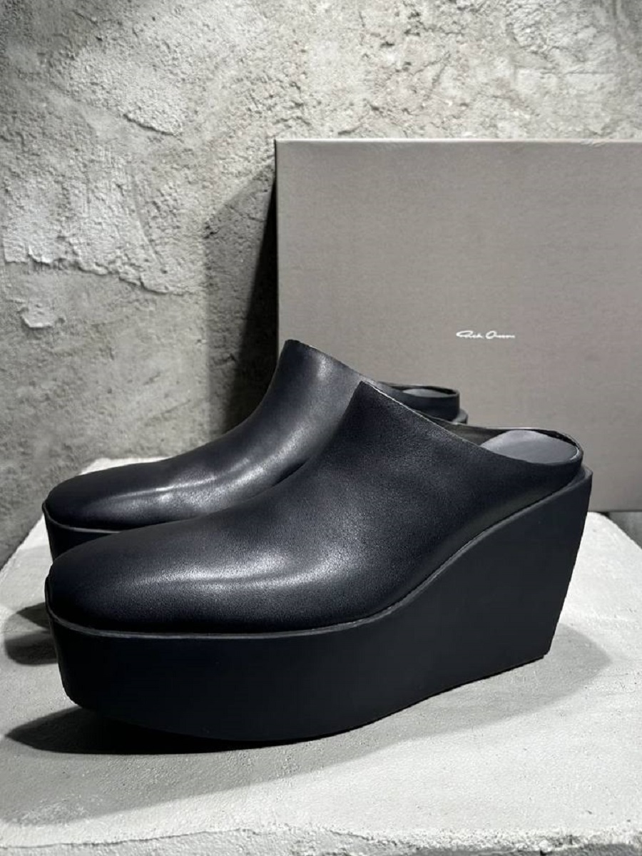 Сабо Rick Owens выполнены из натуральной кожи в черном цвете. Данная модель на высокой подошве с закрытым закругленным носком. Носить сабо можно с шортами, джинсами, а так же юбкой.