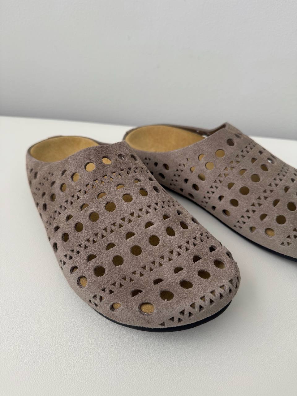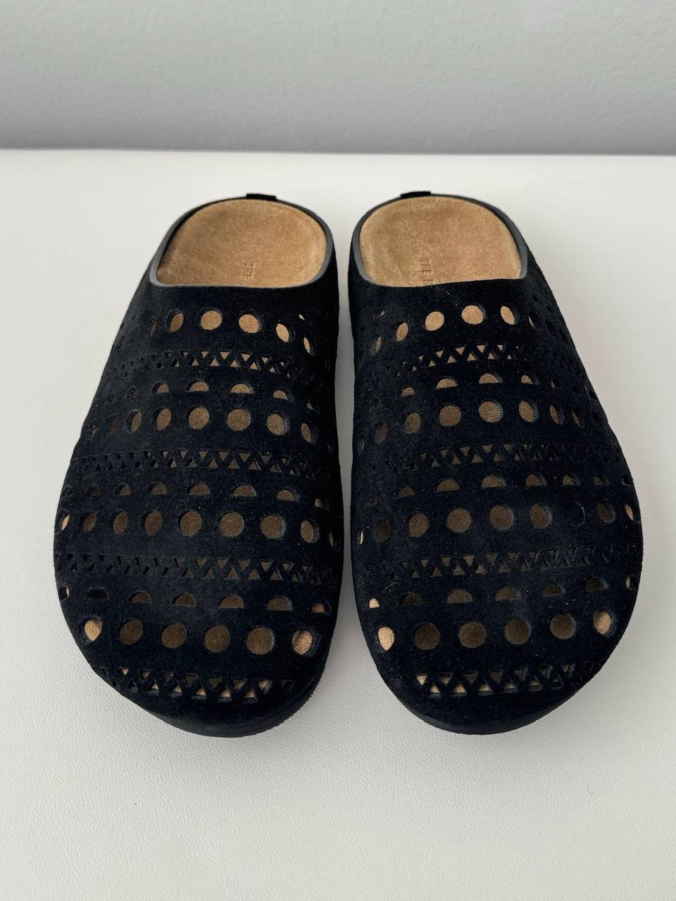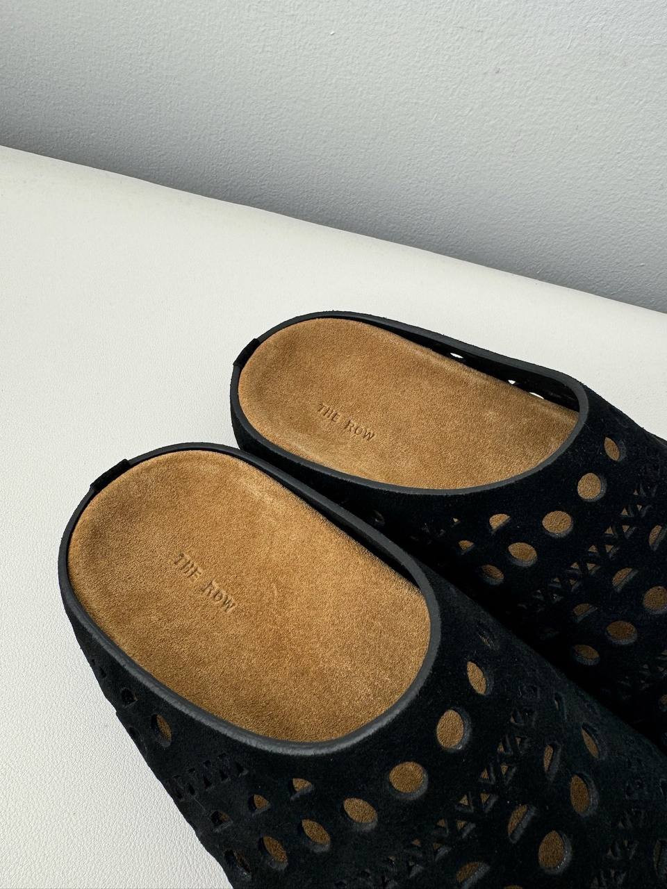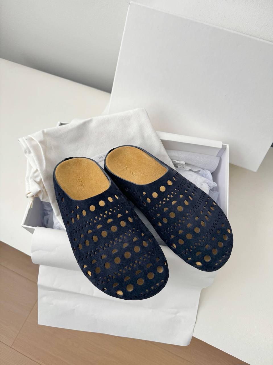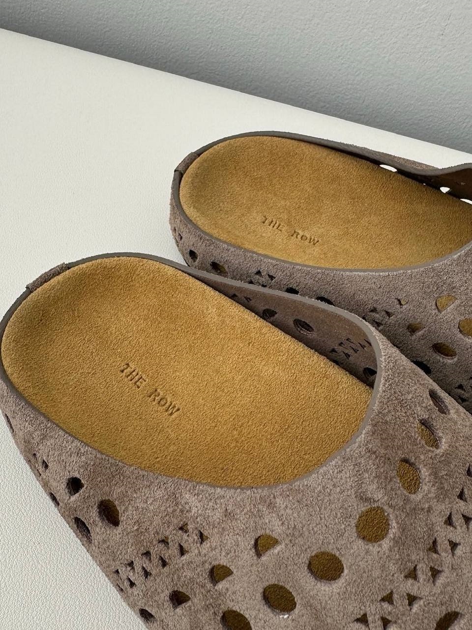 Сабо The Row замшевые, созданные по образцу архивных стилей 70-х, украшены вырезами кругами. Они установлены на плоской подошве и подойдут ко всему: от платьев до шорт по фигуре.