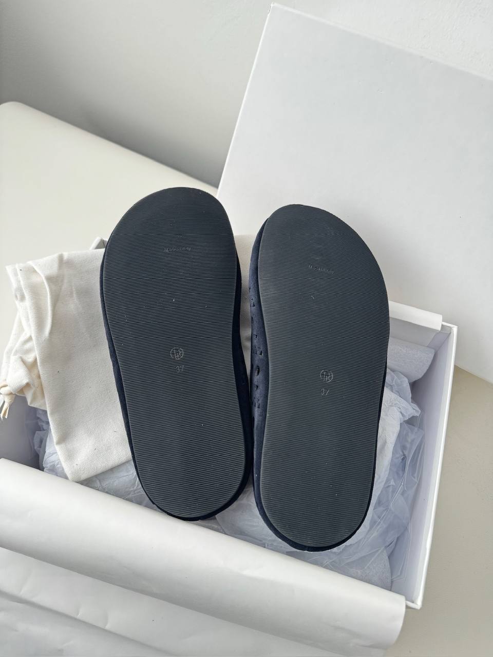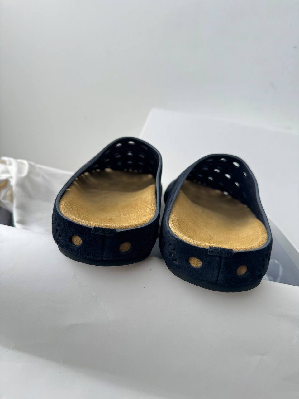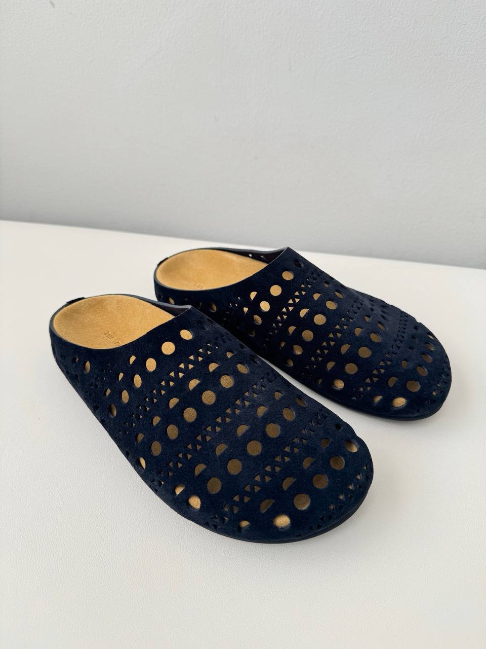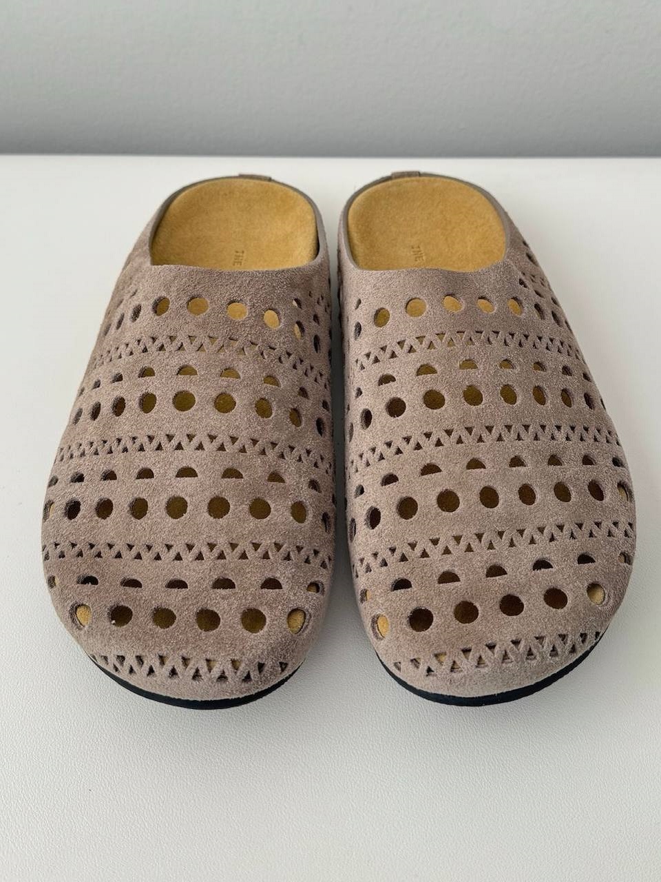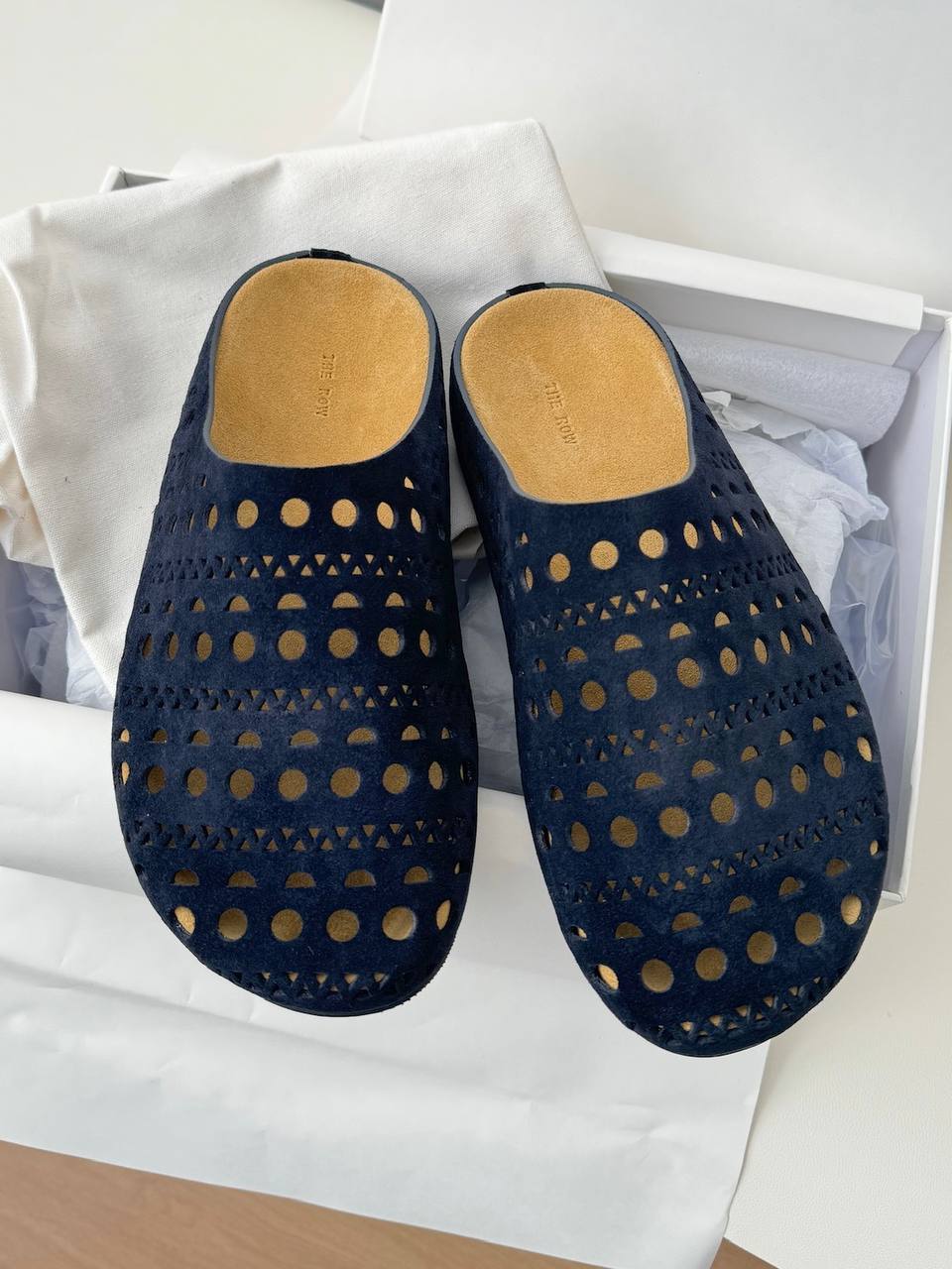 Сабо The Row замшевые, созданные по образцу архивных стилей 70-х, украшены вырезами кругами. Они установлены на плоской подошве и подойдут ко всему: от платьев до шорт по фигуре.