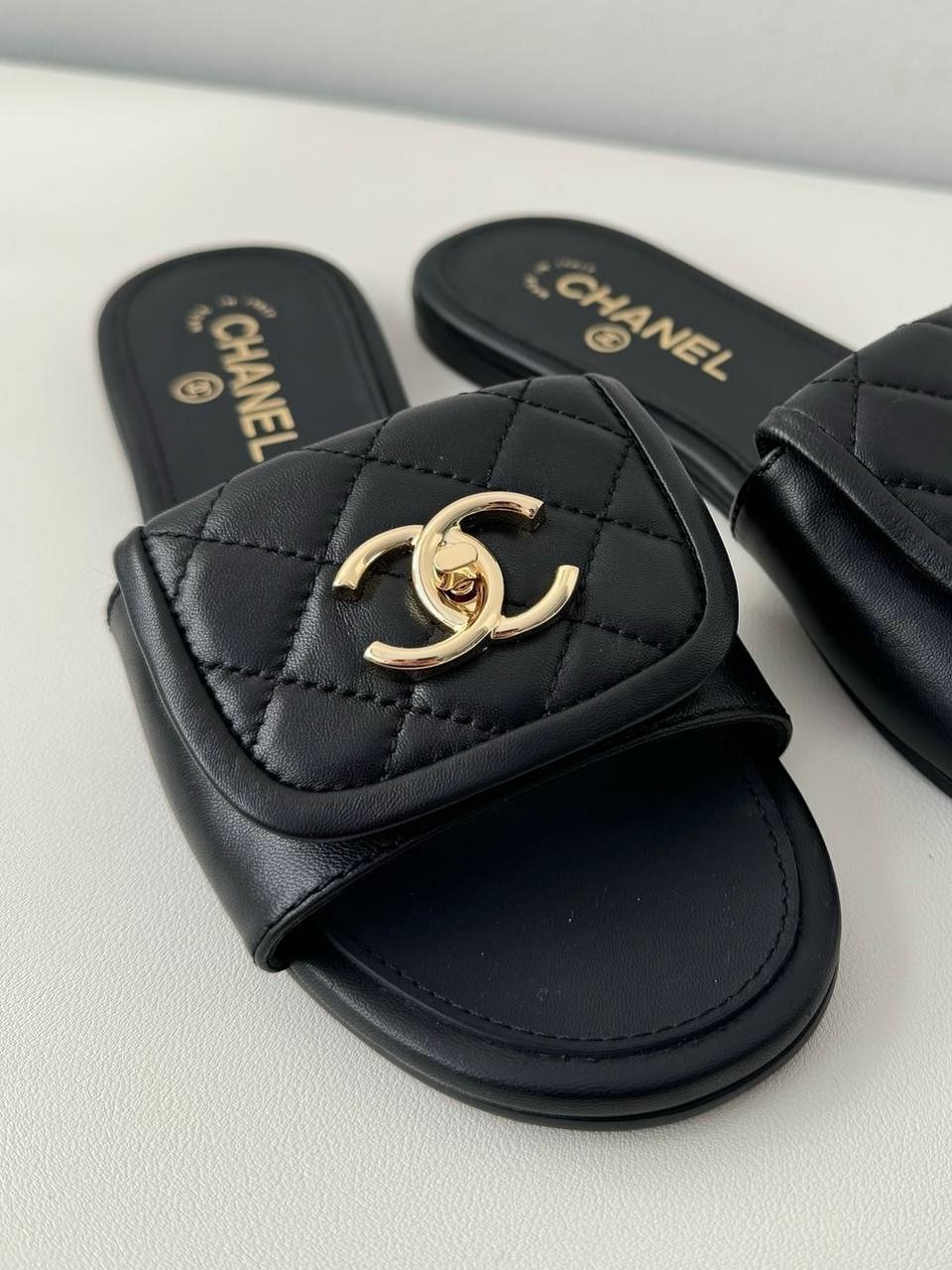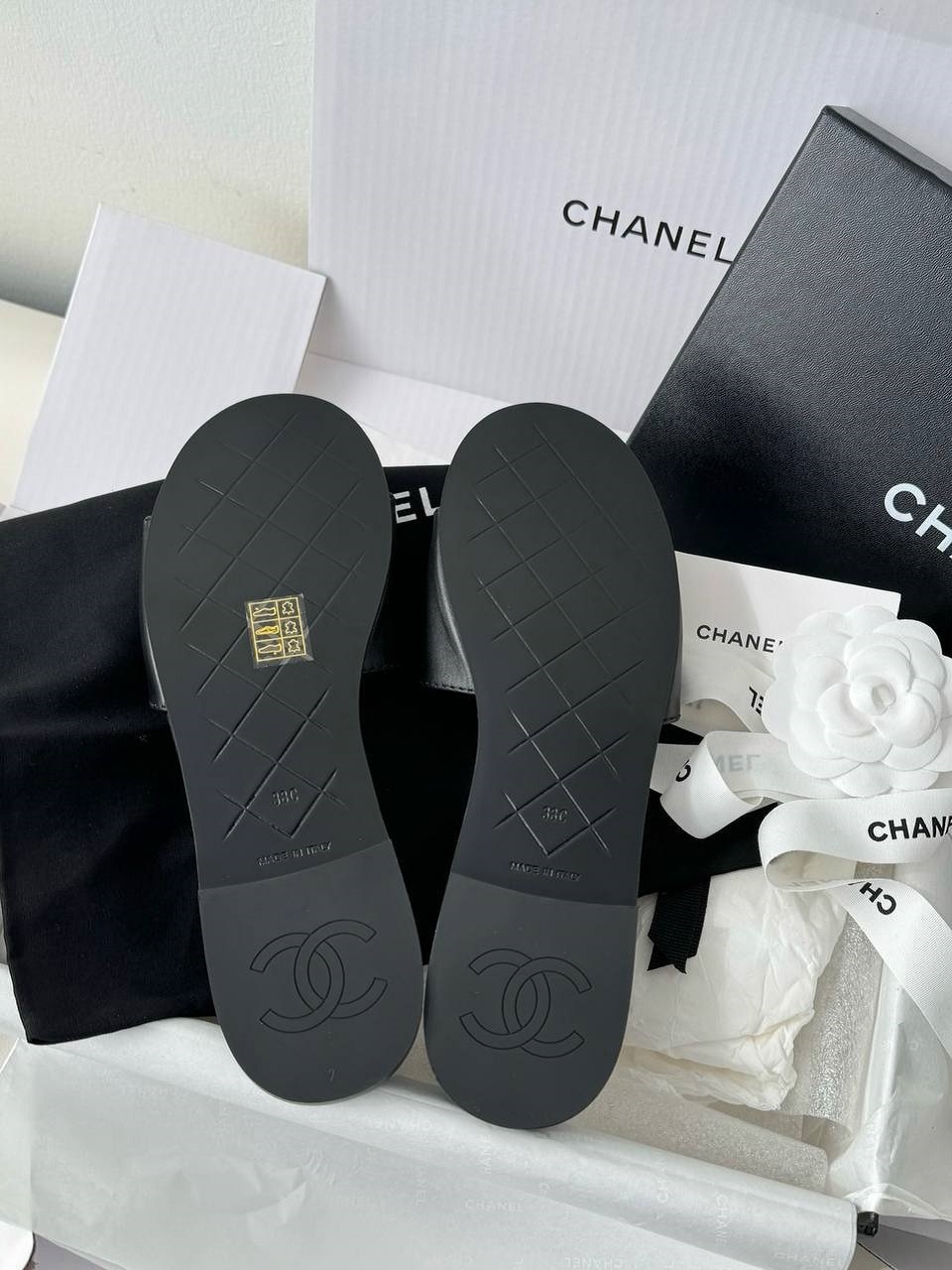 Сандалии Chanel сделаны в Италии из гладкой кожи черном цвете. Они имеют небольшой каблук и украшены золотым логотипом.
