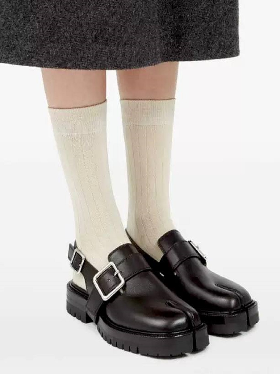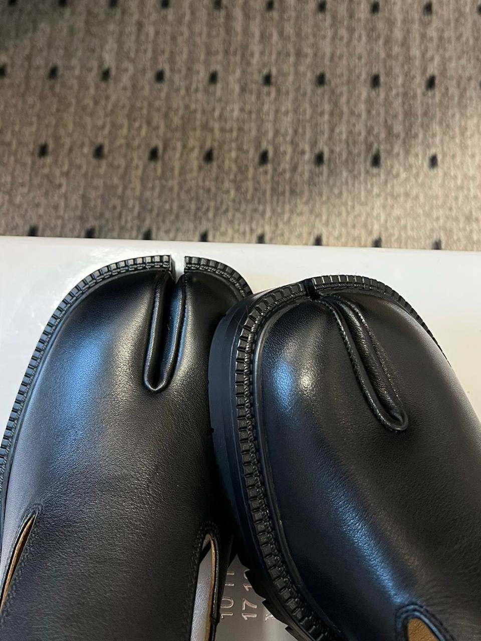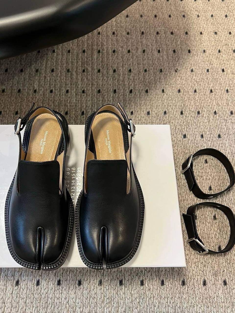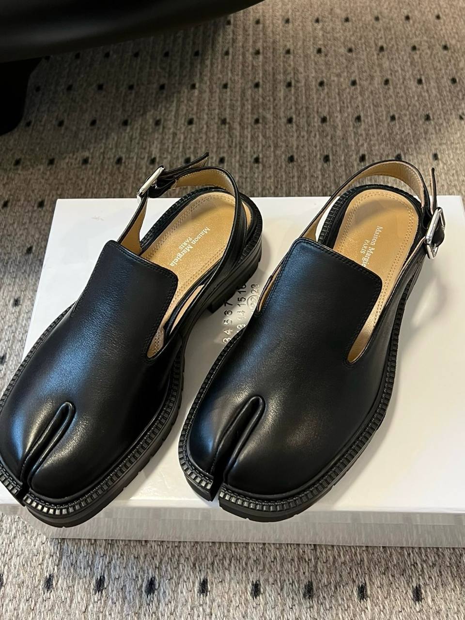 Сандалии таби Maison Margiela выполнены из натуральной кожи в черном цвете. Они имеют знаковый раздвоенный носок, ремешок на щиколотке с пряжкой и наборную подошву. Внутри сандалии с кожаной стелькой и логотипом.