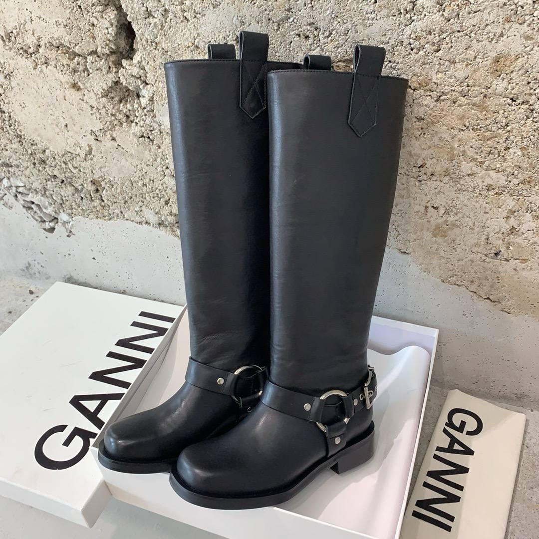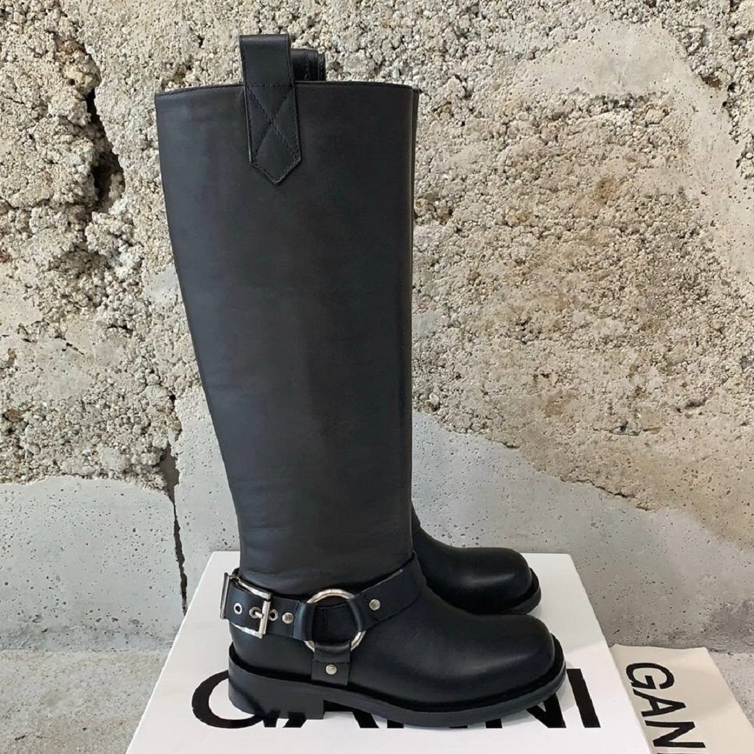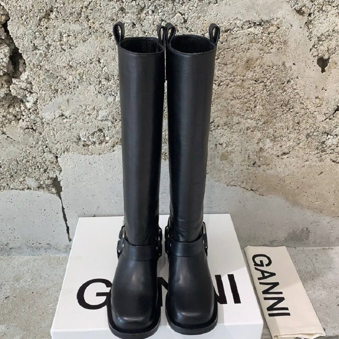 Сапоги Ganni сделаны из натуральной кожи. Высокие сапоги на небольшом каблуке с квадратным закругленным носком, украшены ремешком. Купив данную модель вы дополните свой образ.