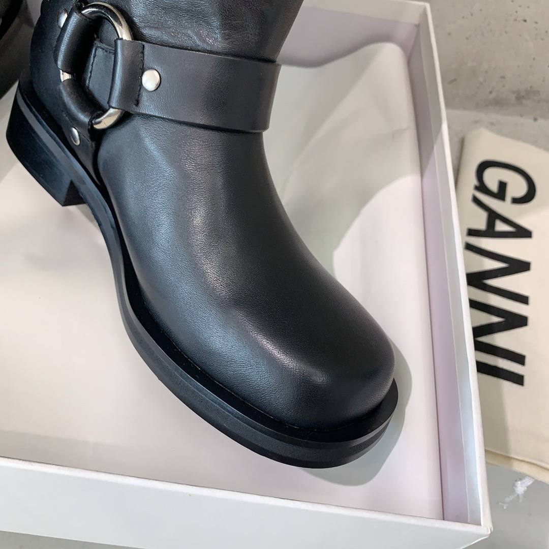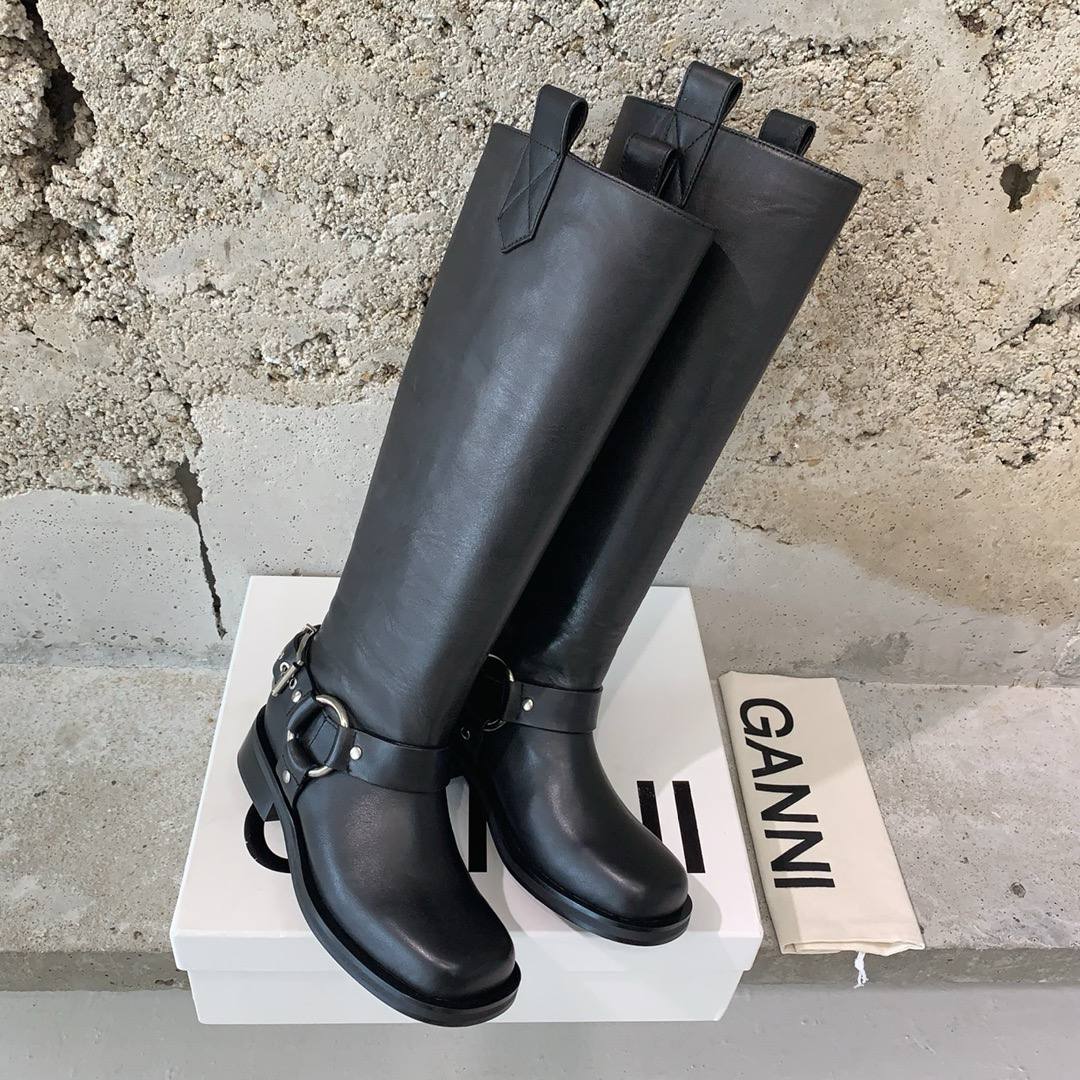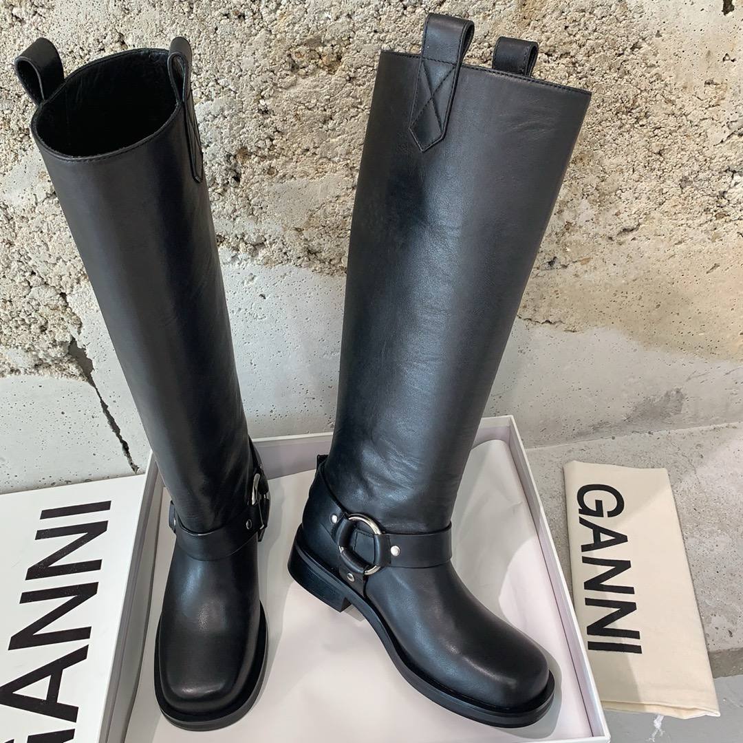 Сапоги Ganni сделаны из натуральной кожи. Высокие сапоги на небольшом каблуке с квадратным закругленным носком, украшены ремешком. Купив данную модель вы дополните свой образ.