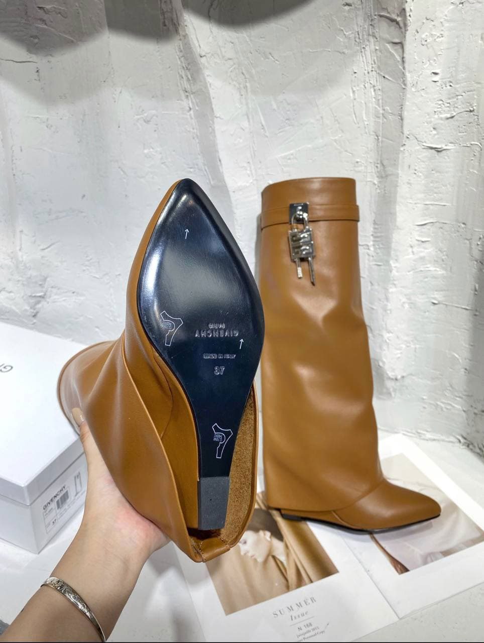 Легендарные сапоги Givenchy SHARK LOCK без застежки из зернистой телячьей кожи в новой интерпретации. Кожаный ремешок с металлической застежкой GIVENCHY вокруг ноги, с асимметричными замками 4G с серебряной отделкой по бокам. Ботинки с миндалевидным носком. Обтянутые каблуки на танкетке. Цвета: черный, рыжий, светло-рыжий, молочный, голубой. Высота каблука: 9,5 см.