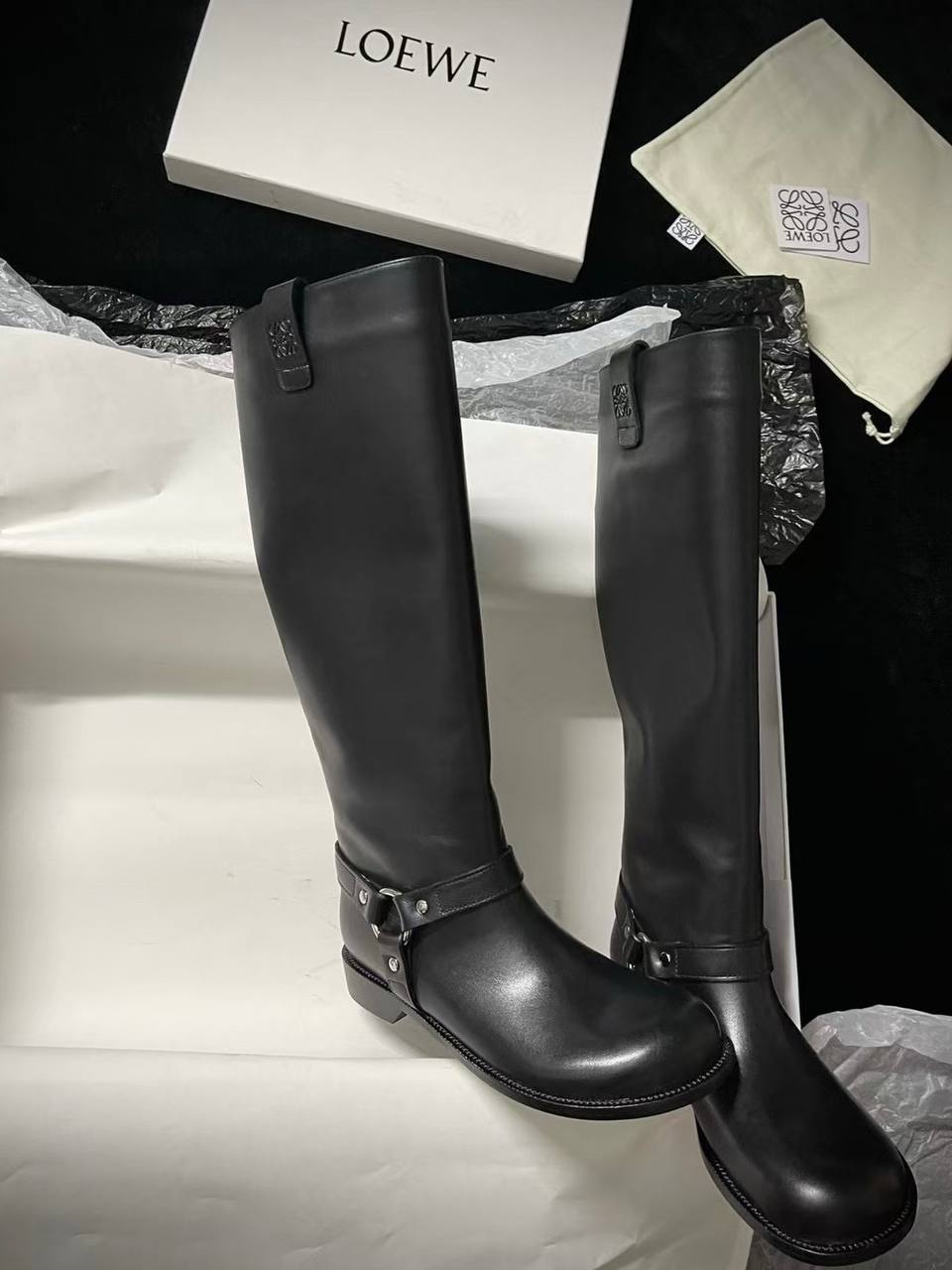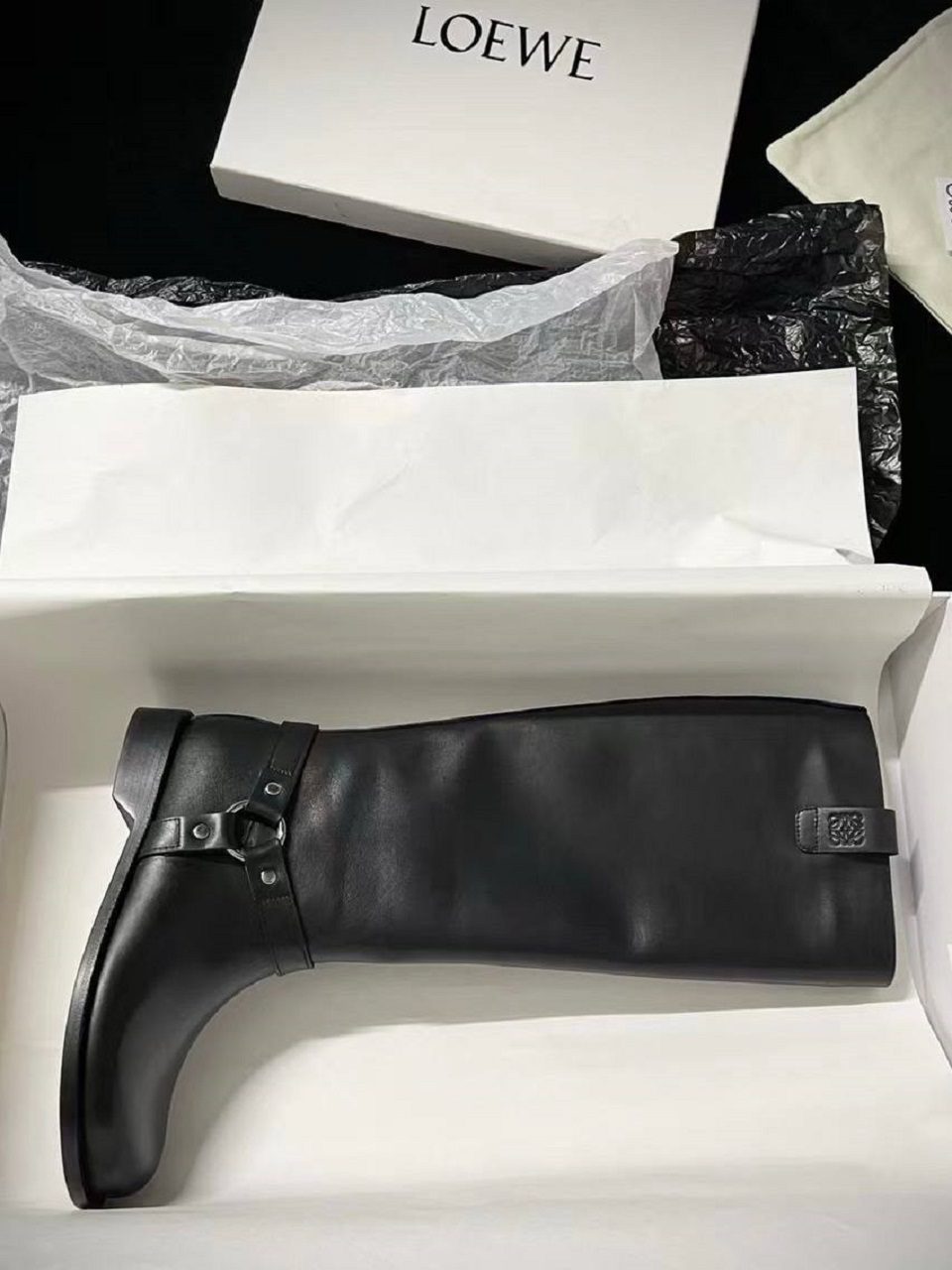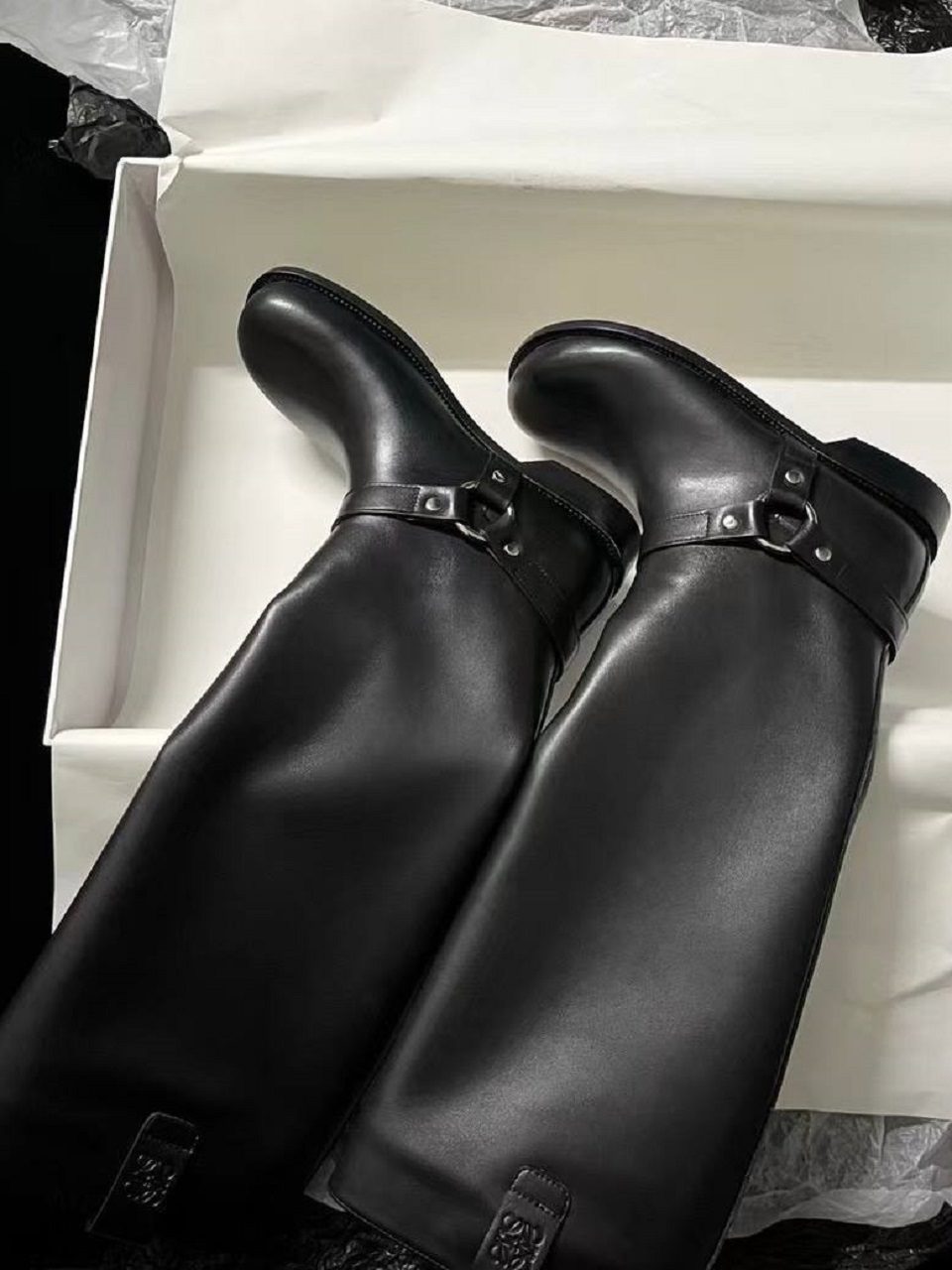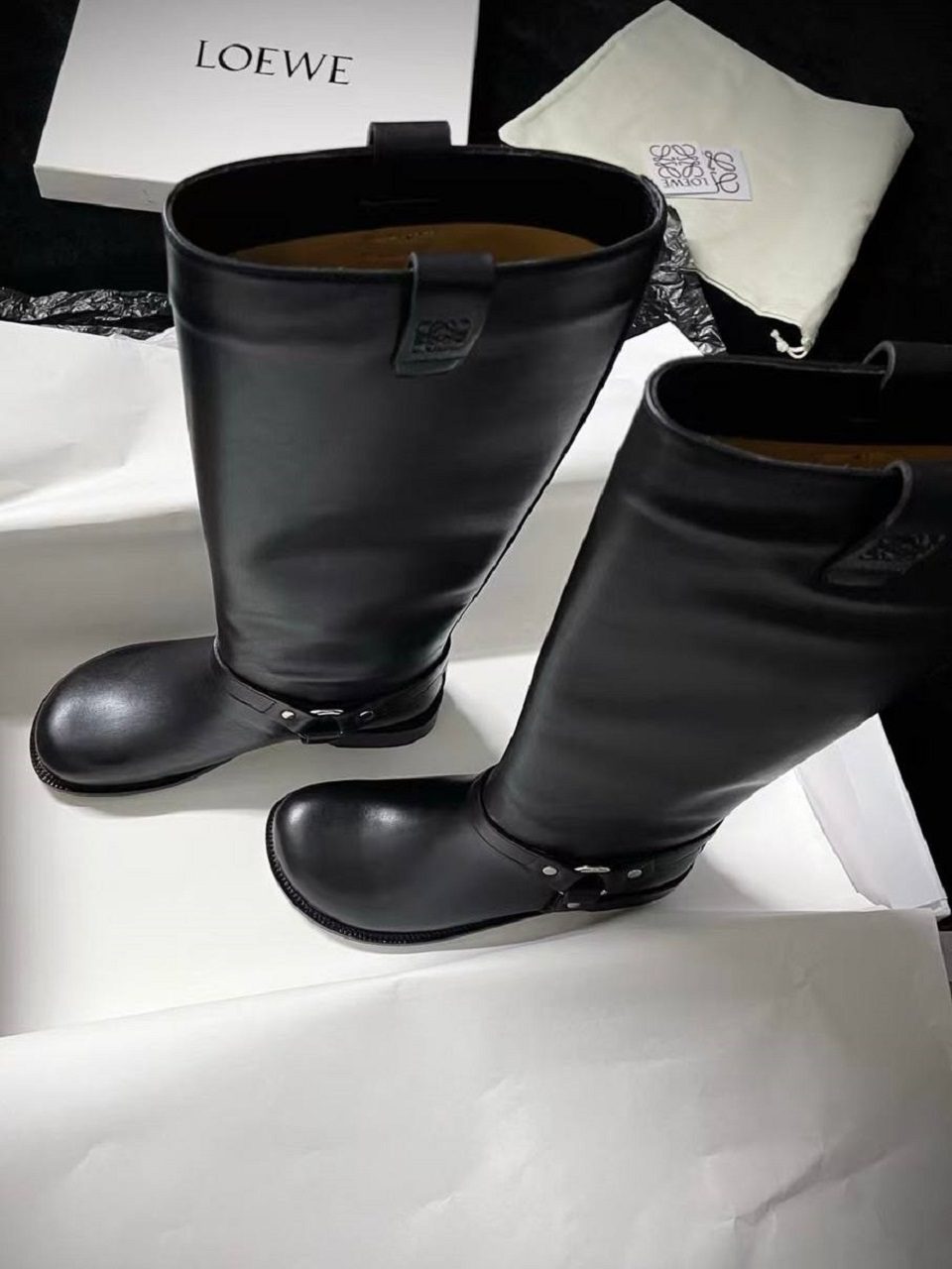 Сапоги Loewe сделаны из натуральной кожи. Данная модель до колен в черном цвете имеет закругленный носок и украшена внизу ремешком. Купив сапоги Loewe вы дополните свой образ.