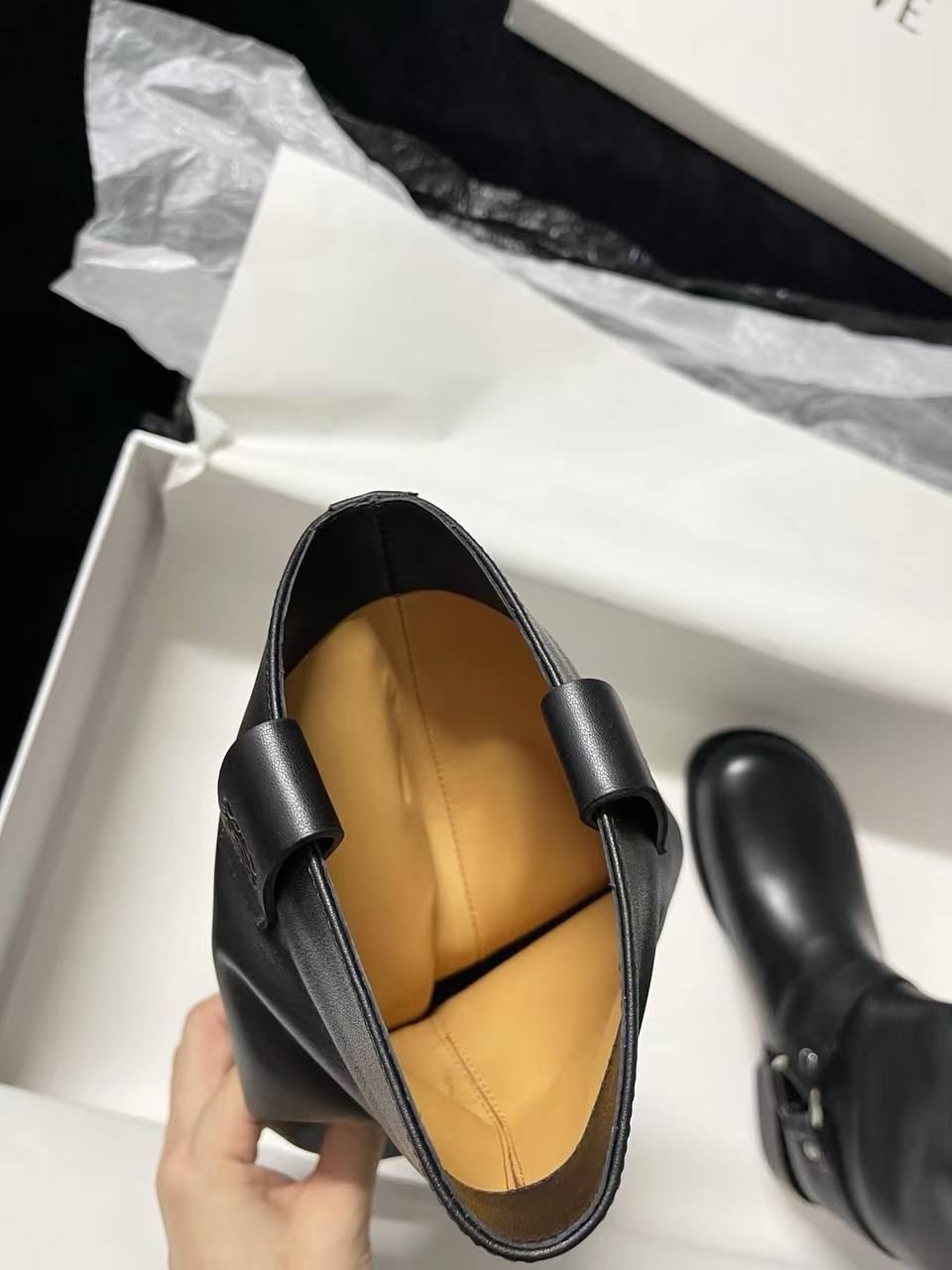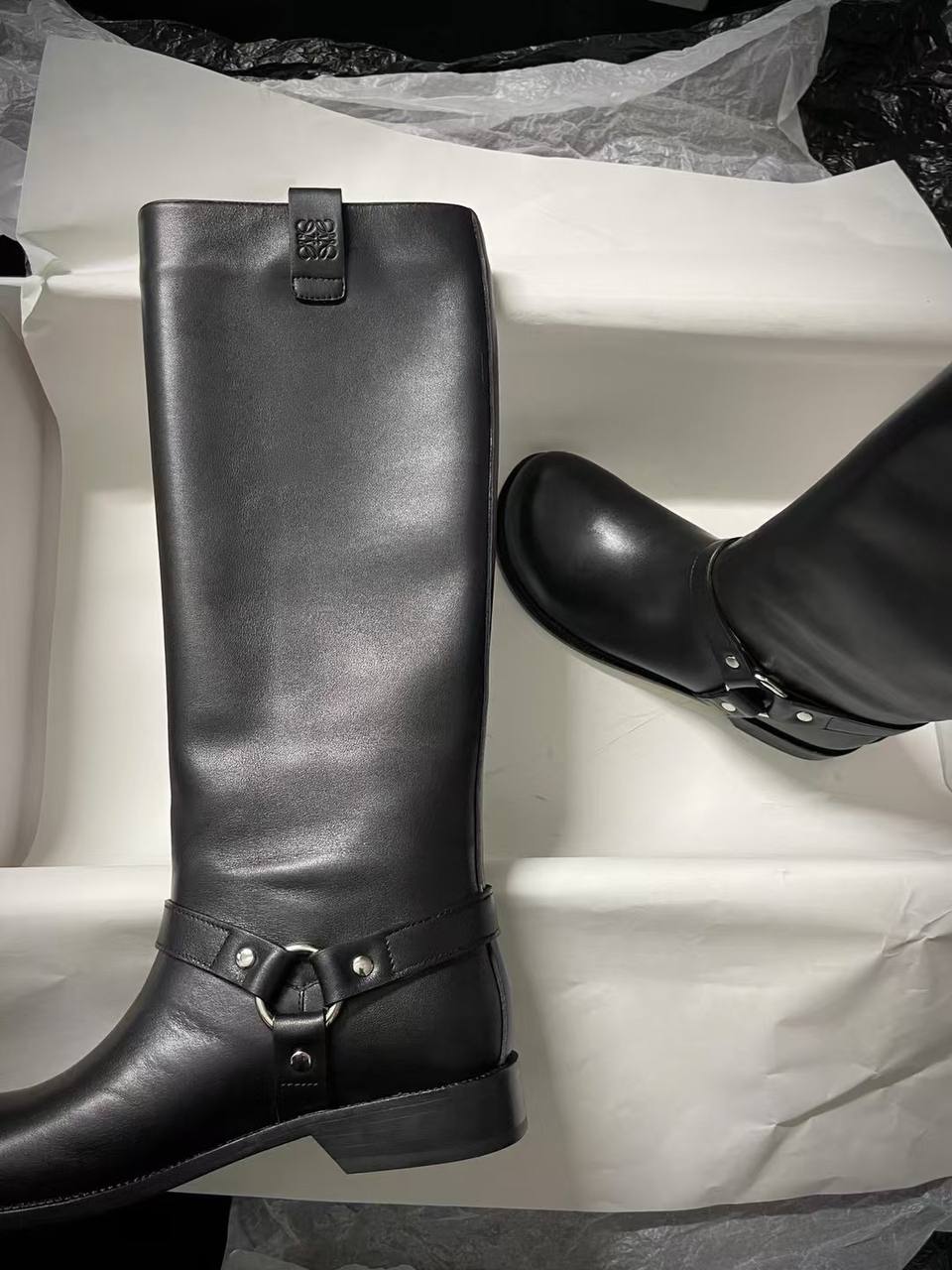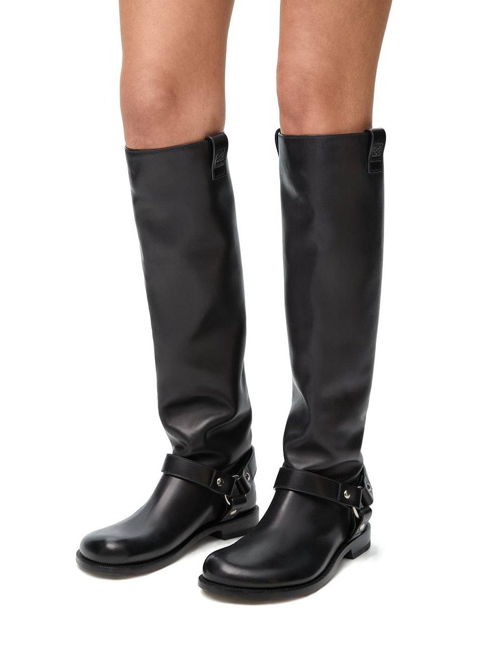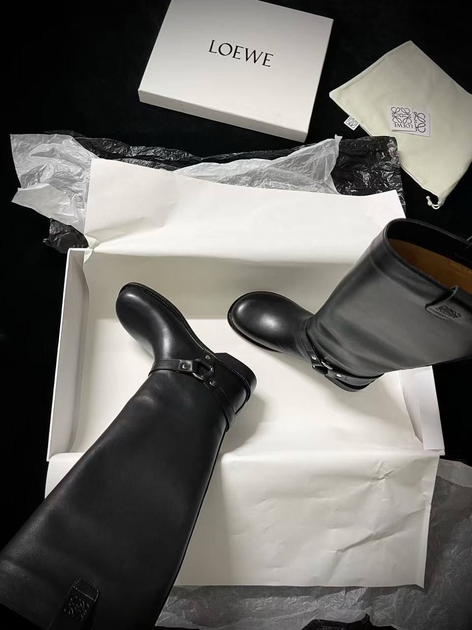 Сапоги Loewe сделаны из натуральной кожи. Данная модель до колен в черном цвете имеет закругленный носок и украшена внизу ремешком. Купив сапоги Loewe вы дополните свой образ.