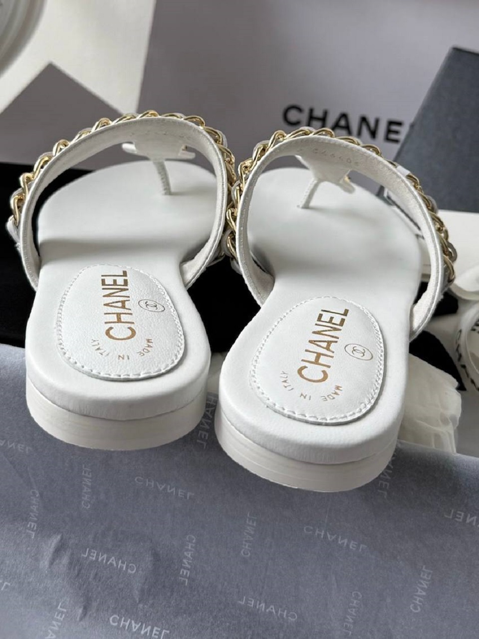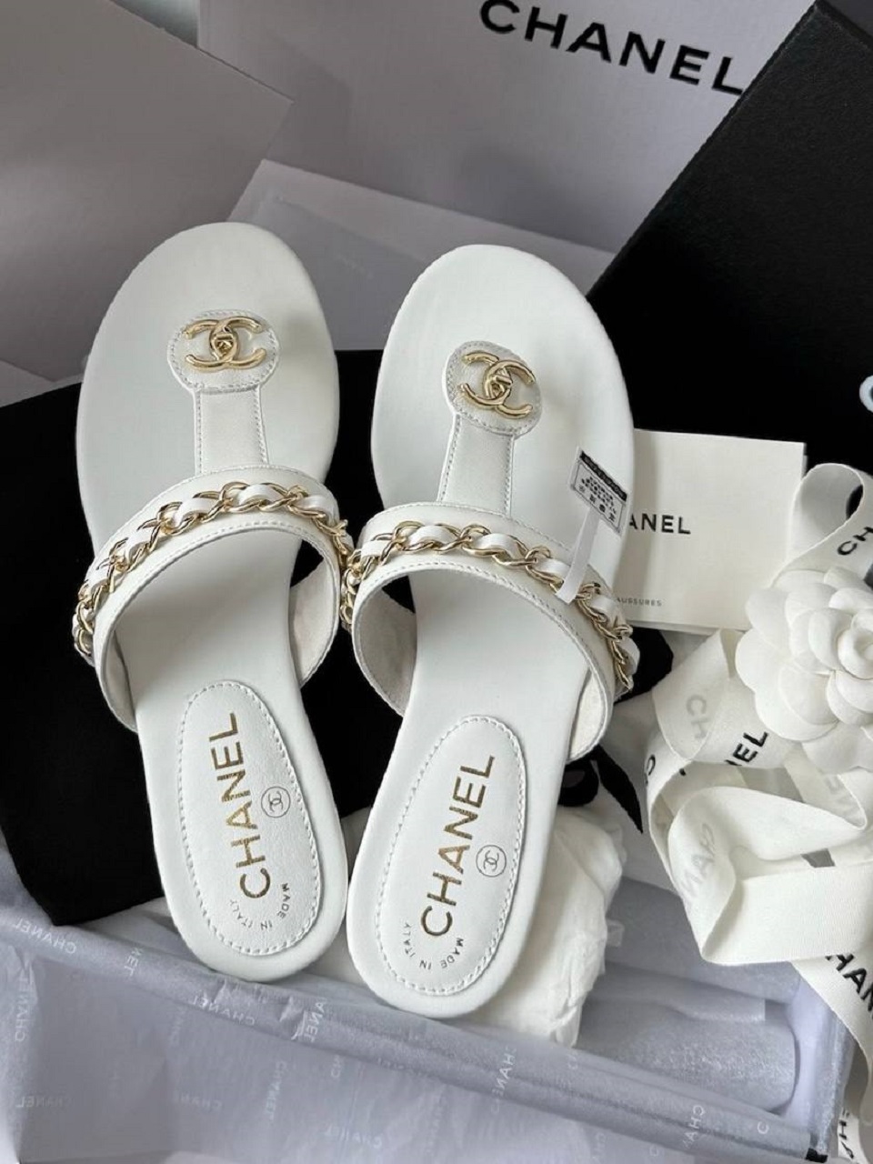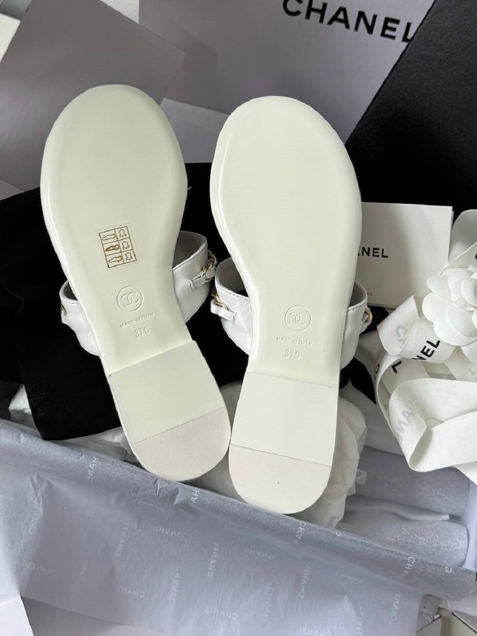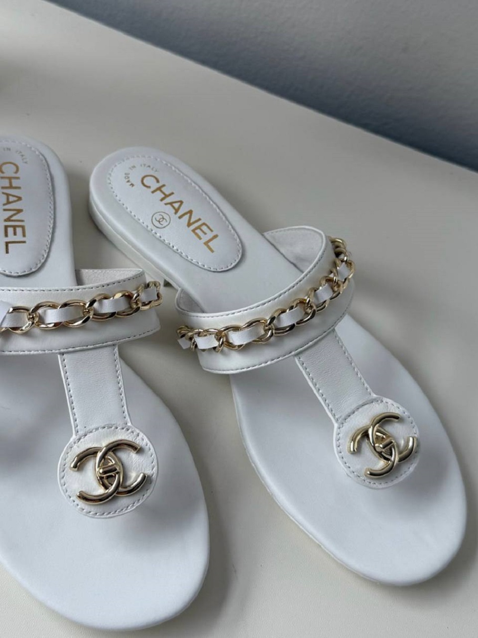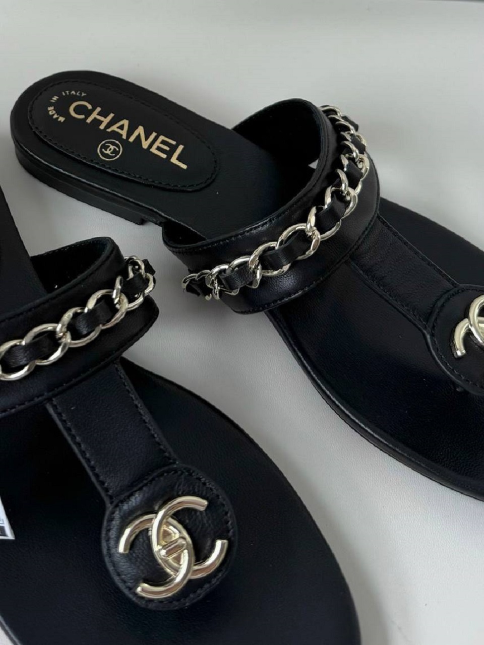 Стильные женские шлёпанцы идеально подходят для пляжа и прогулок, используются и в качестве домашней обуви. Шлепанцы Chanel выполнены из натуральной кожи в черном и белом цвете, украшены они логотипом бренда и цепочками.
