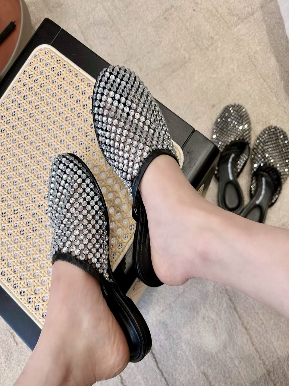 Шлёпанцы Alexander Wang предлагают массу гламура без ущерба для комфорта. Сделанные в Италии из черной кожи, они украшены десятками блестящих кристаллов и имеют прозрачные сетчатые вставки. Завершите образ глянцевым педикюром.