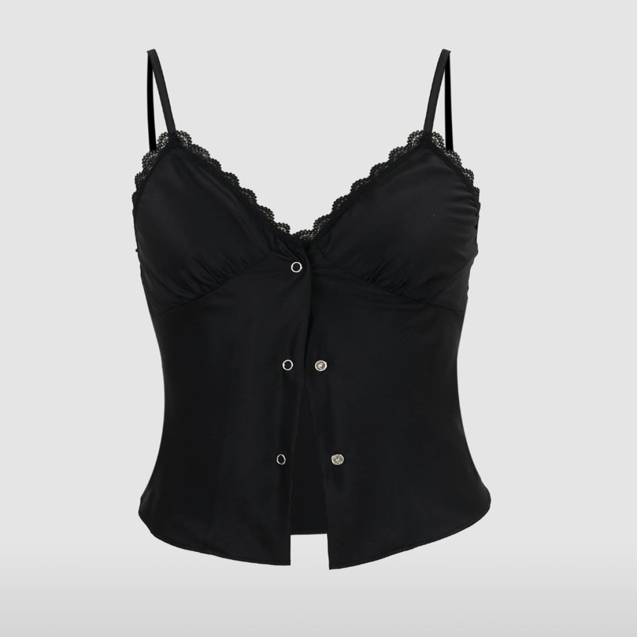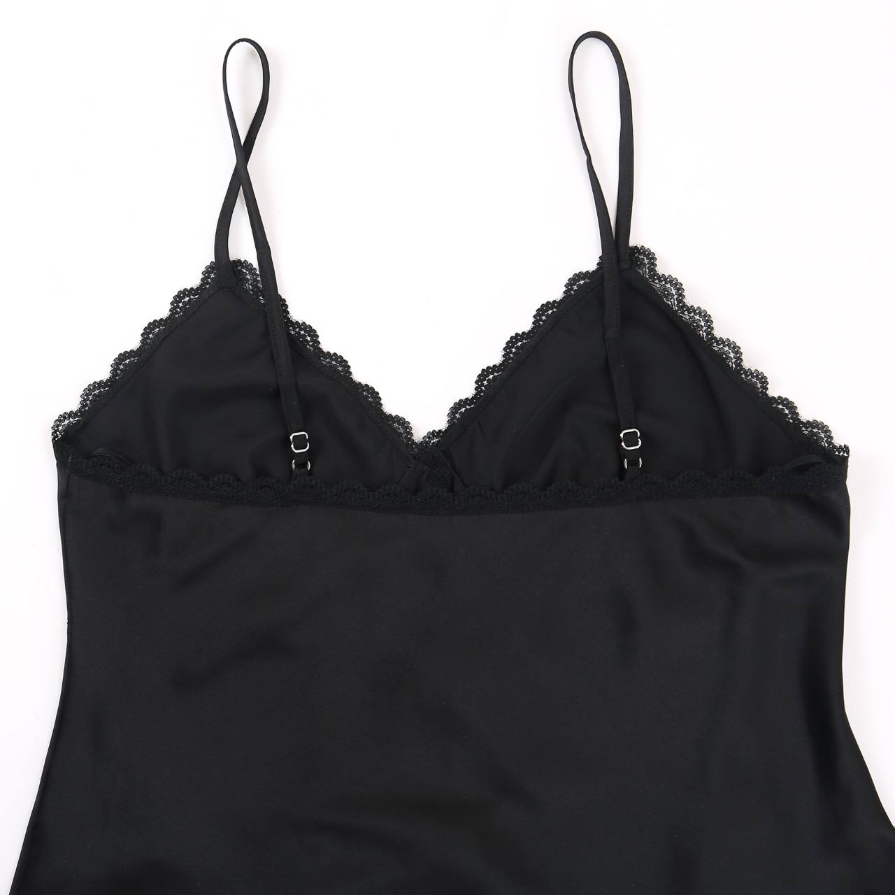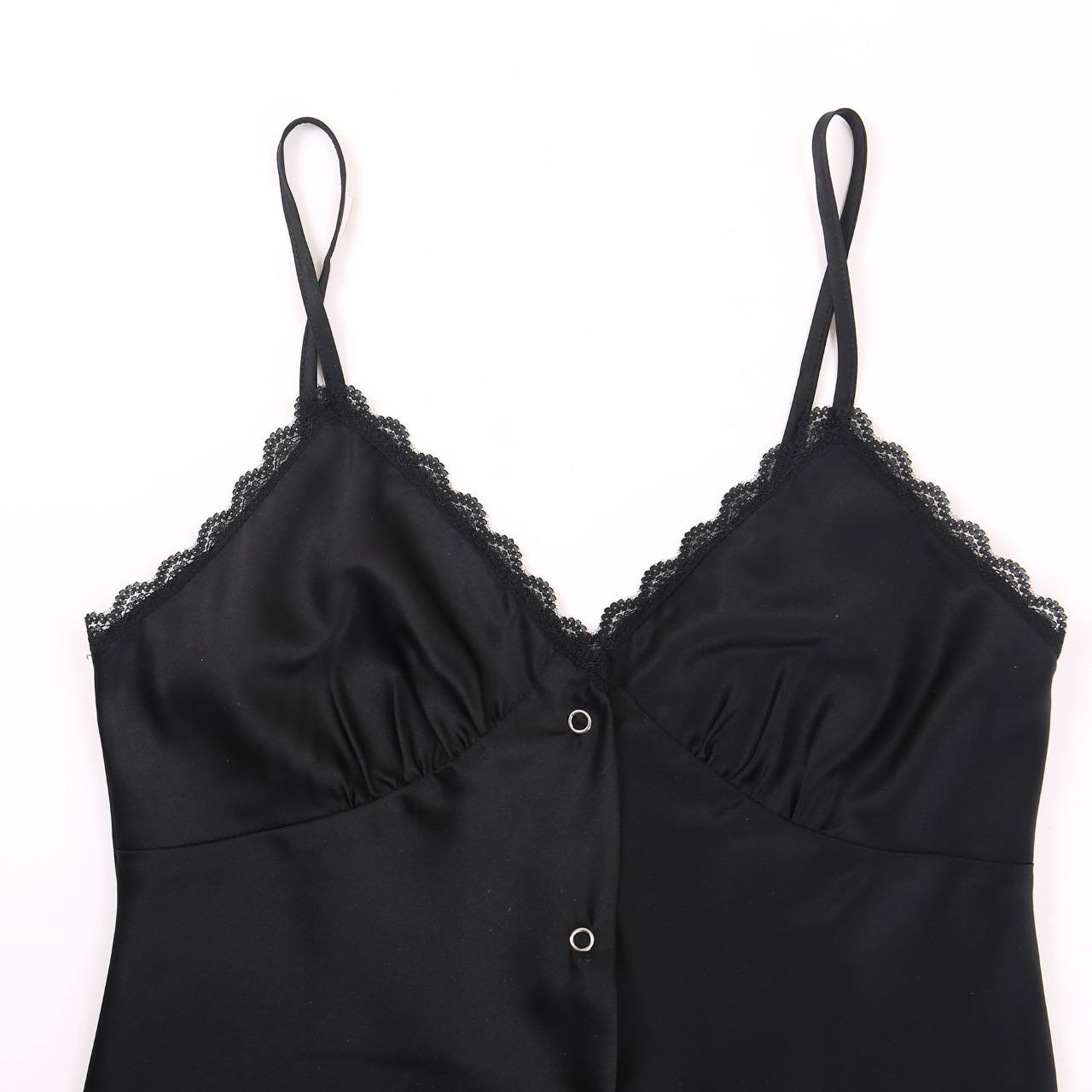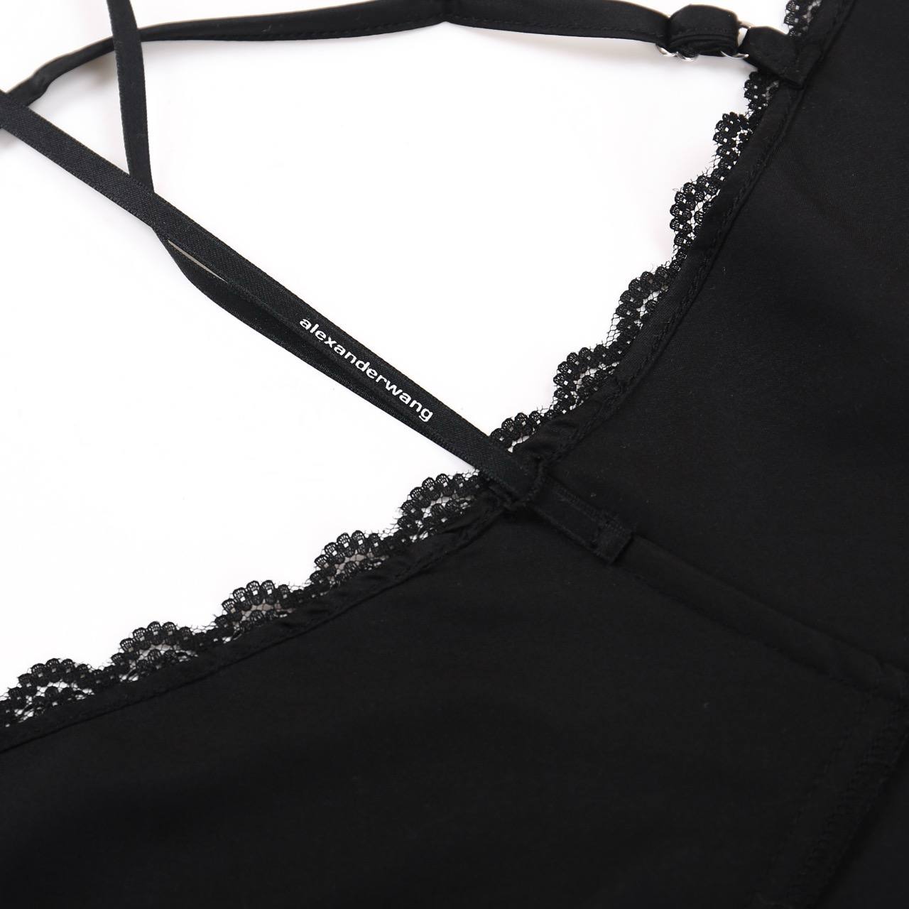 Топ Alexander Wang выполнен в черном цвете на тонких бретелях. Он застегивается на кнопках спереди с треугольными чашками с кружевными отделками. Носить топ можно с шортами, джинсами, а так же юбкой.