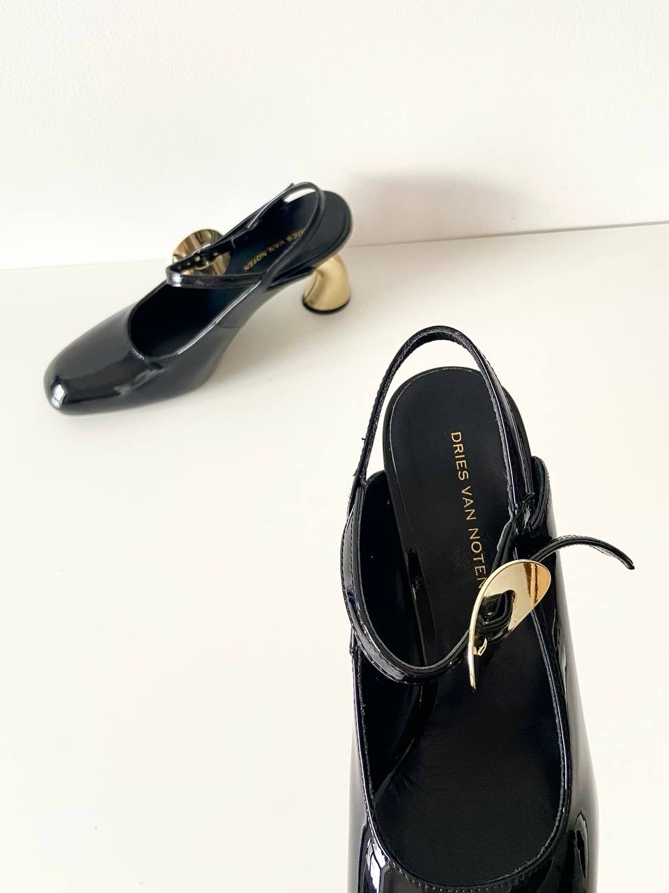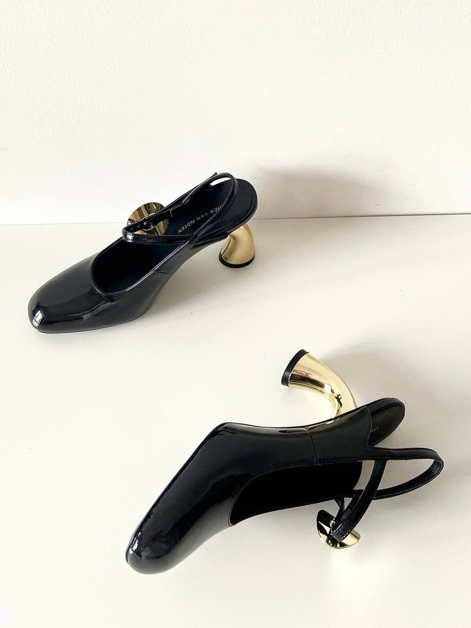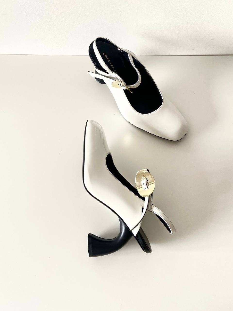 Туфли Dries Van Noten сделаны из натуральной кожи на каблуке. Данная модель имеет необычный каблук и застежку сбоку. Купить туфли Dries Van Noten можно в двух цветах: черный, белый.