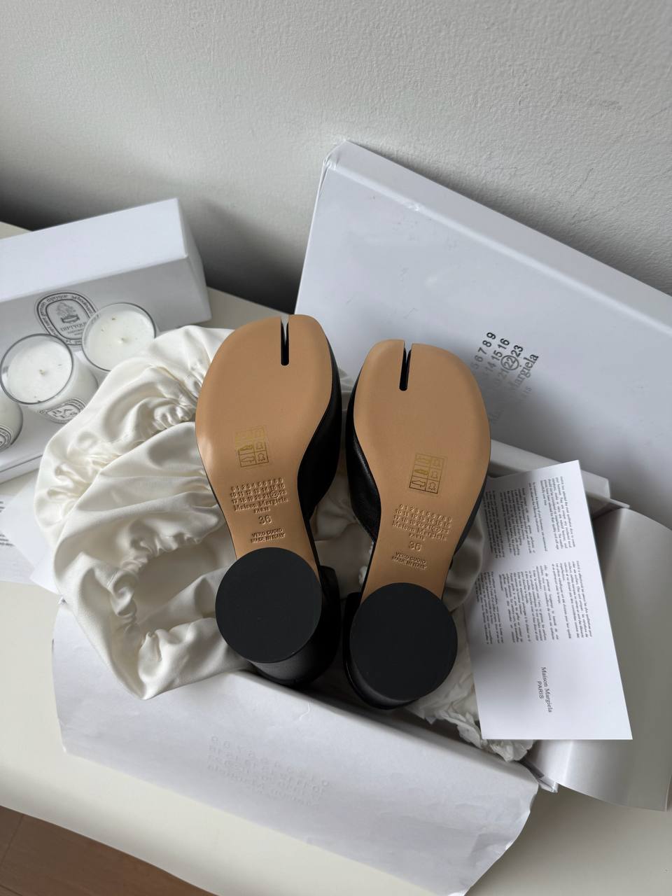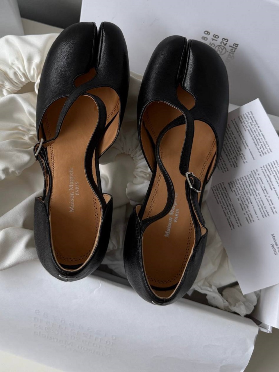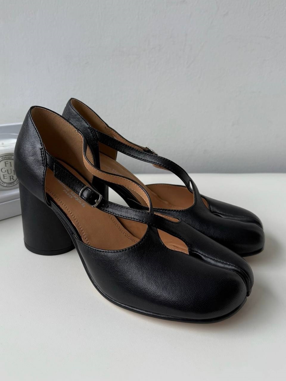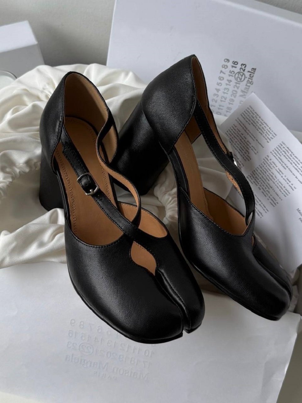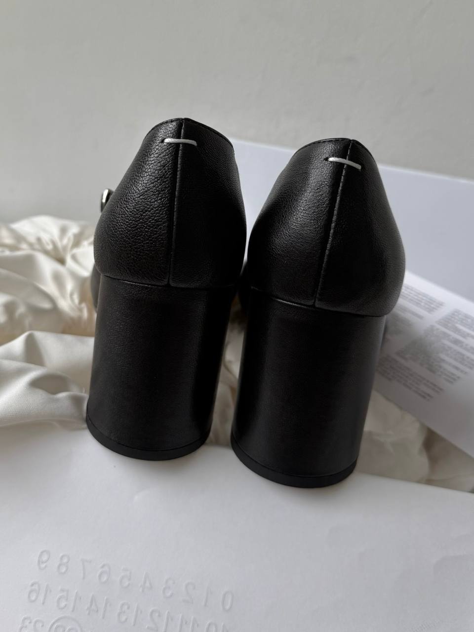 Туфли Maison Margiela выполнены из черной натуральной кожи. Они на устойчивом каблуке и украшены переплетами с застежкой.