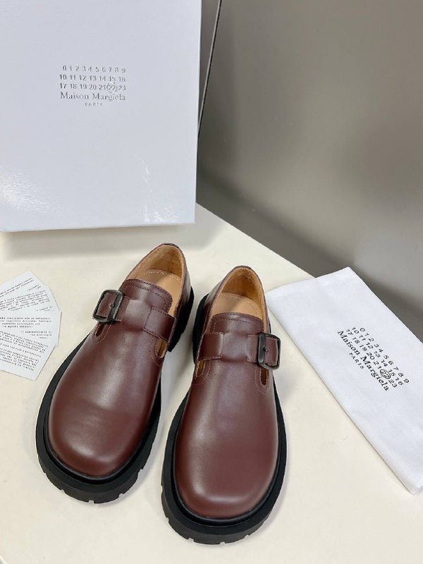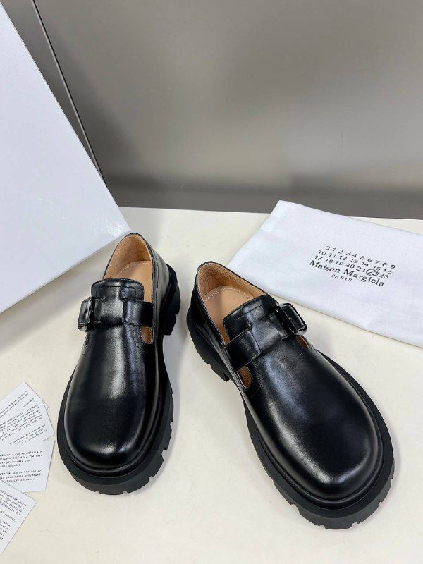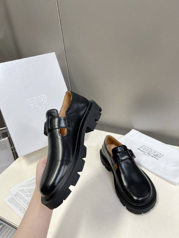 Туфли Maison Margiela женские сделаны из 100% натуральной кожи. Модель с закругленным носком на массивной подошве сверху есть ремешок, который регулируется. купить туфли можно в двух цветах: черный, коричневый.