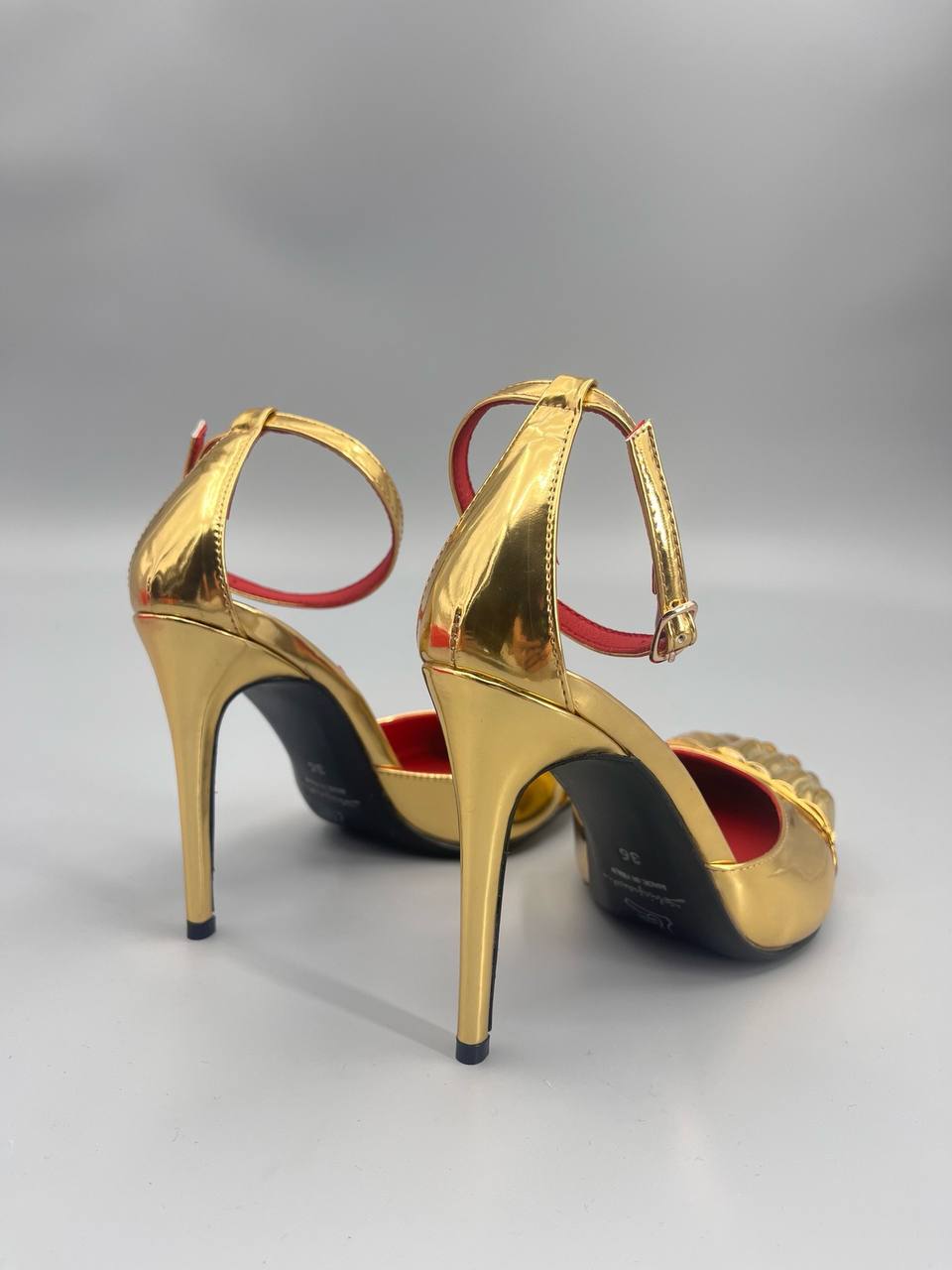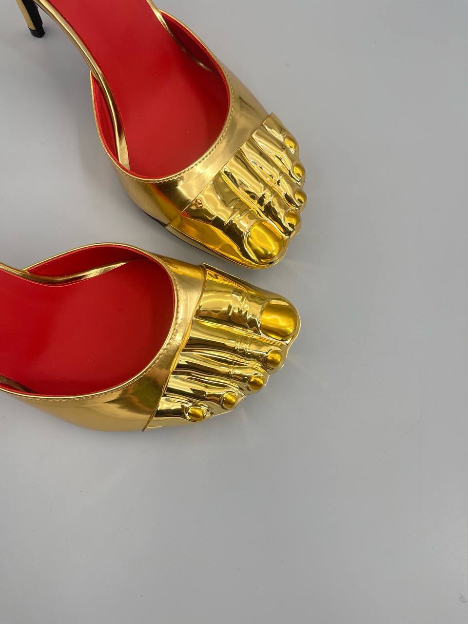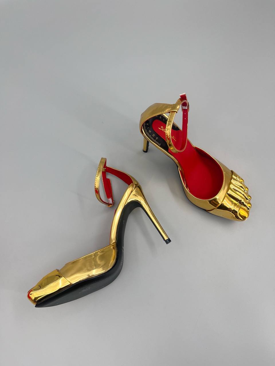 Изысканные и в то же время летние, эти золотые атласные туфли из лёгкого золотистого ПВХ, который повторяет форму стопы, не утяжеляя её. Открытый, воздушный крой и каблук высотой 105 мм подчёркивают изгиб ноги.