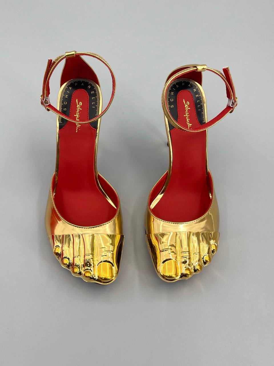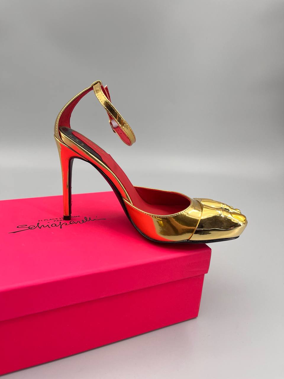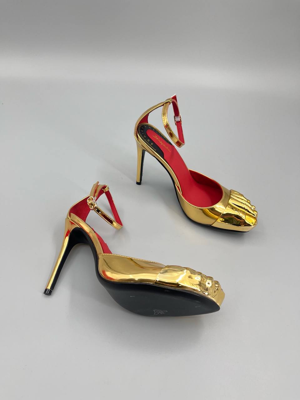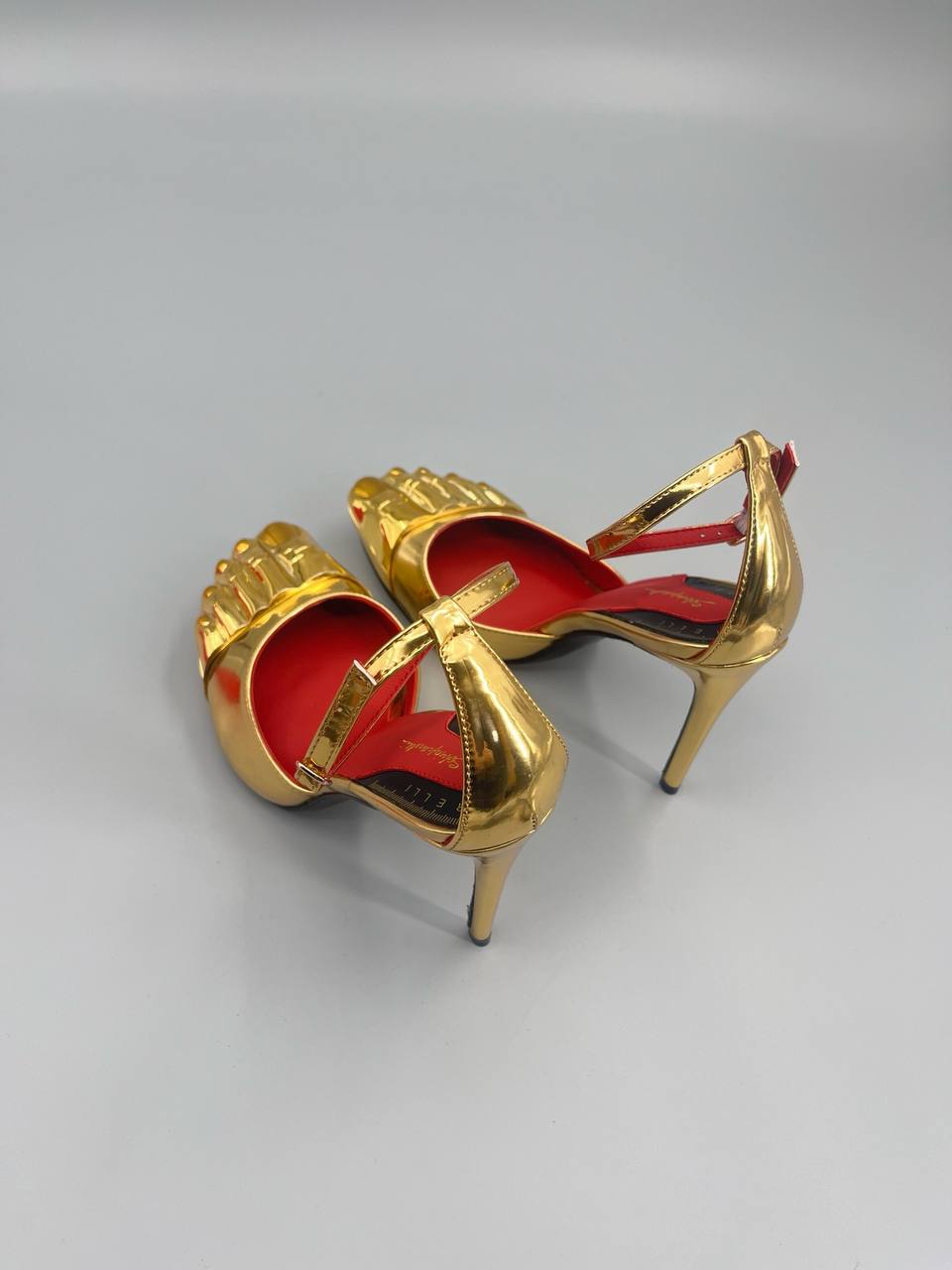 Изысканные и в то же время летние, эти золотые атласные туфли из лёгкого золотистого ПВХ, который повторяет форму стопы, не утяжеляя её. Открытый, воздушный крой и каблук высотой 105 мм подчёркивают изгиб ноги.