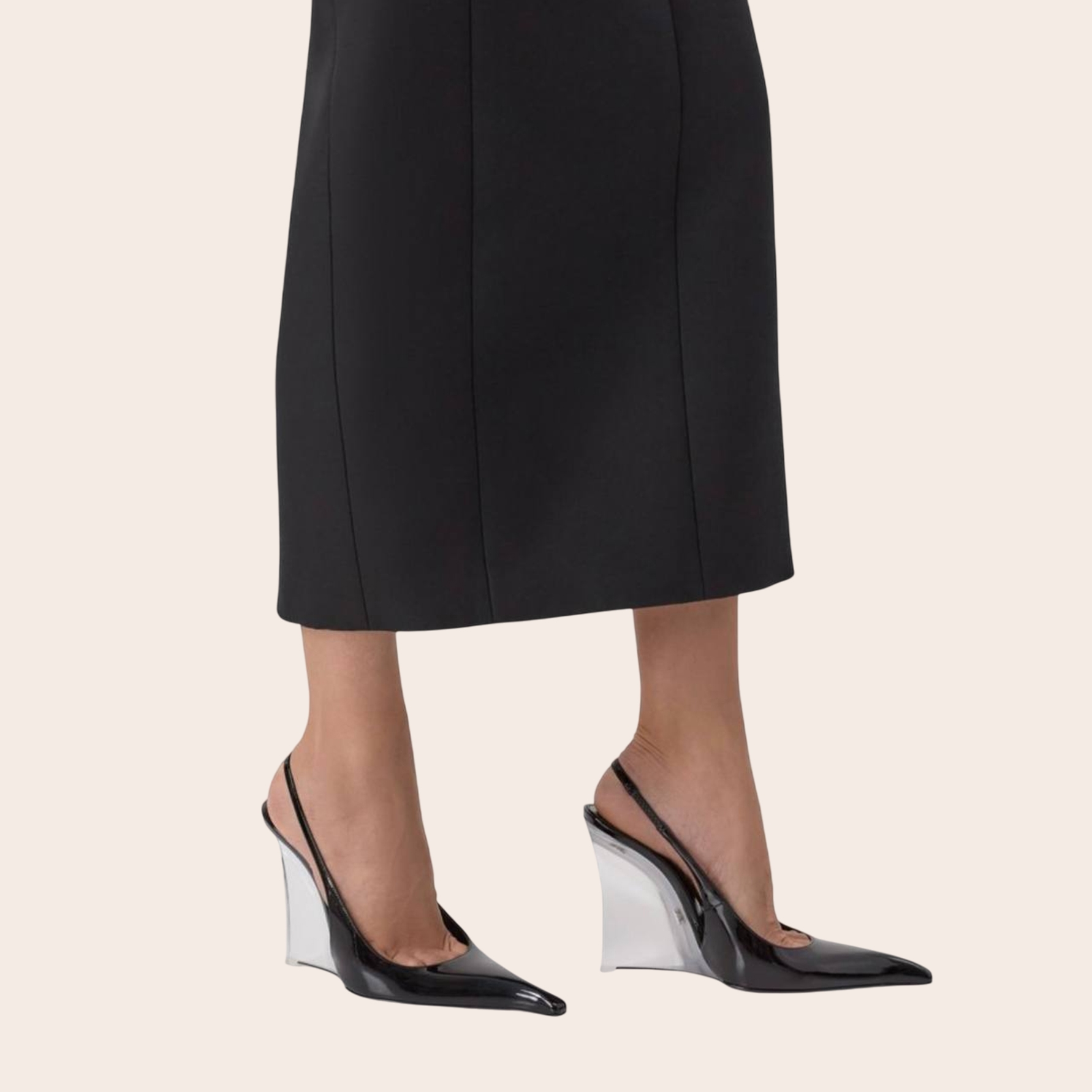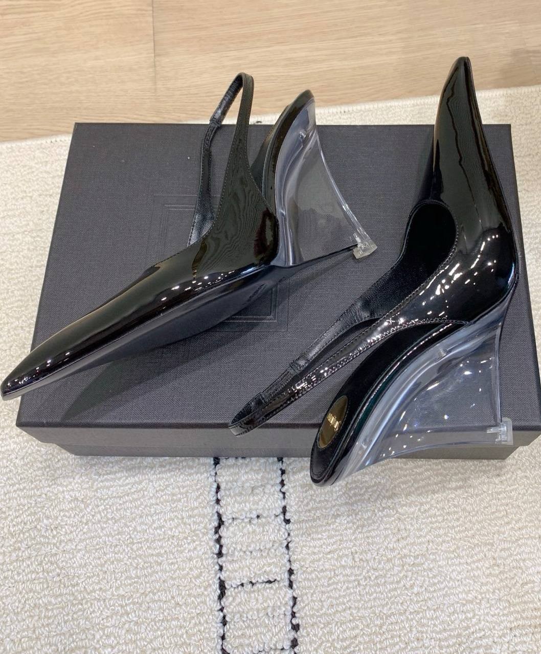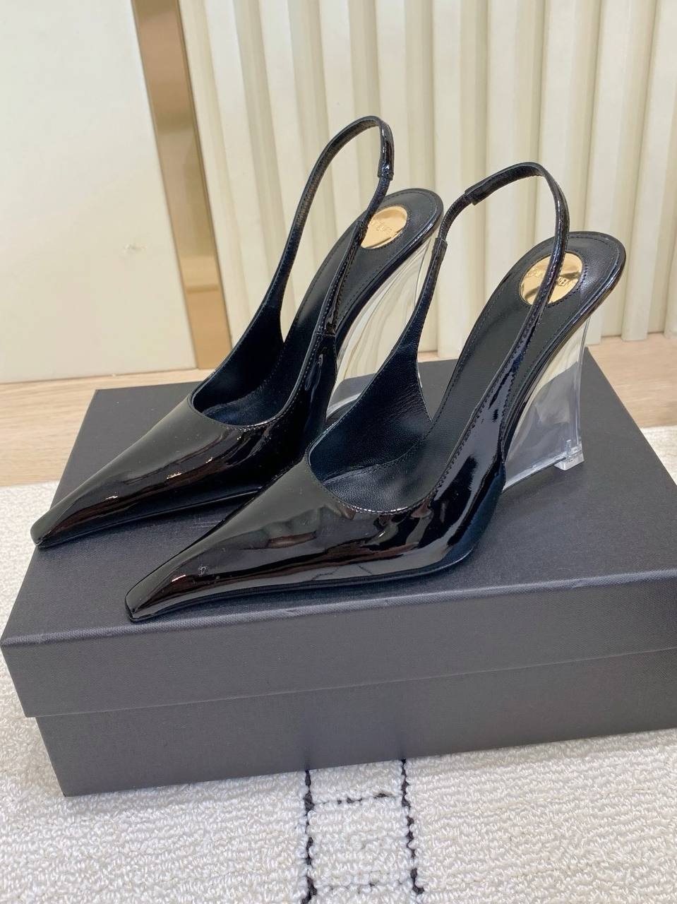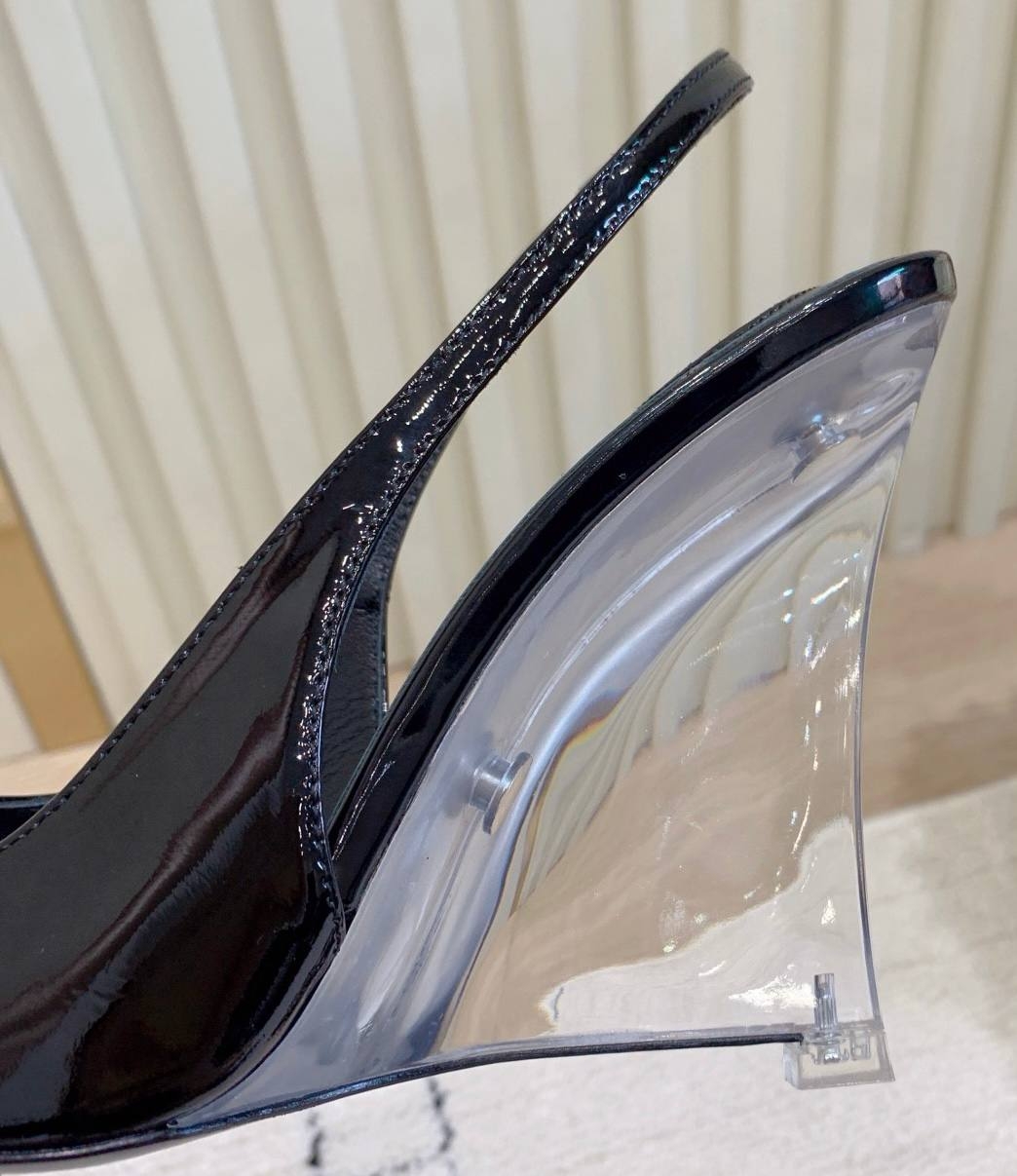 Туфли-лодочки Miller от Saint Laurent на прозрачном каблуке-танкетке высотой 10,5 см подчеркнут вашу уникальность в сочетании с платьями миди и укороченными брюками. Они изготовлены в Италии из глянцевой лакированной кожи, имеют удлиненный квадратный носок и эластичные ремешки.