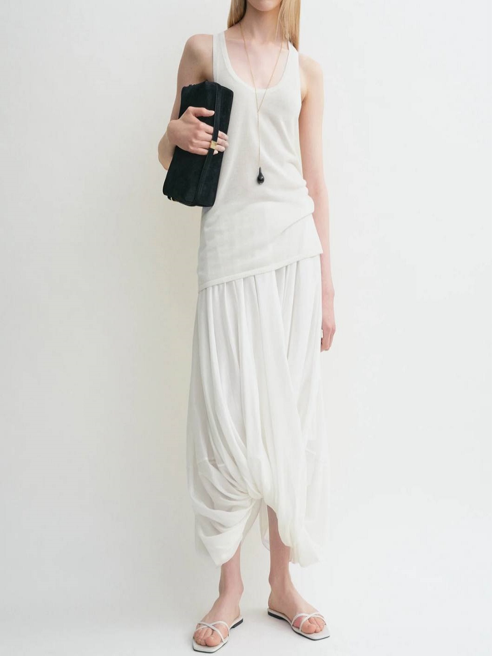 Скульптурное платье с подиума из коллекции TOTEME Summer 25. Оно сшито из прозрачной ткани в виде искусно наложенных друг на друга и скрученных панелей, создающих потрясающий силуэт кокона. Носите его летом с майкой.