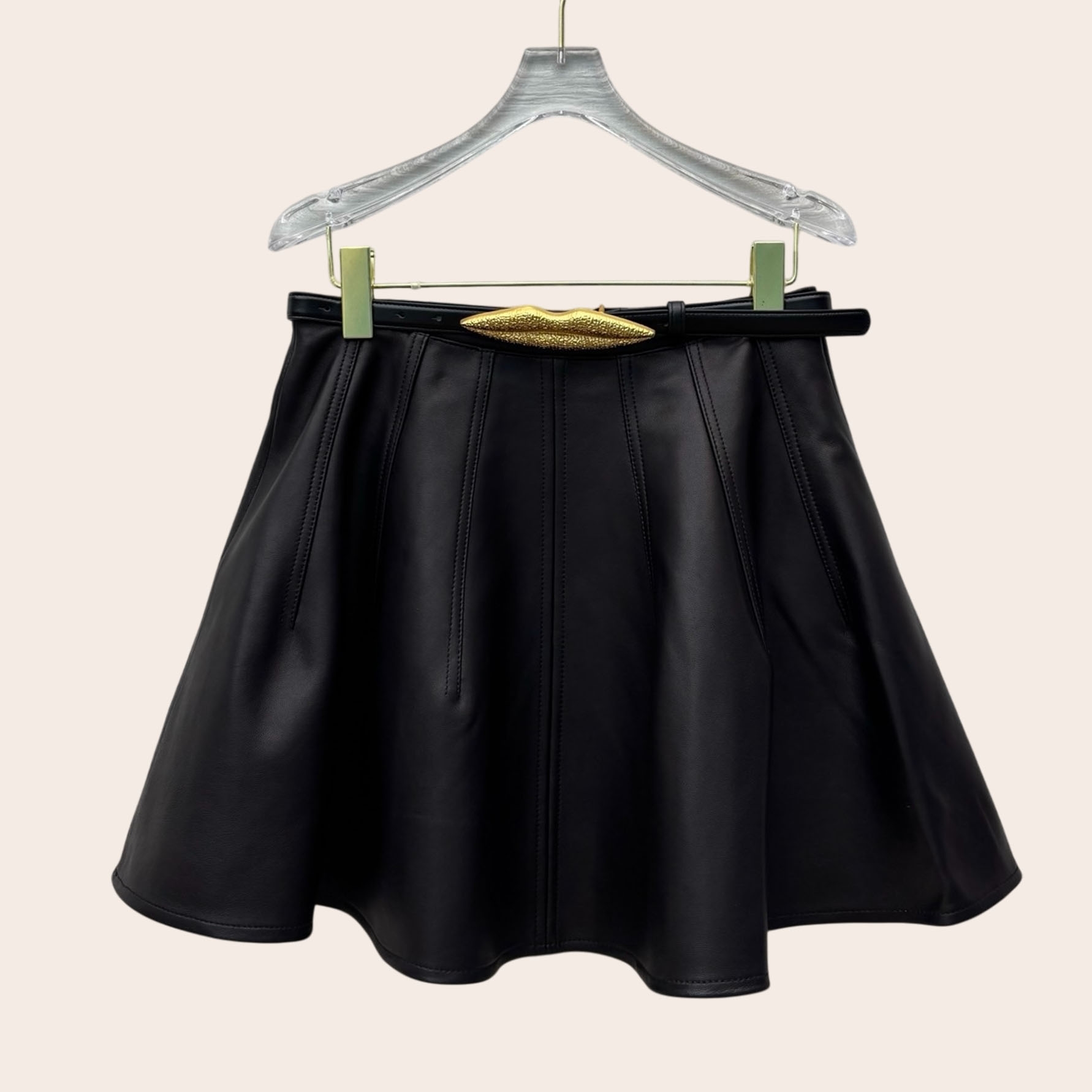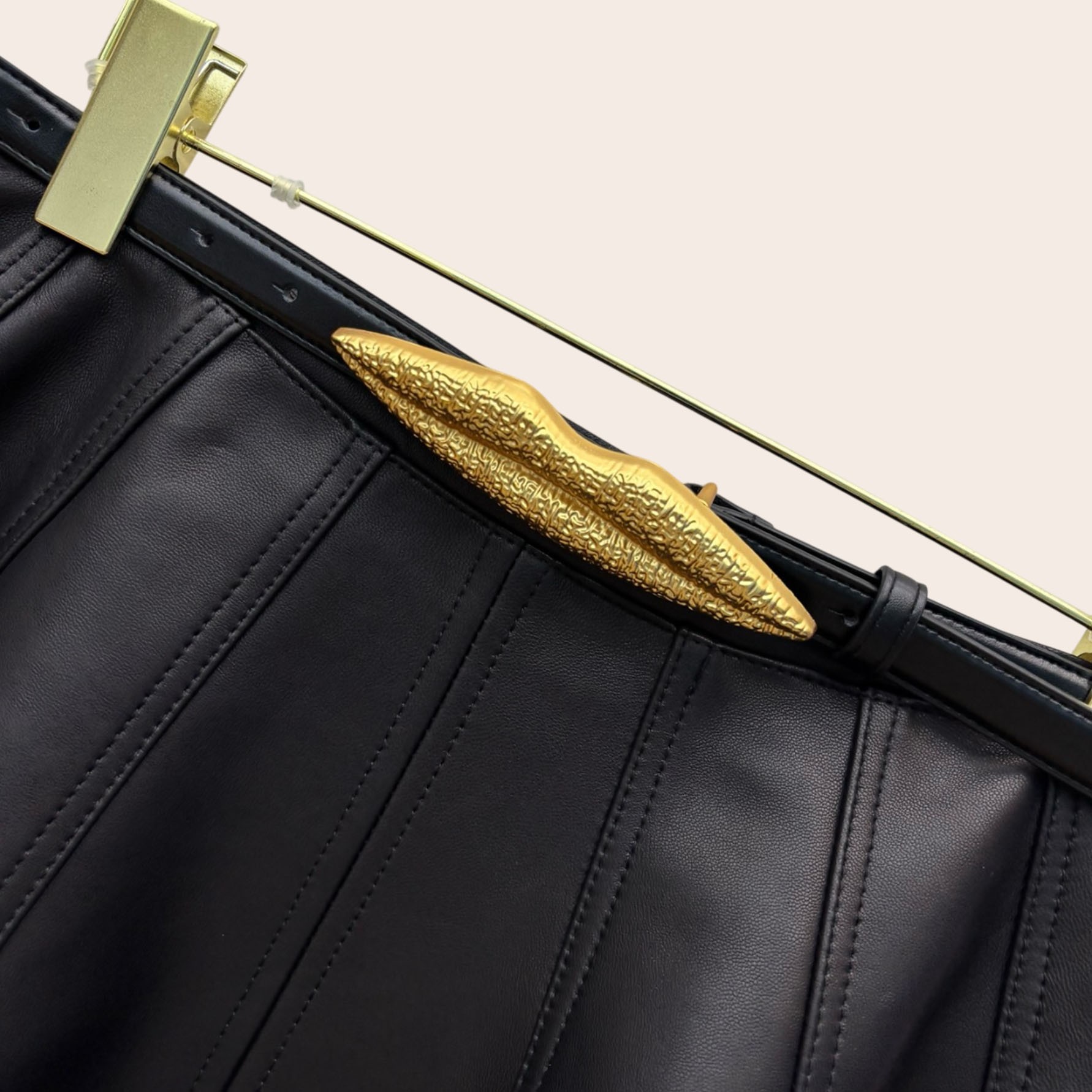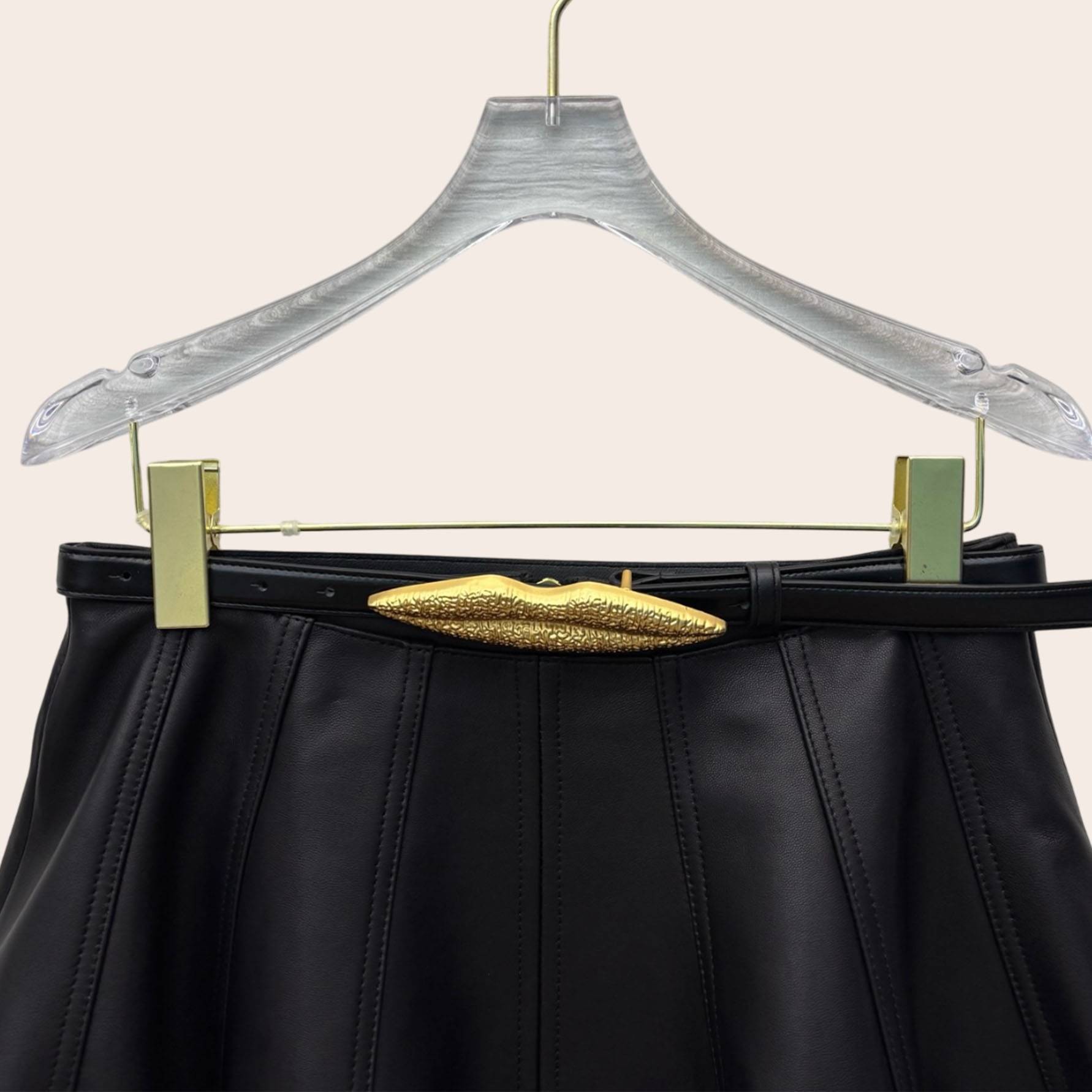 Новинка коллекции 2025 кожаная мини-юбка от Schiaparelli выполнена в черном цвете. Модель с высокой посадкой имеет легкий низ и украшена золотыми губами на поясе.
