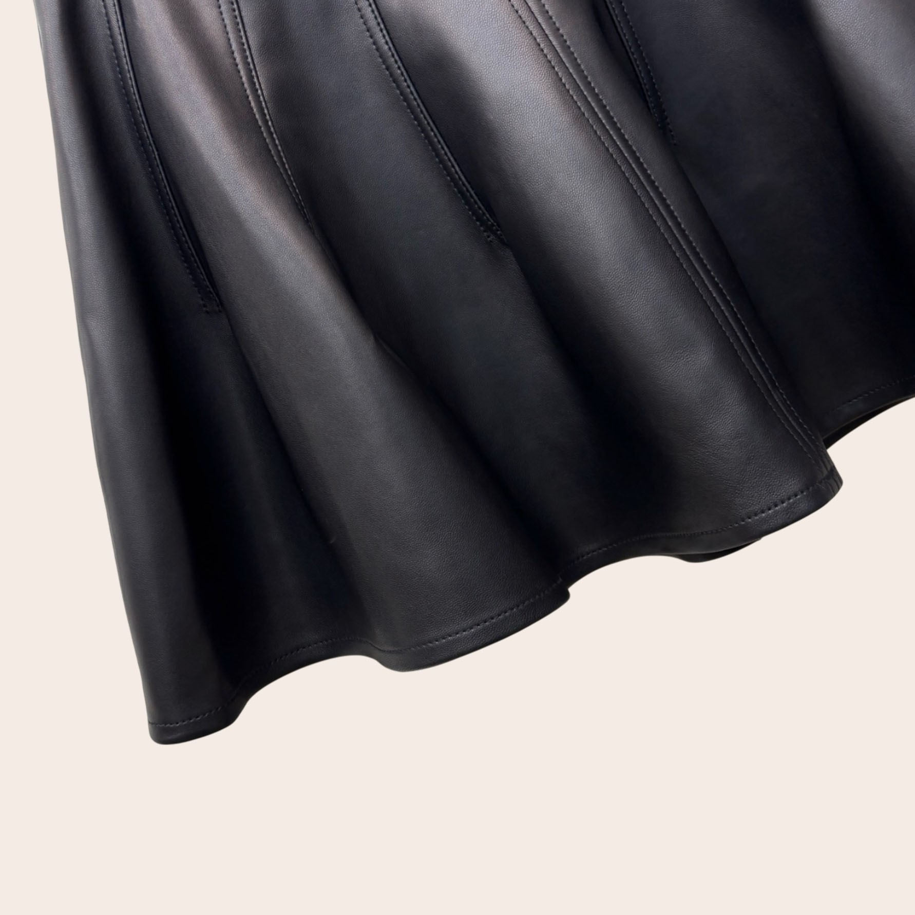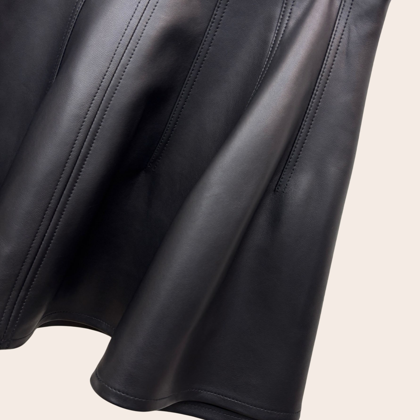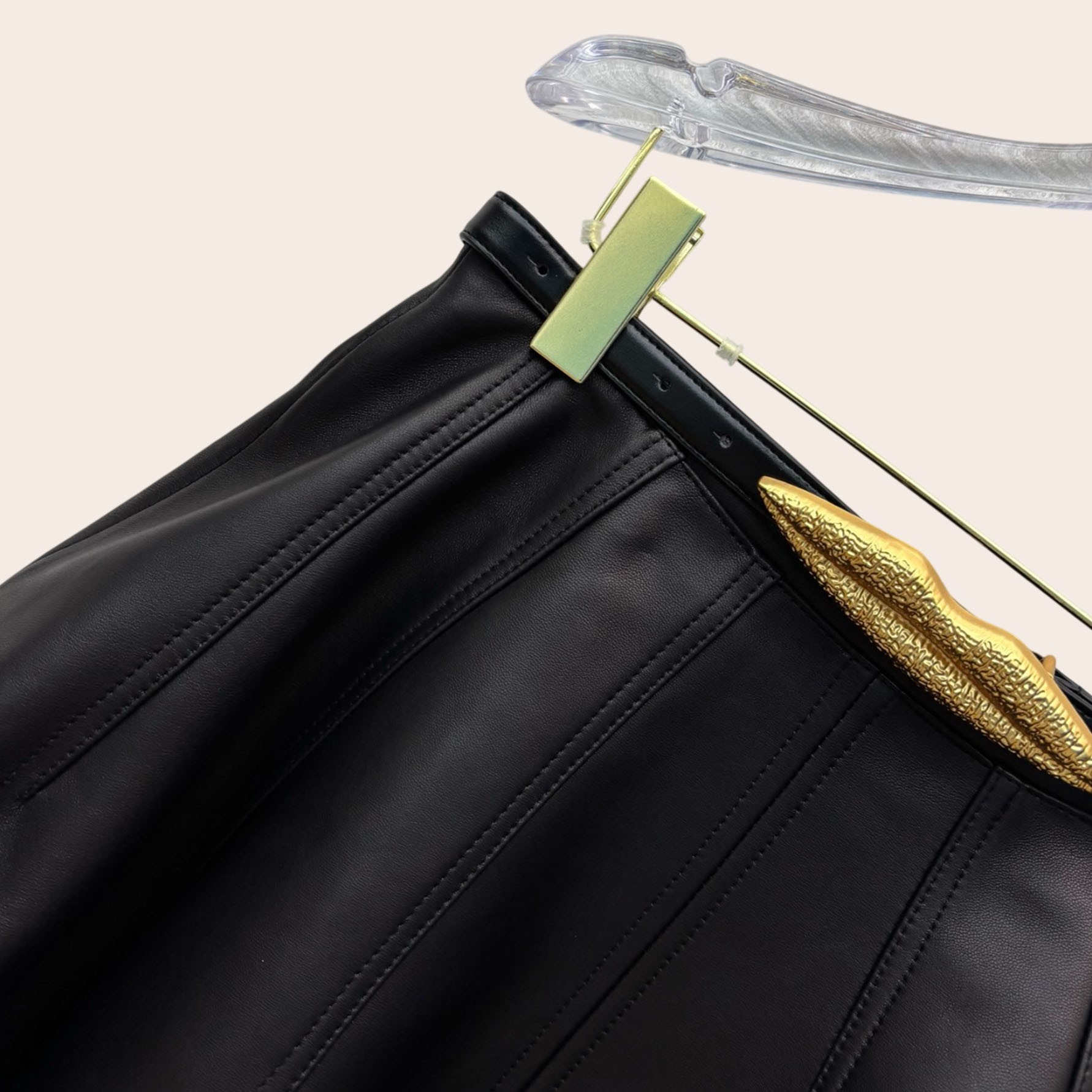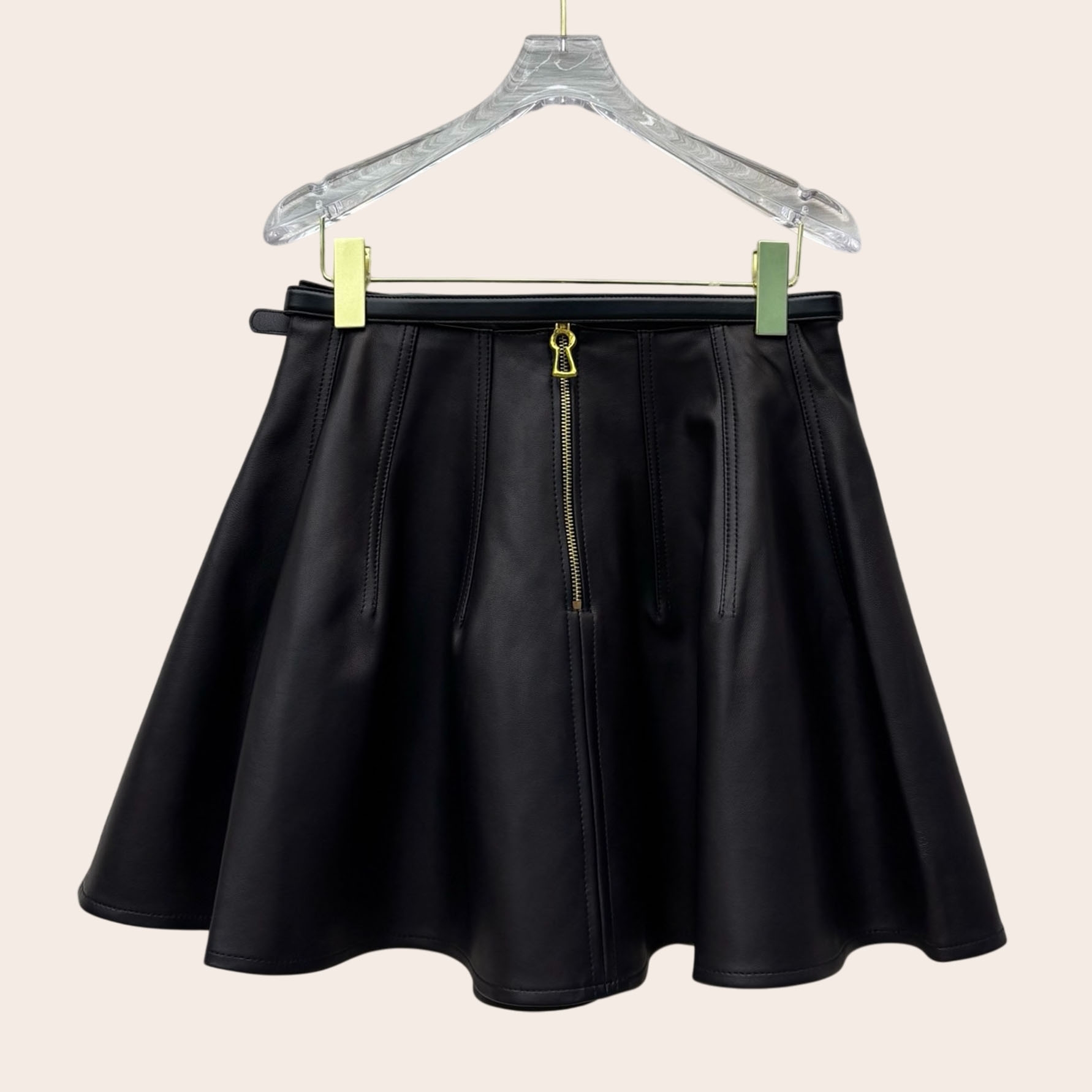 Новинка коллекции 2025 кожаная мини-юбка от Schiaparelli выполнена в черном цвете. Модель с высокой посадкой имеет легкий низ и украшена золотыми губами на поясе.