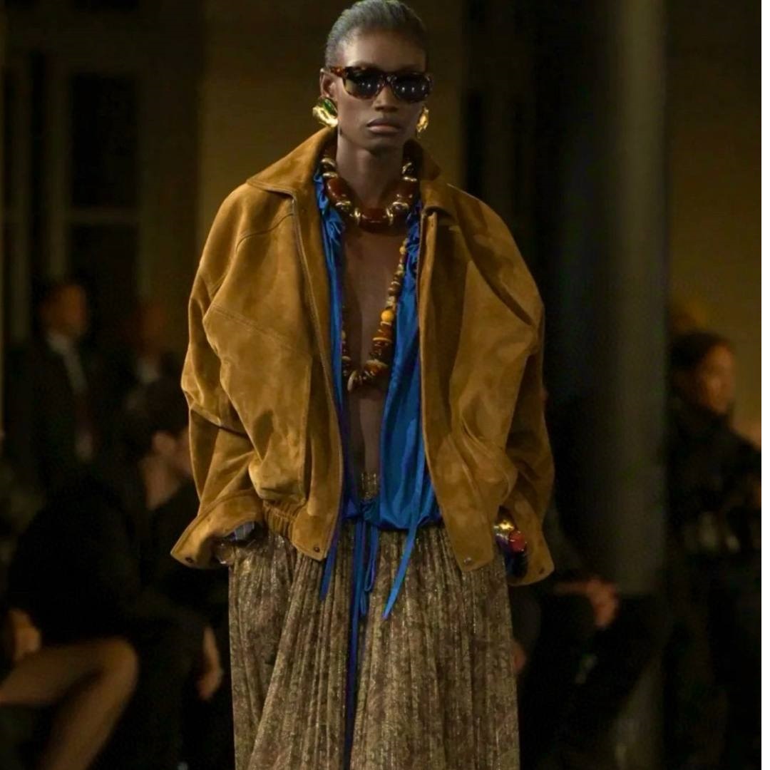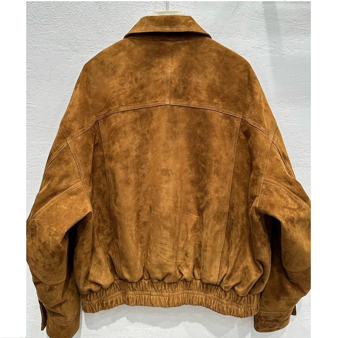 Коллекция SAINT LAURENT Весна 25 отдает дань уважения основателю дома, предлагая свежие интерпретации моделей, которые он носил в 80-х. Дебютировавшая на подиуме, эта куртка в стиле авиатора выполнена из замши свободного кроя с эластичным подолом и аккуратным воротником. Вы можете легко сочетать ее с строгим покроем или женственными платьями.