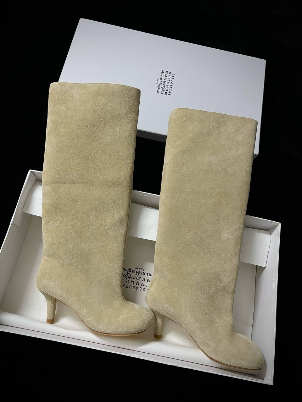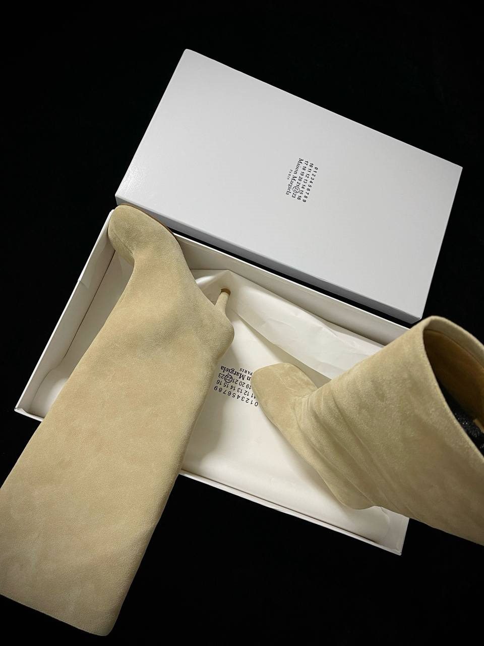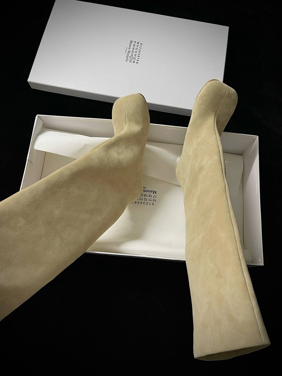 Сапоги Maison Margiela сделаны из натуральной замши. Замшевые сапоги на каблуке с квадратным носком. Купить данную модель можно в двух цветах: бежевый, черный.