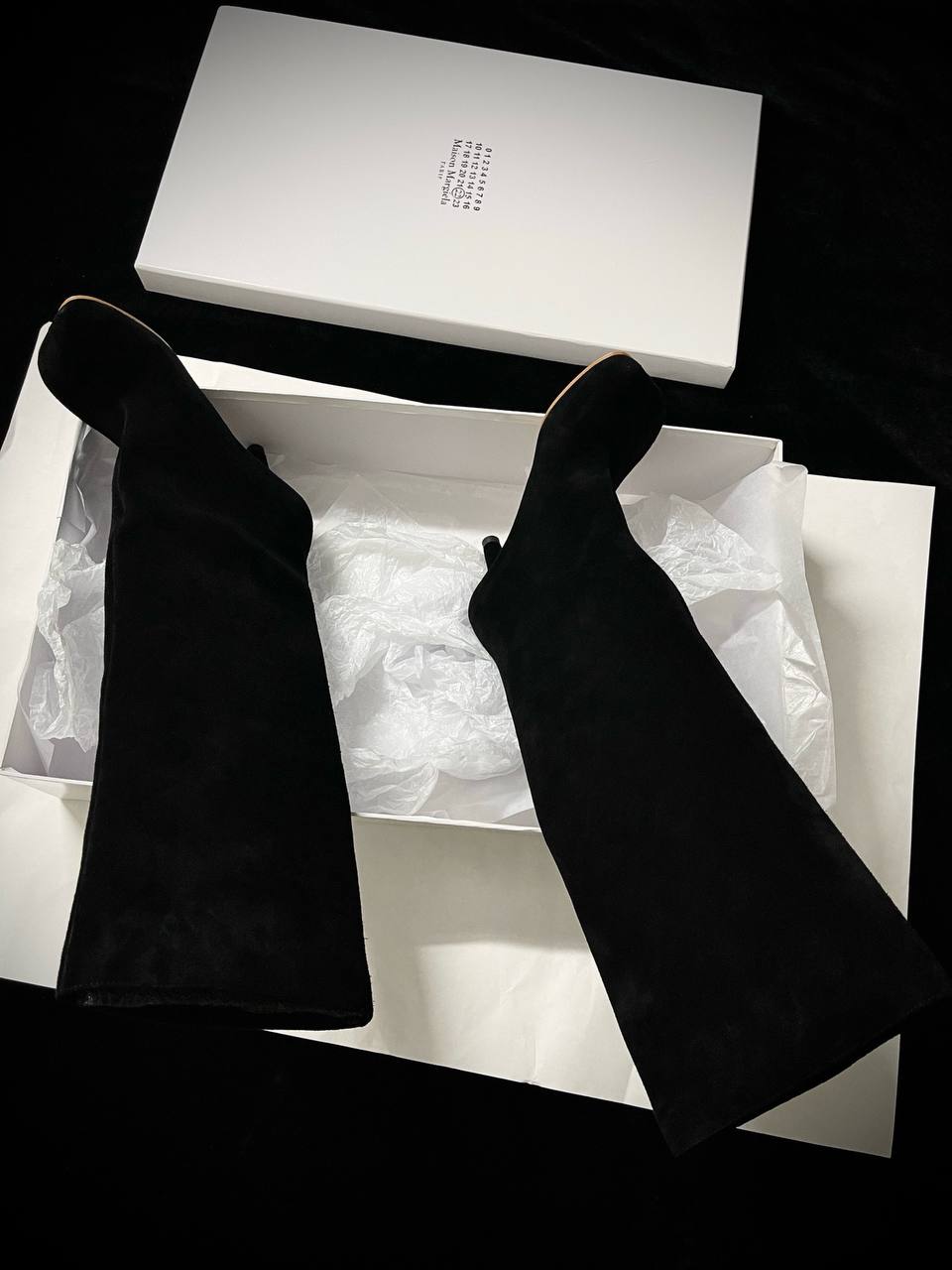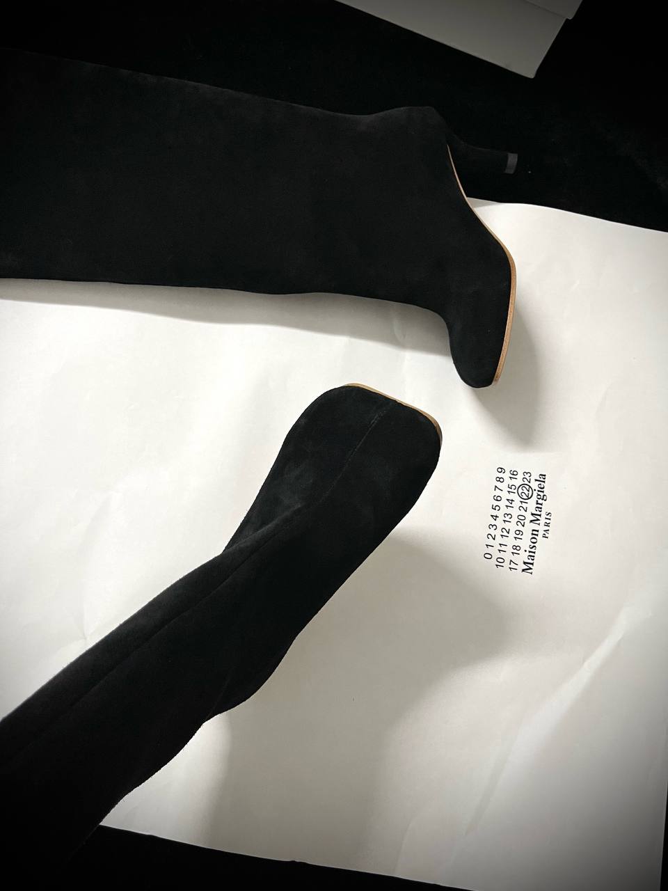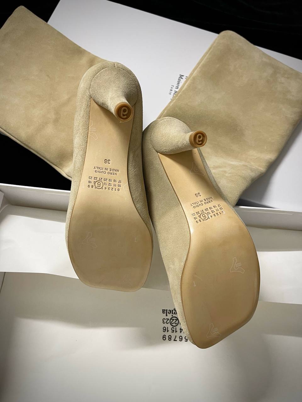 Сапоги Maison Margiela сделаны из натуральной замши. Замшевые сапоги на каблуке с квадратным носком. Купить данную модель можно в двух цветах: бежевый, черный.